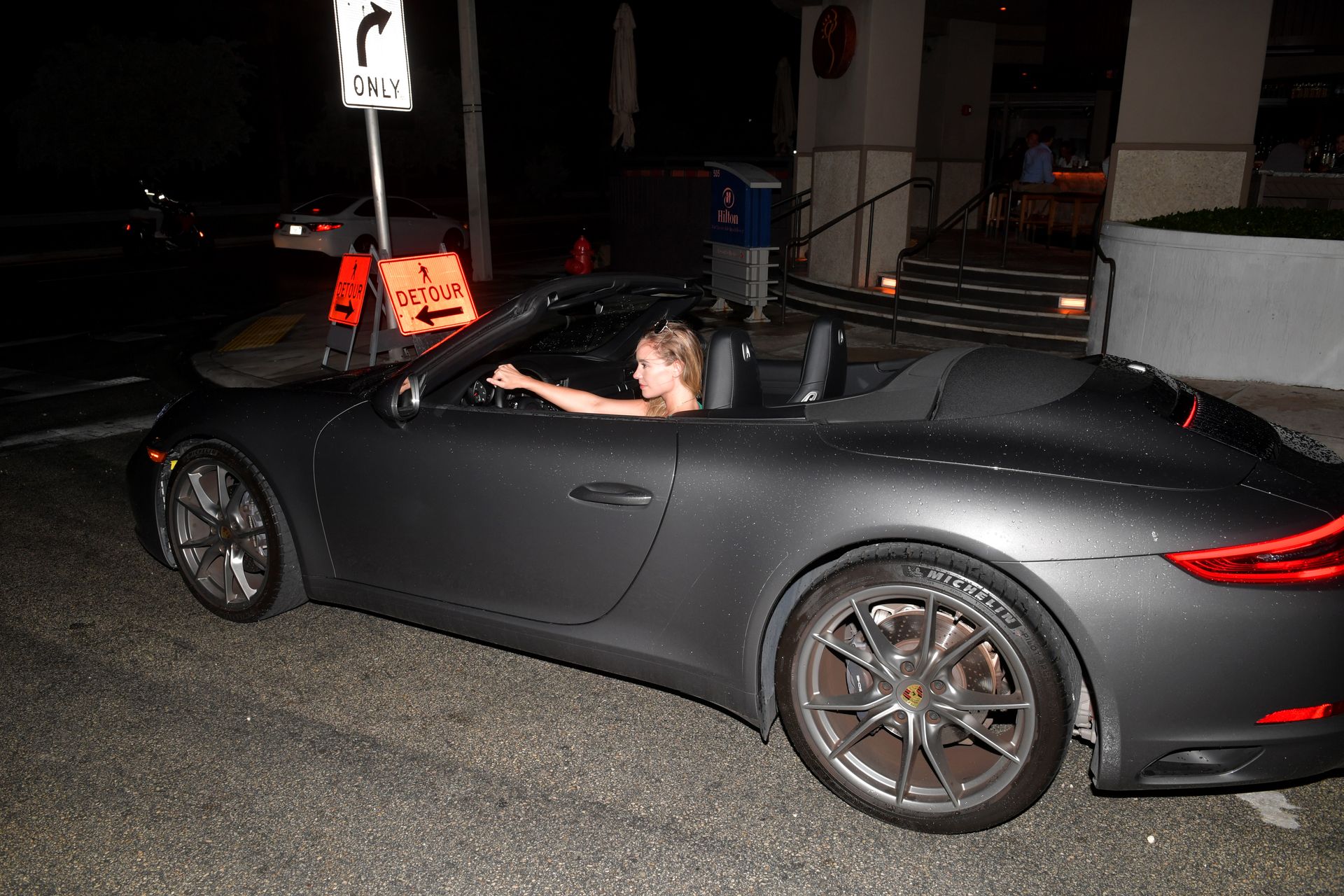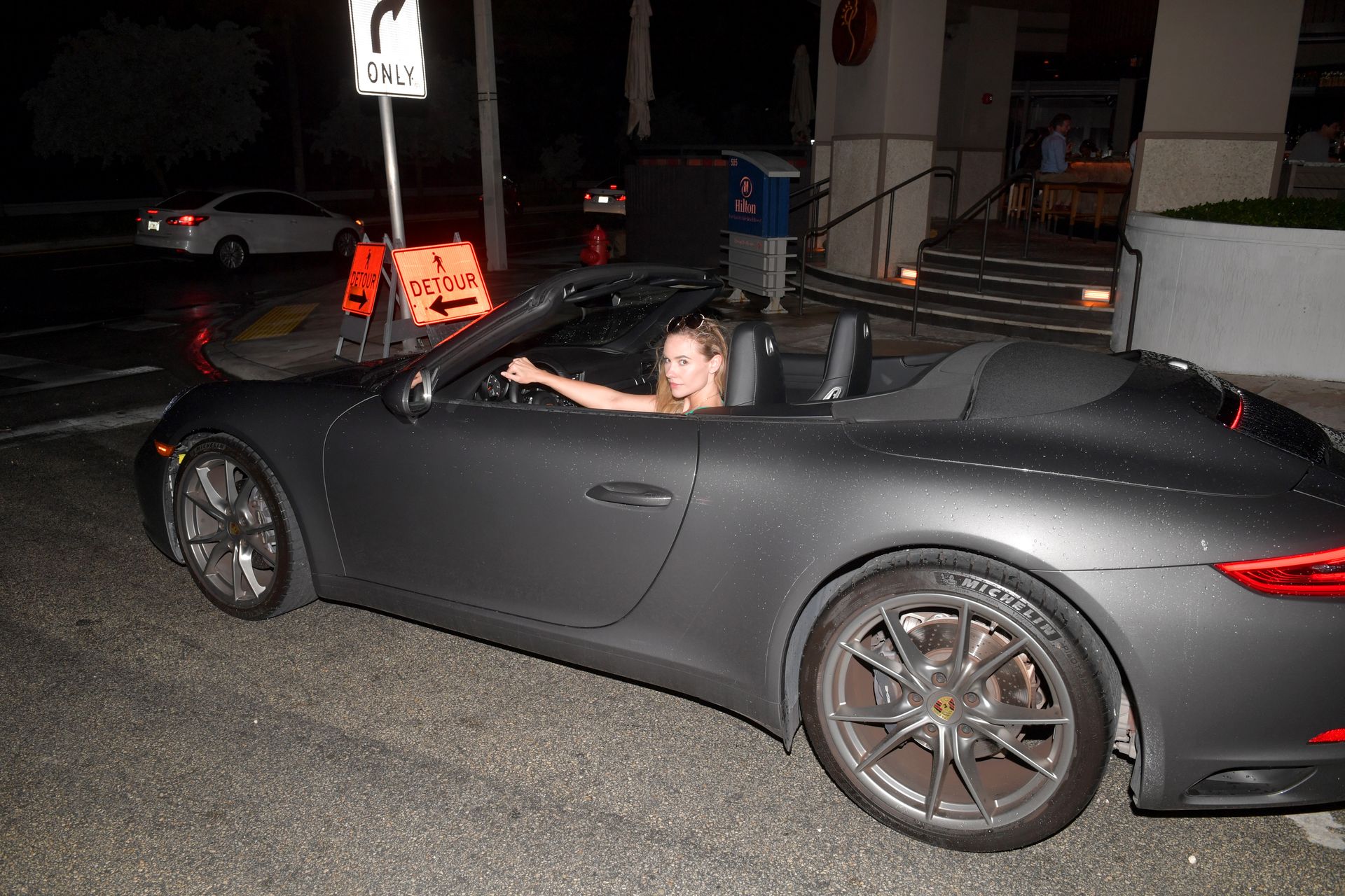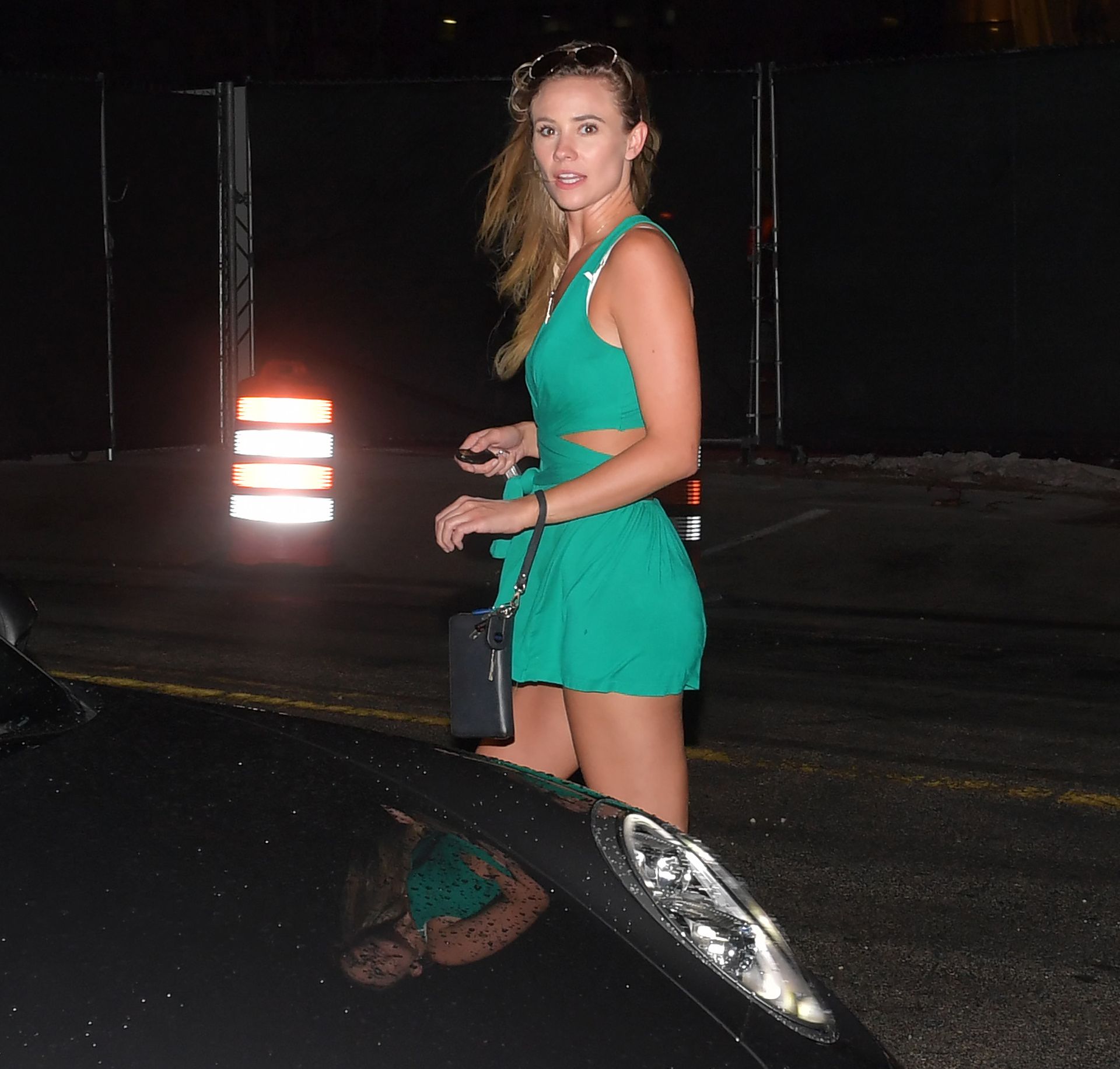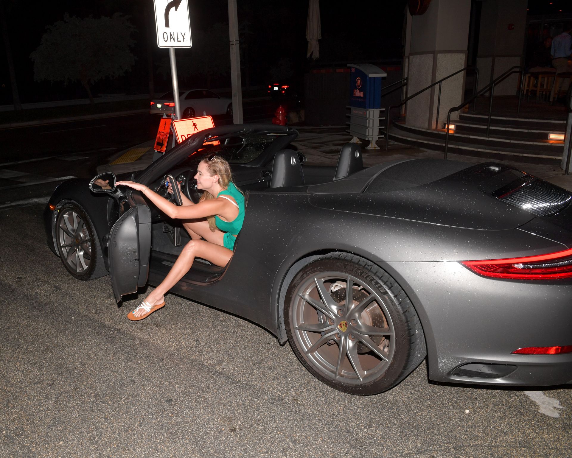 Estrella porno de la Iglesia Mormona y mascota de Penthouse de junio de 2019 y chica de portada de mayo/junio Addie Andrews sale de su Porsche con sus largas piernas y aspecto de supermodelo, vistiendo un lindo vestido de sol color teal mientras toma una bebida rápida con amigos en un bar local el 24 de octubre de 2019 en Miami Beach, Florida.