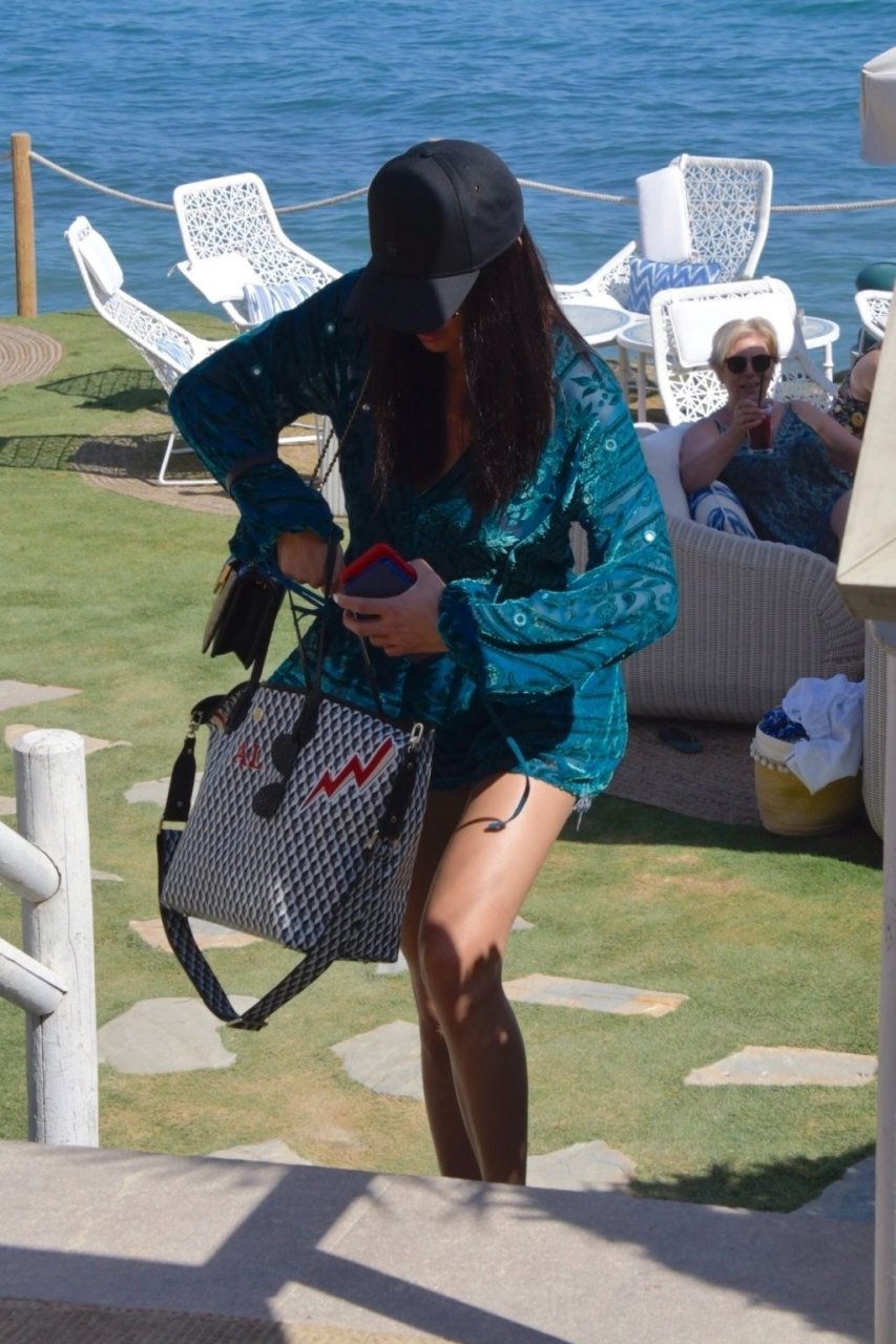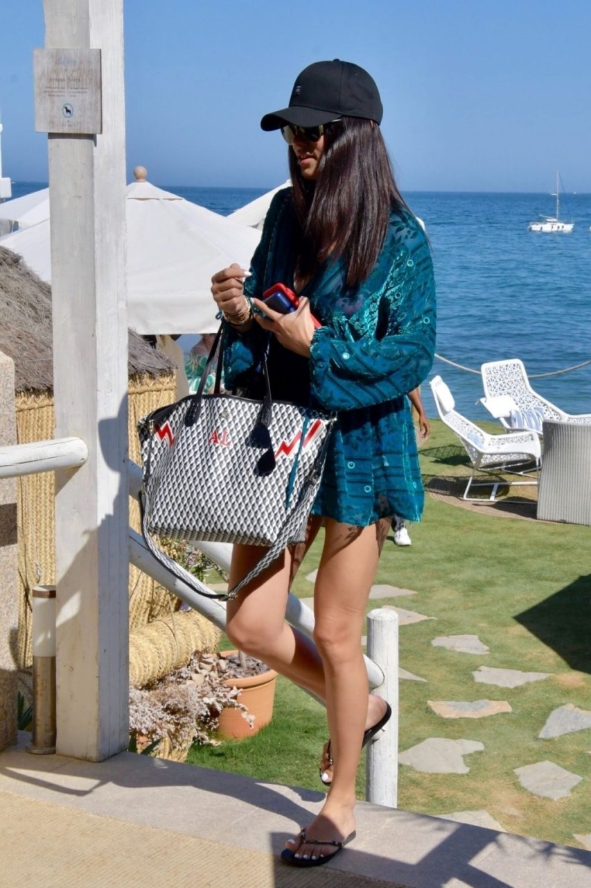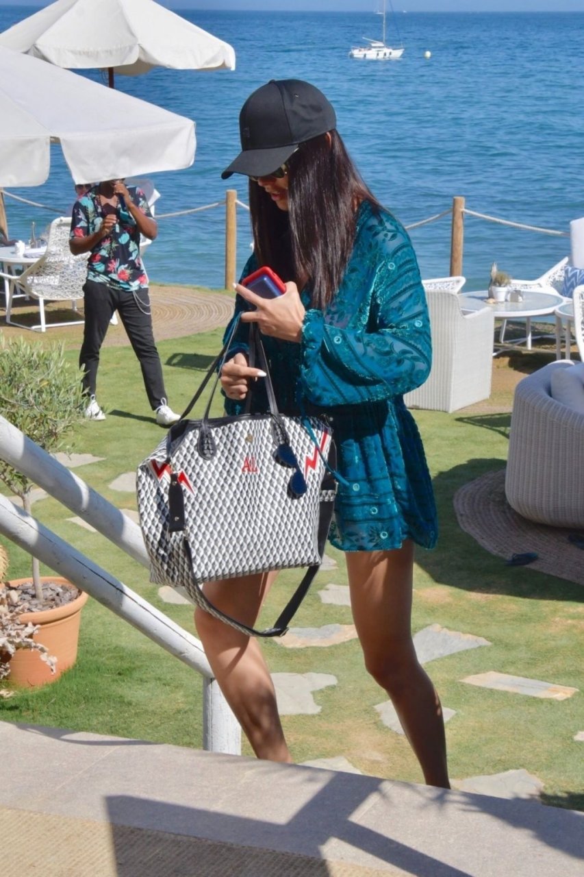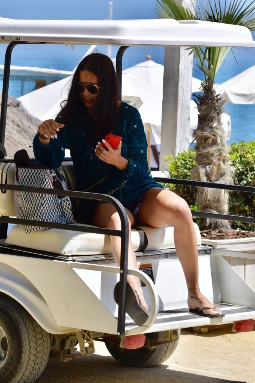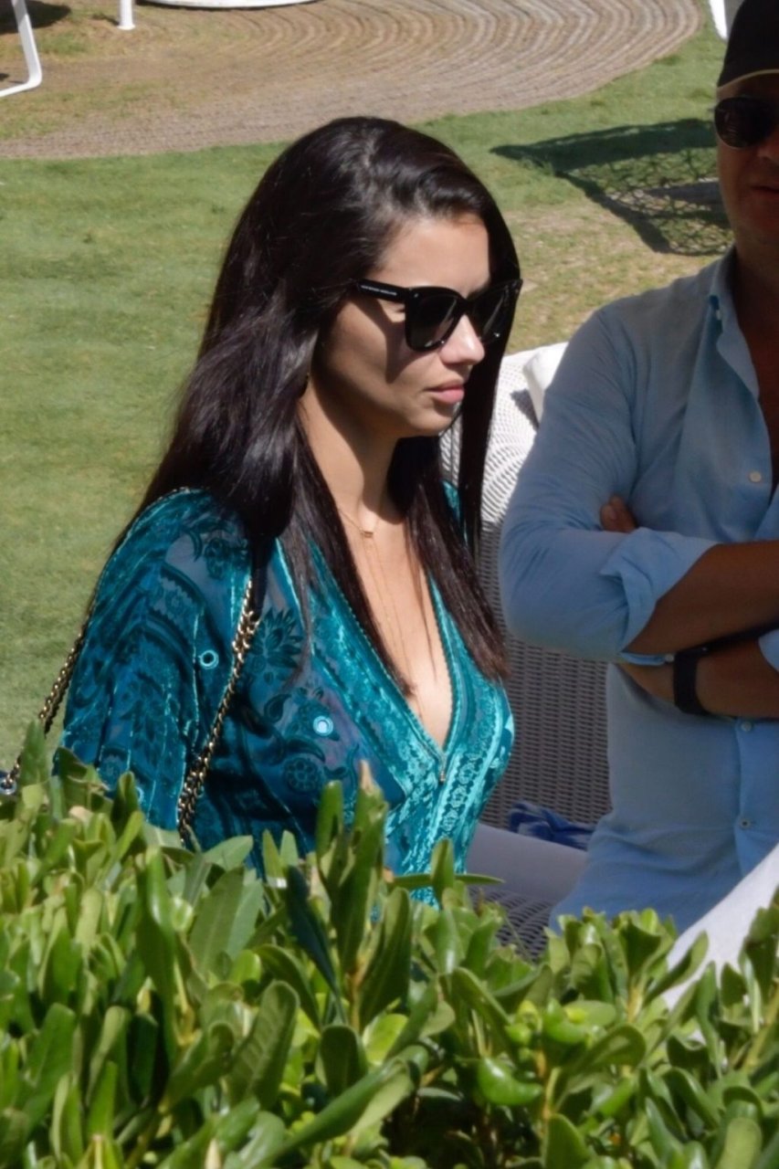 Model Adriana Lima disfruta de sus vacaciones en un club de playa en Marbella, 29/07/2019. Adriana luce genial con un vestido mini azul como cubierta mientras se la ve disfrutando del sol.