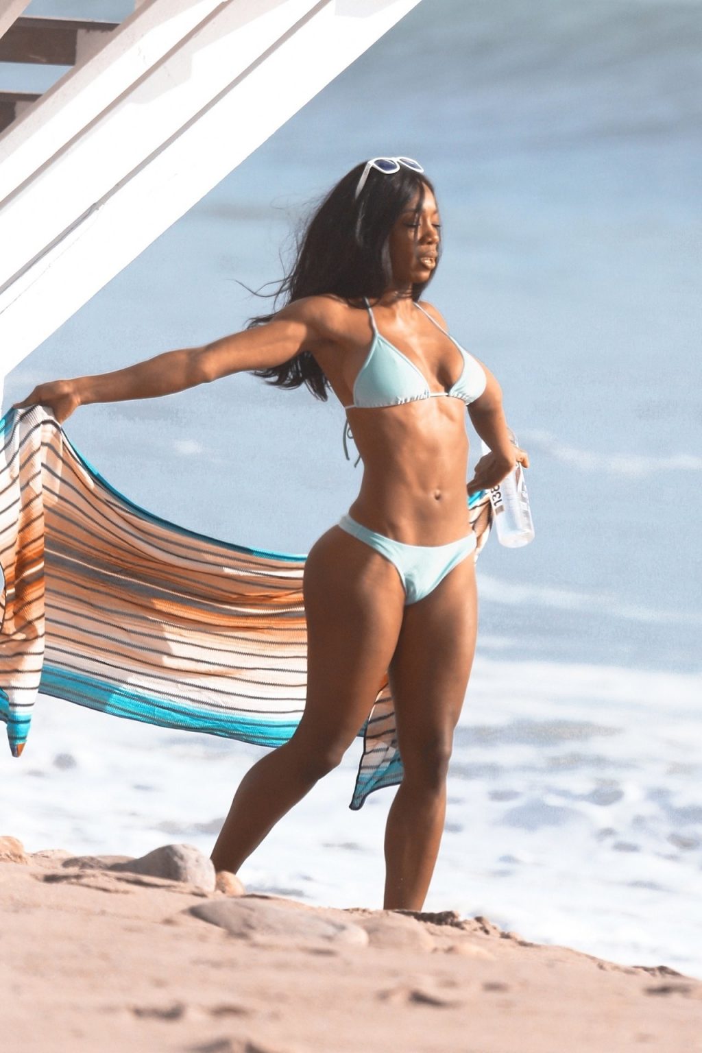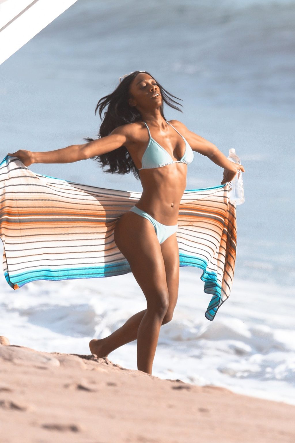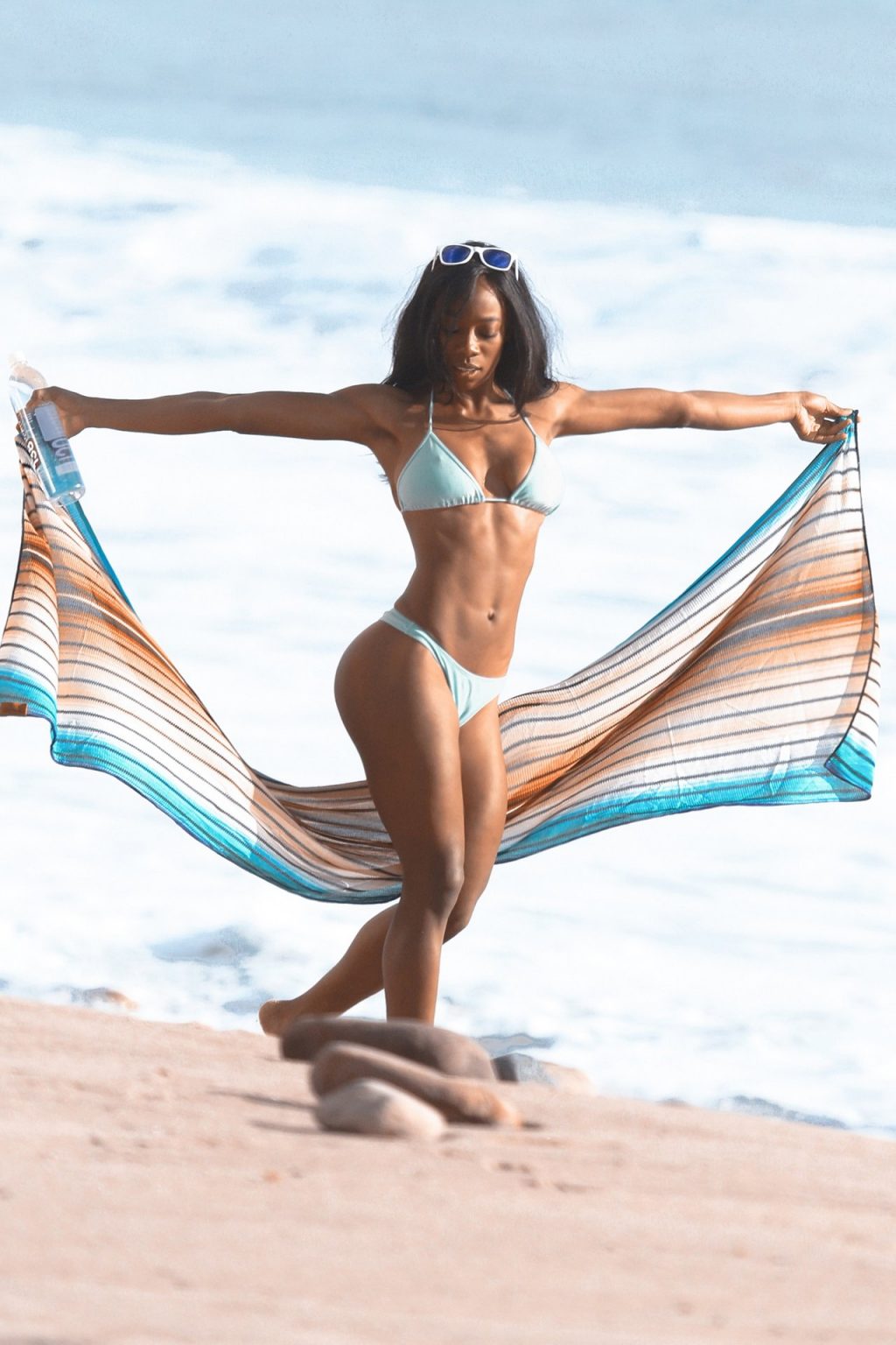Modelo de Los Ángeles y gurú del fitness Adrianne Nina muestra su cuerpo curvilíneo en bikini en el set de una sesión de fotos de 138 Water en Malibu, 10/12/2019.