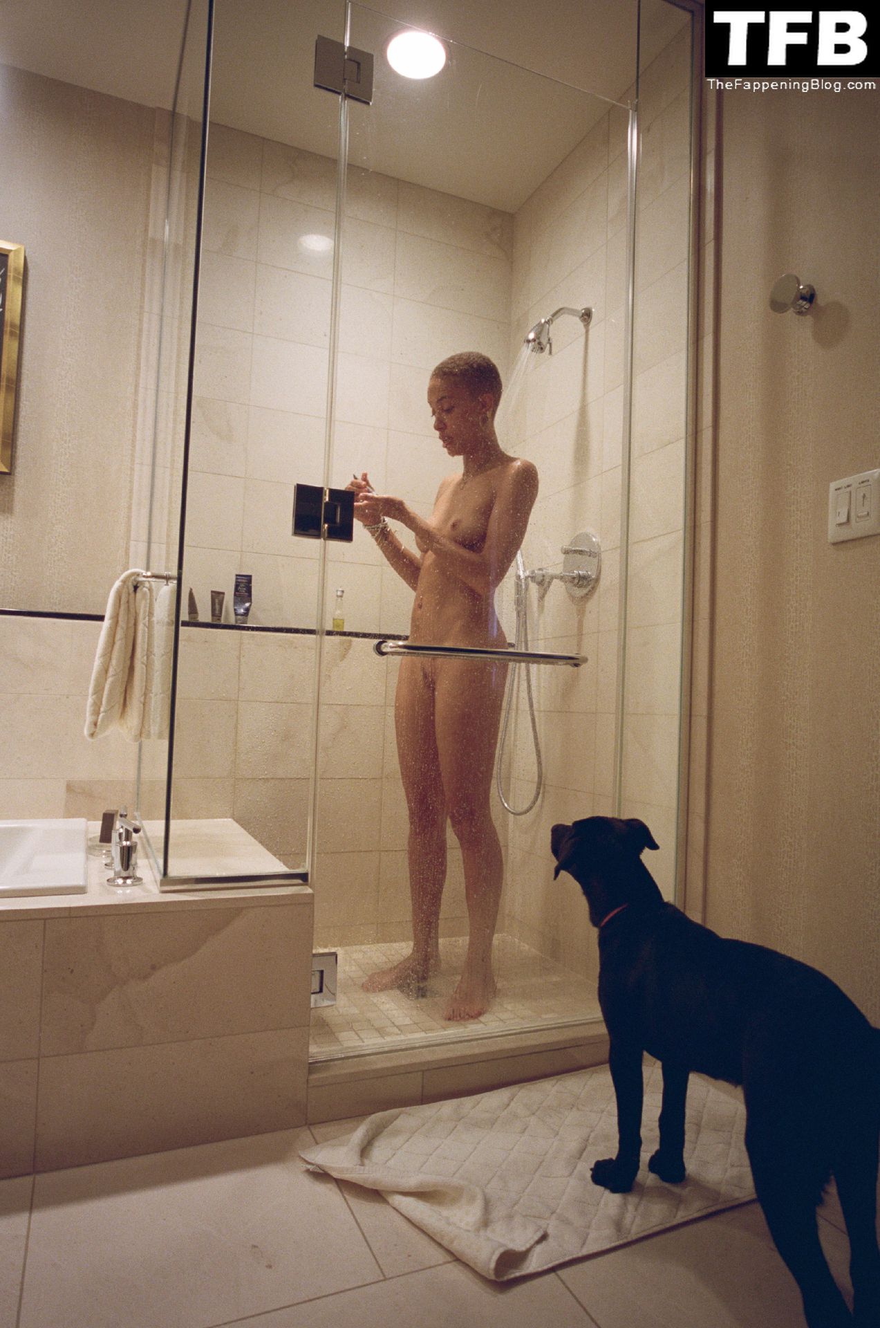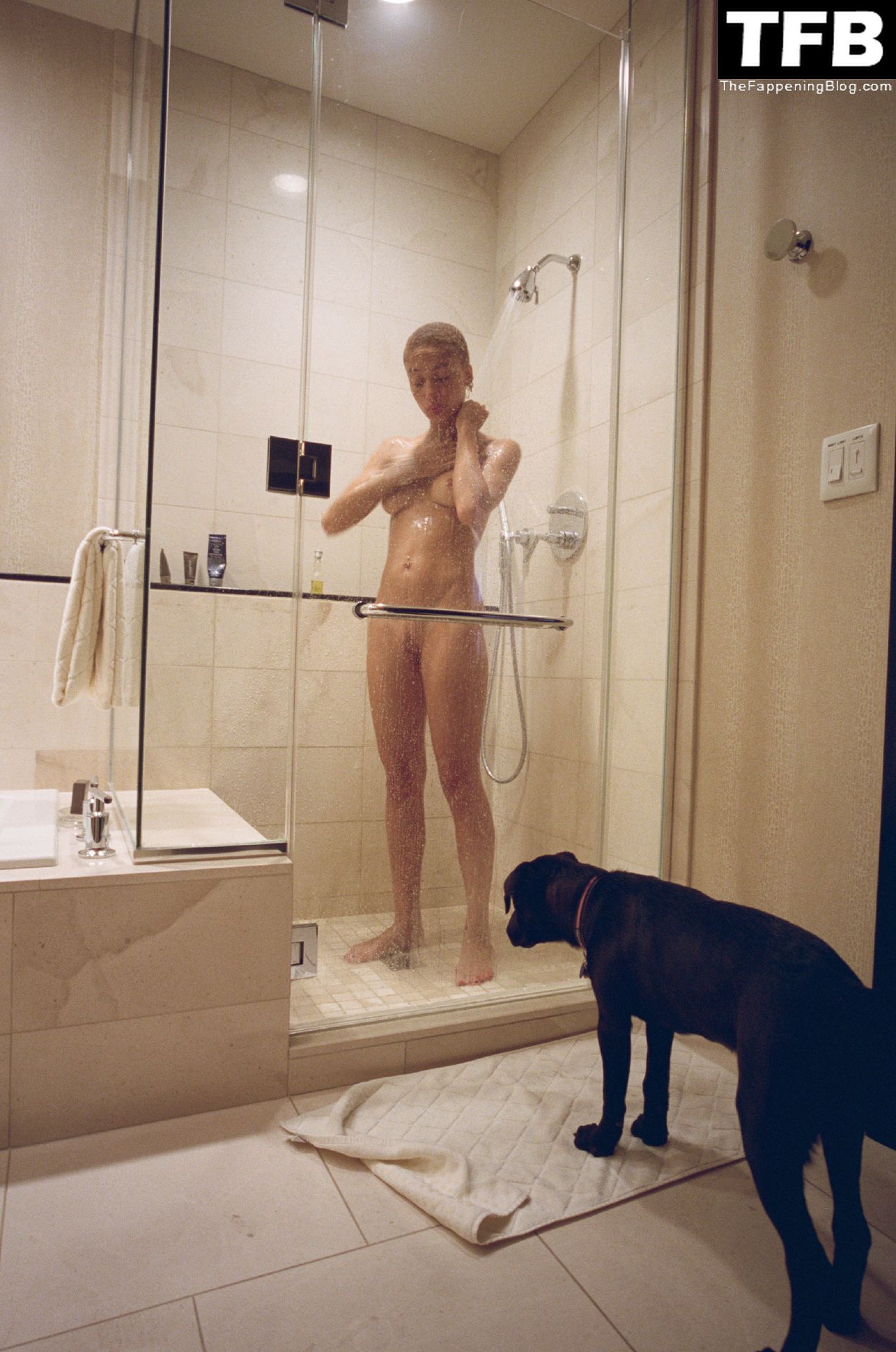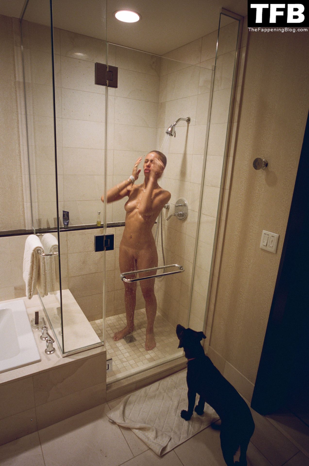 ¿Por qué coño tiene un perro mirándola mientras está desnuda o duchándose? Esto dice mucho de cosas enfermas que están a punto de pasar…