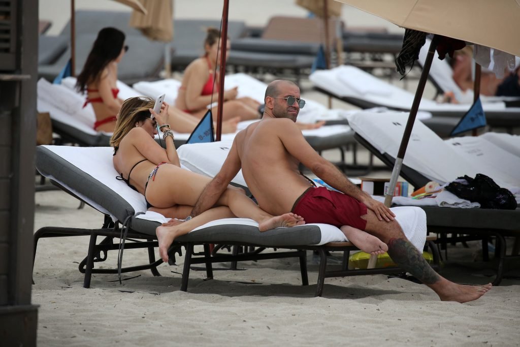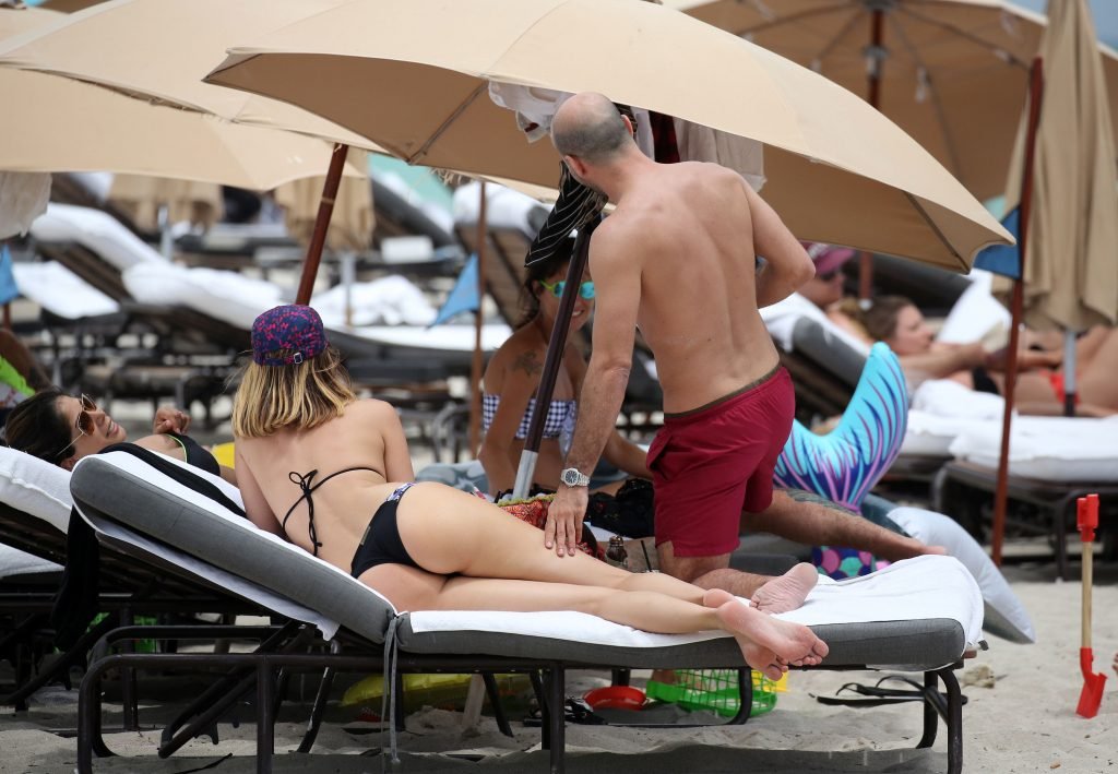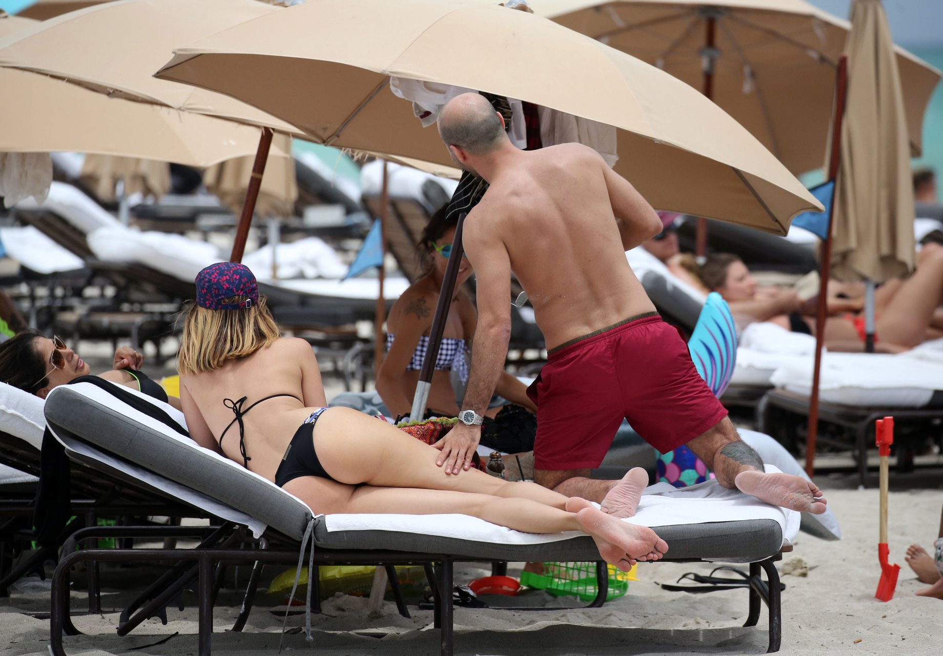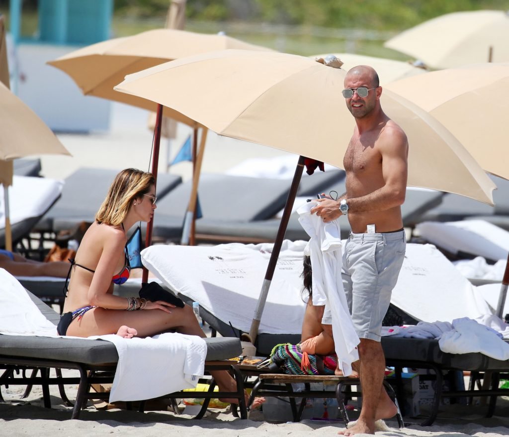 Aida Yespica, de 35 años, vestida con bikini, muestra muestras públicas de afecto con su hombre Roger Jenkins en la playa de Miami, 01/05/2018. Aida fue vista divirtiéndose y soplando burbujas mientras estaba en la playa. Tiene un trasero súper redondo y pechos grandes. Aida María Yespica es una personalidad de televisión (Grande Fratello VIP), bailarina, modelo y actriz (Natale in crociera) de Barquisimeto, Venezuela. Aida aparece regularmente en programas de televisión sobre moda, publicidad como invitada o como presentadora.
