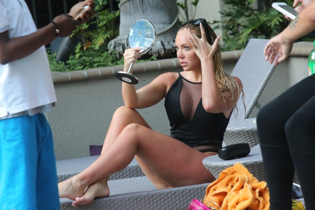 Aisleyne Horgan-Wallace deslumbra al sol sin camiseta junto a la piscina en Los Ángeles, 30/06/2017. Aisleyne Horgan-Wallace es una personalidad de la televisión reality, modelo, diseñadora, actriz, columnista de revista. Edad: 38.