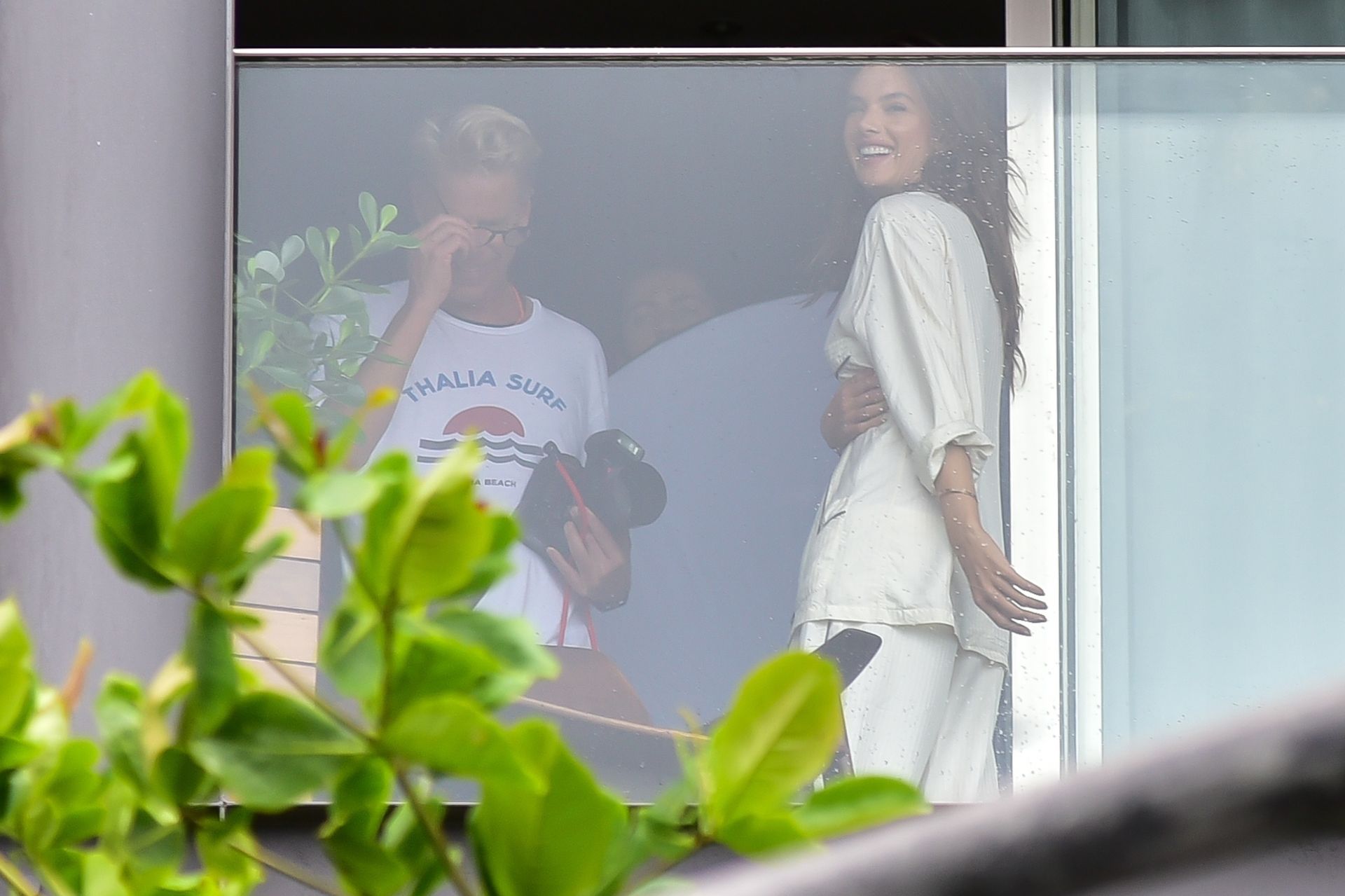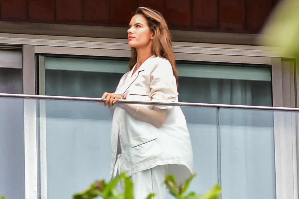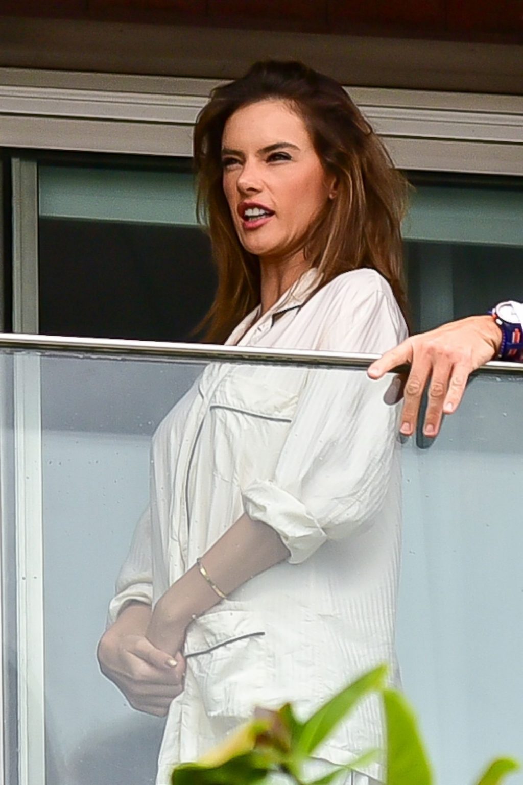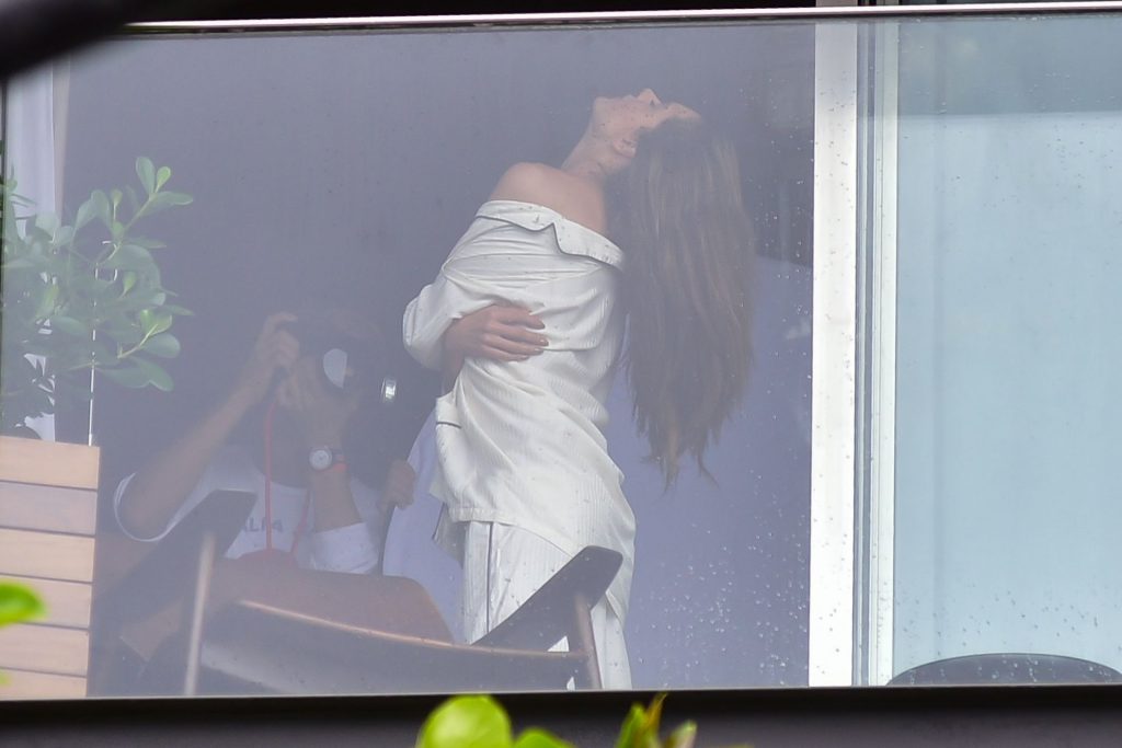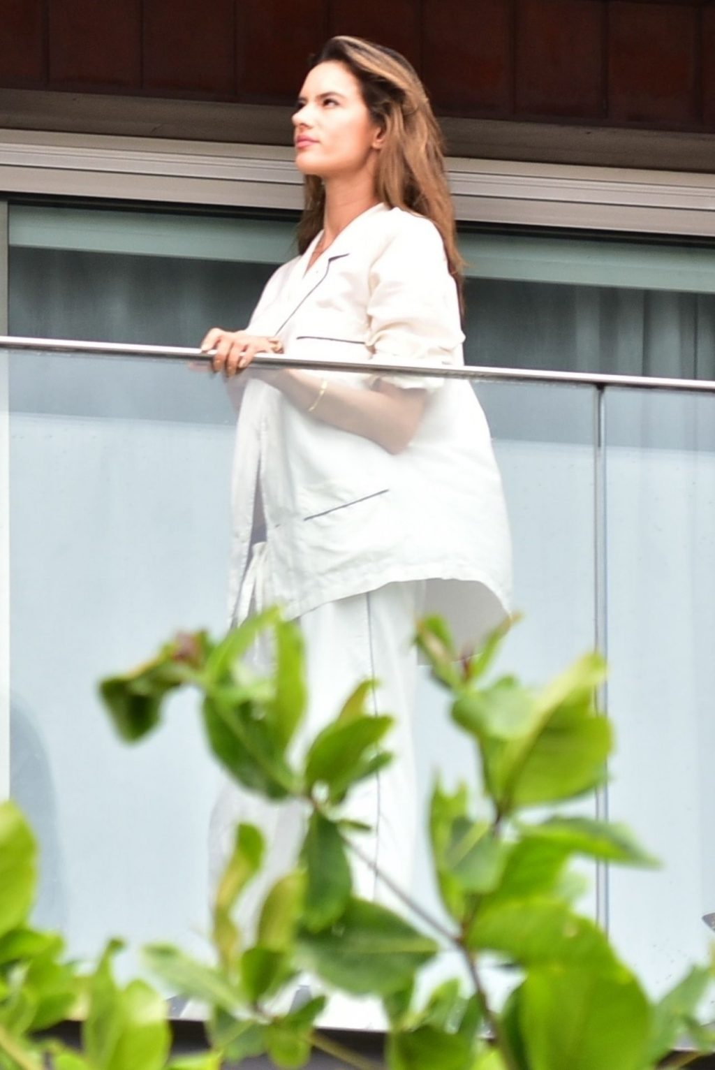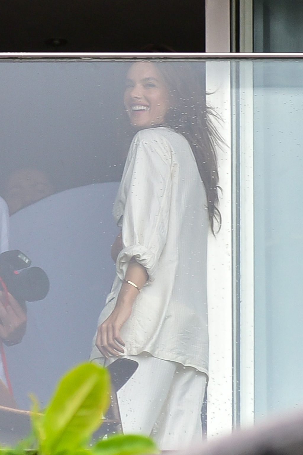 Alessandra Ambrosio tiene una sesión de fotos improvisada en un día lluvioso en el balcón de su hotel en Río de Janeiro, 27/02/2020. Alessandra no se avergüenza de mostrar algo de piel mientras luce solo una blusa de pijama, al mismo tiempo que revela lo que hay debajo. Estaba toda sonrisas mientras posaba para el fotógrafo privado.