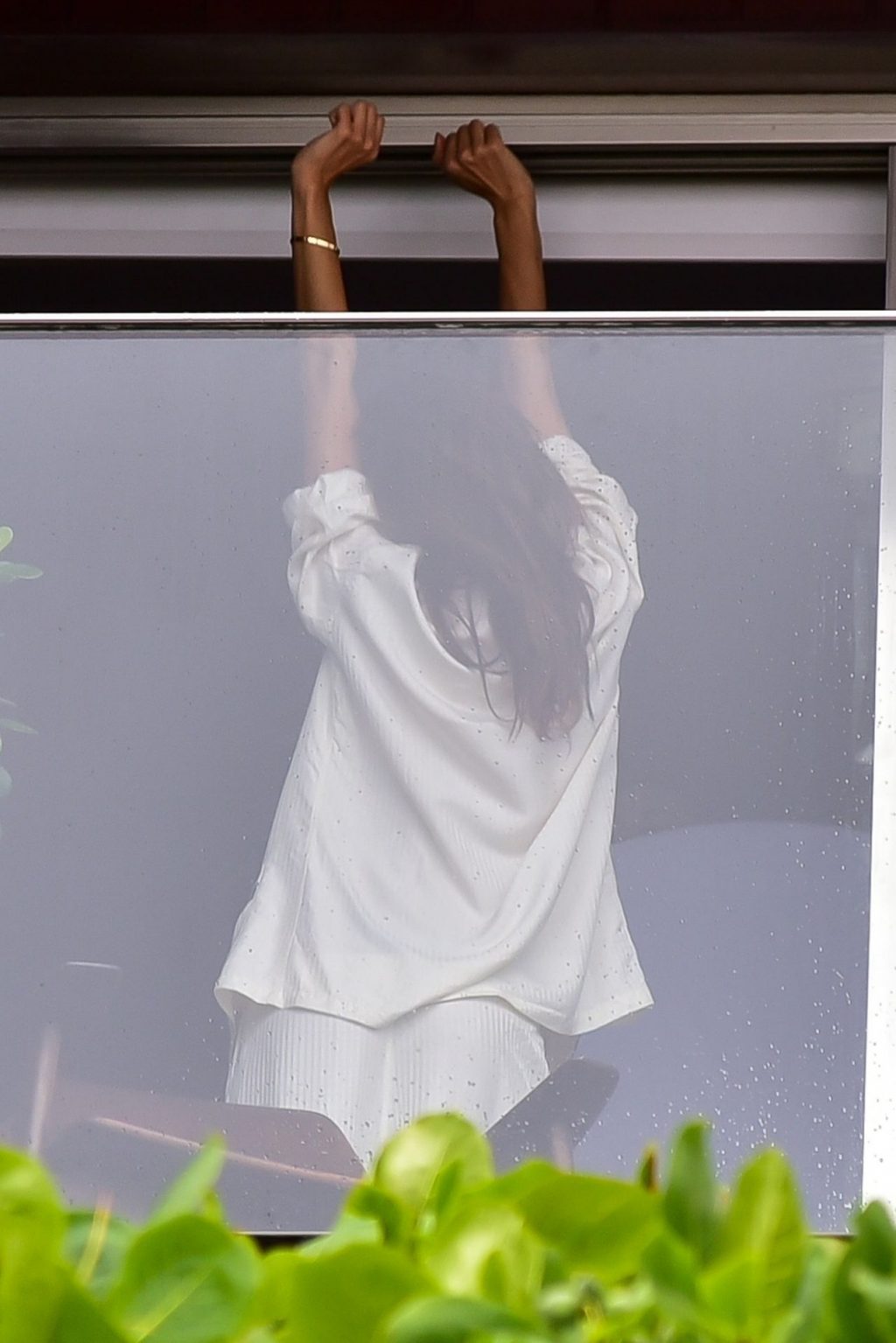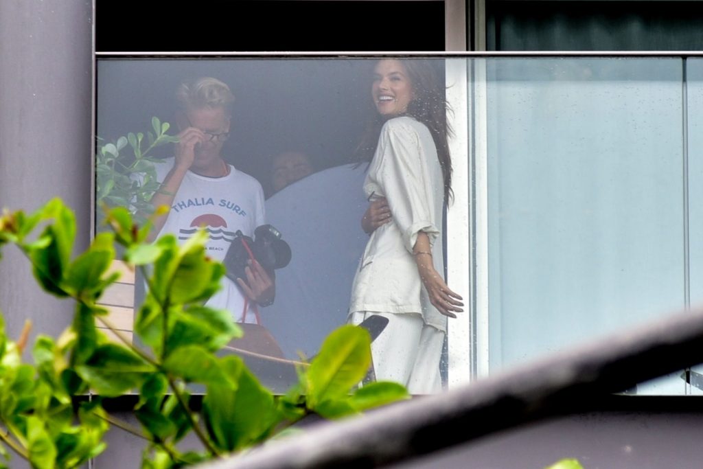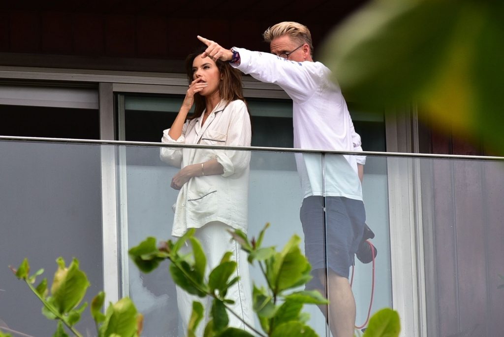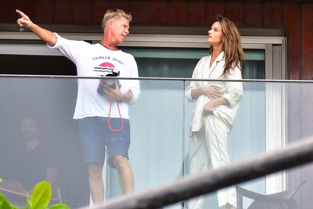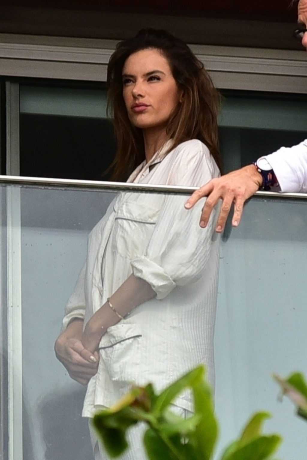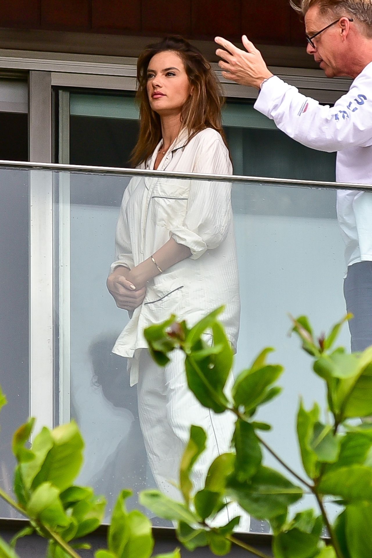 Alessandra Ambrosio tiene una sesión de fotos improvisada en un día lluvioso en el balcón de su hotel en Río de Janeiro, 27/02/2020. Alessandra no se avergüenza de mostrar algo de piel mientras luce solo una blusa de pijama, al mismo tiempo que revela lo que hay debajo. Estaba toda sonrisas mientras posaba para el fotógrafo privado.