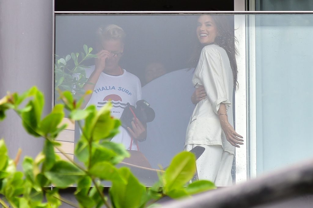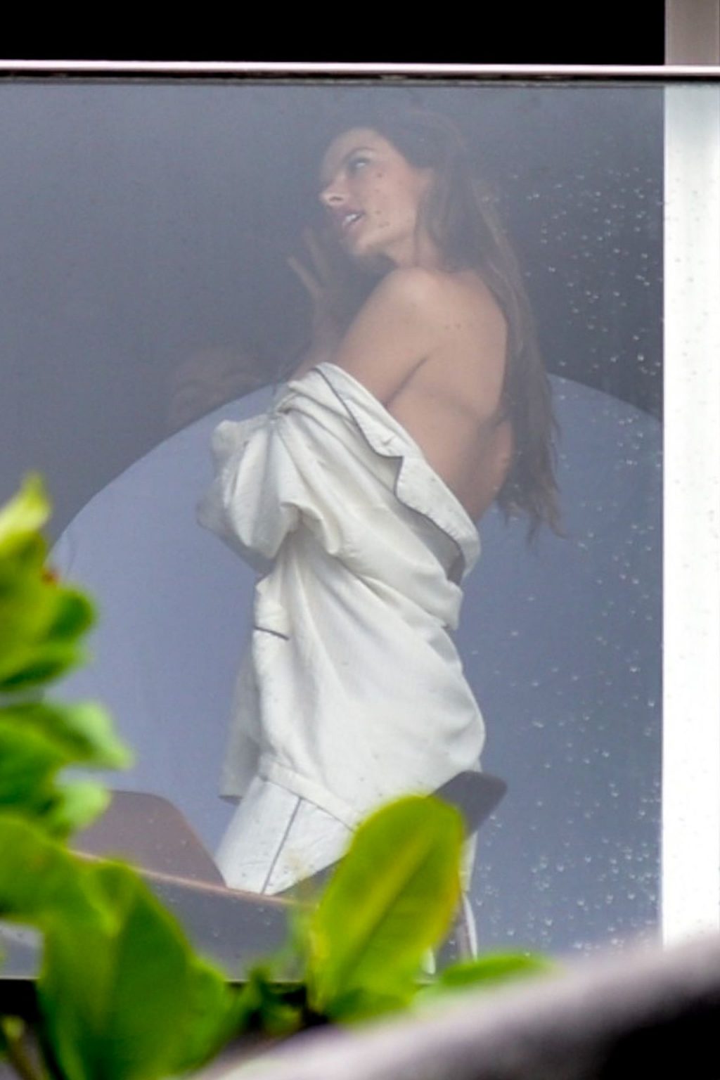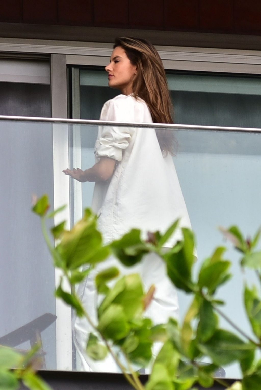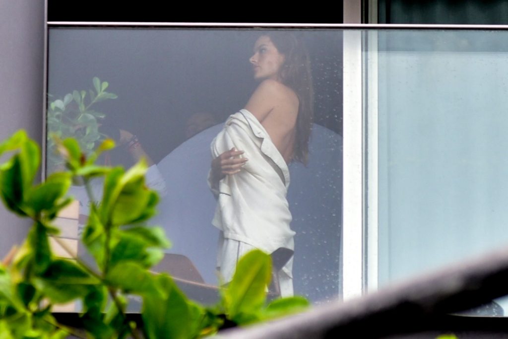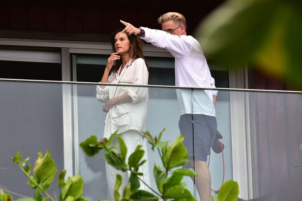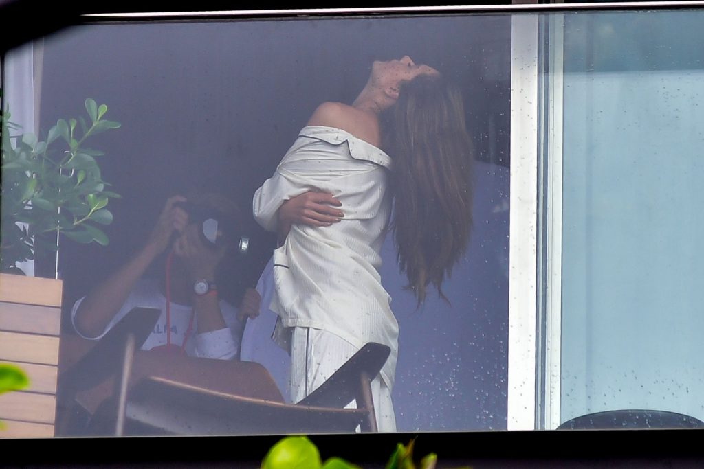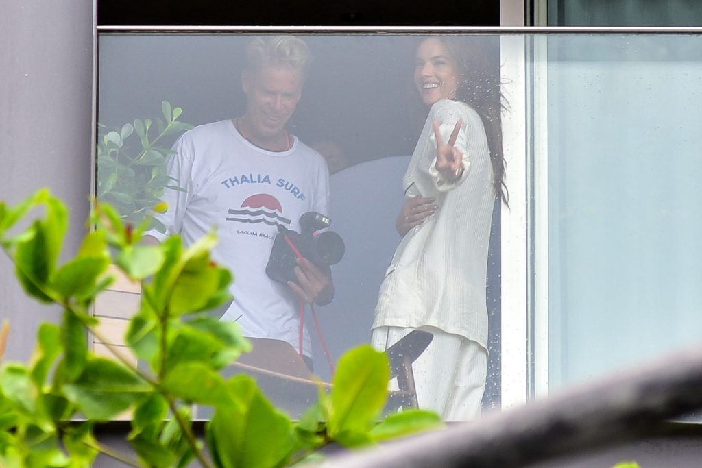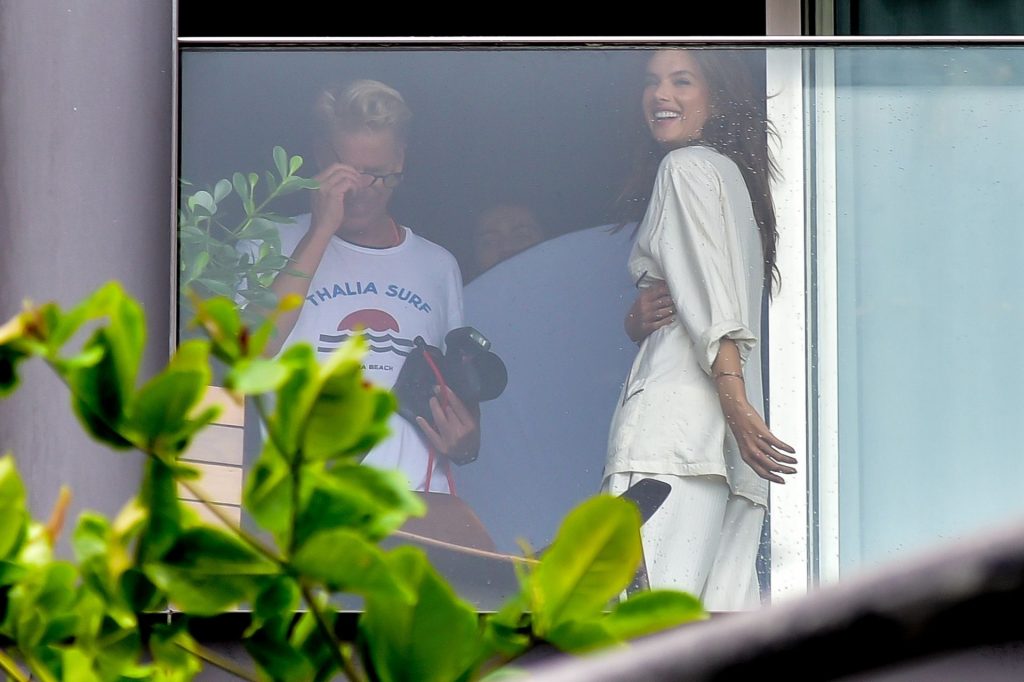 Alessandra Ambrosio tiene una sesión de fotos improvisada en un día lluvioso en el balcón de su hotel en Río de Janeiro, 27/02/2020. Alessandra no se avergüenza de mostrar algo de piel mientras luce solo una blusa de pijama, al mismo tiempo que revela lo que hay debajo. Estaba toda sonrisas mientras posaba para el fotógrafo privado.