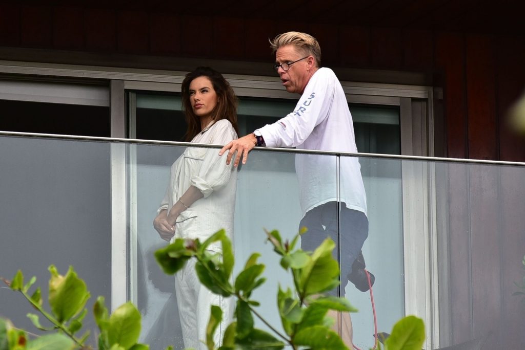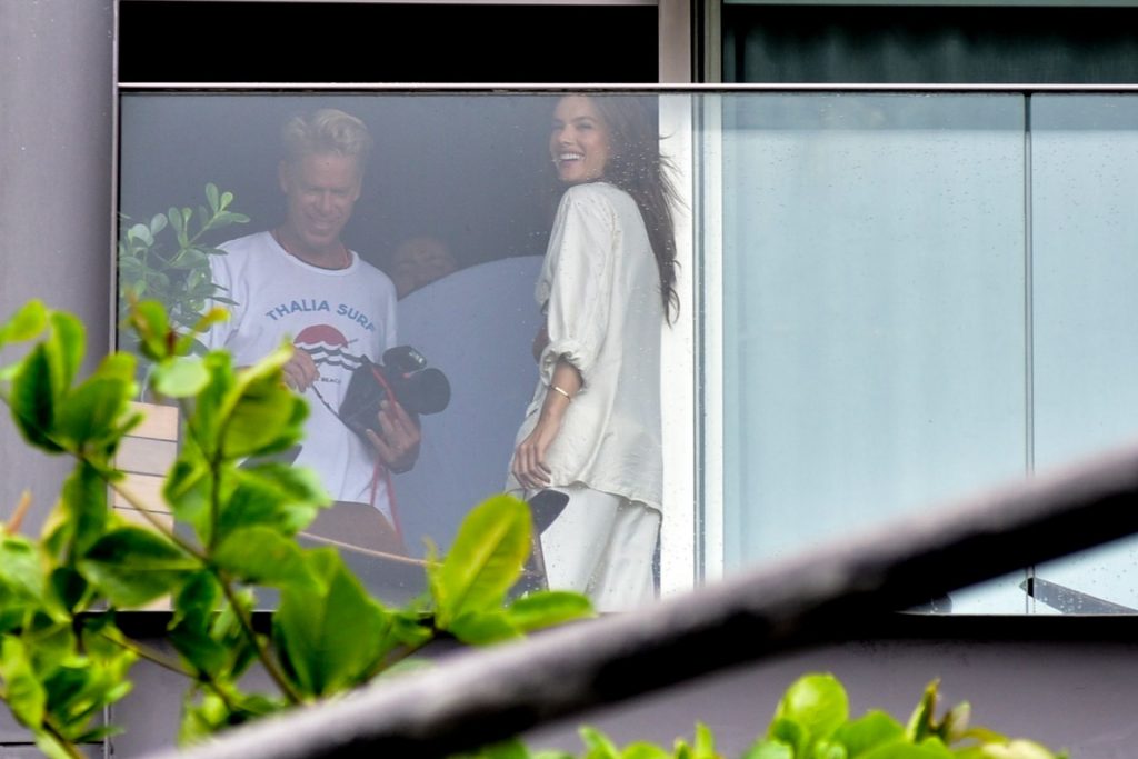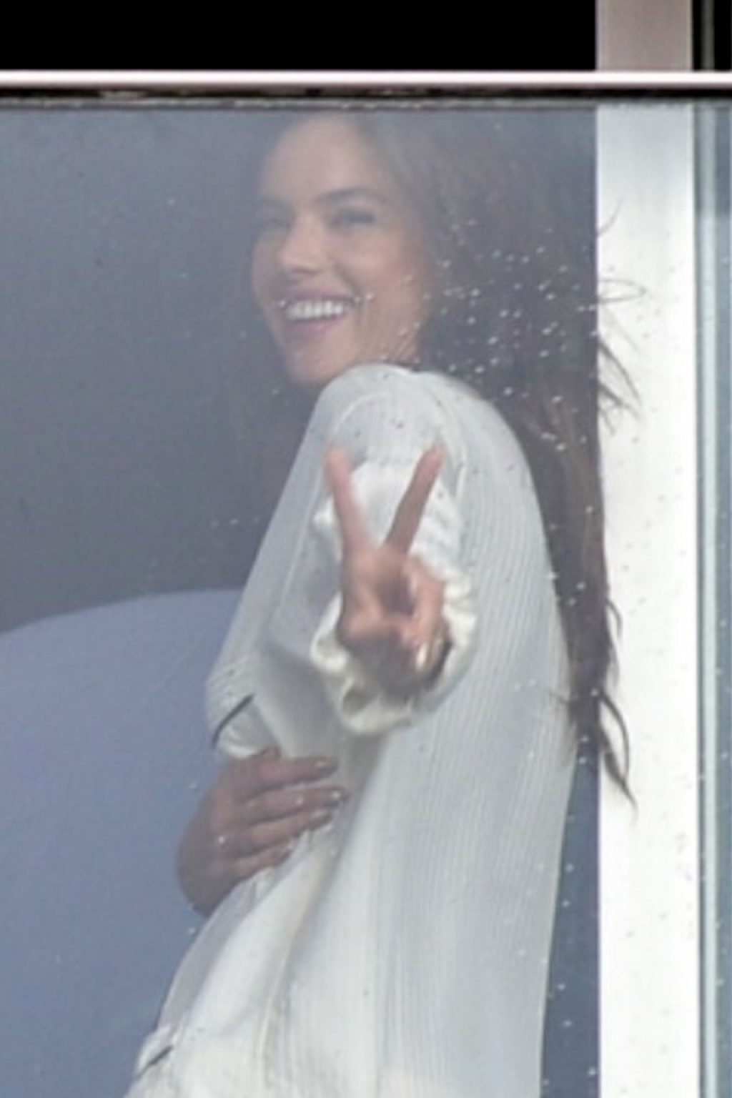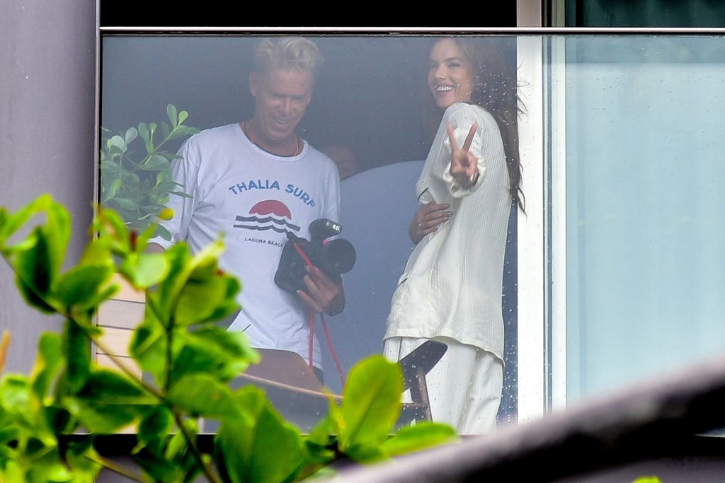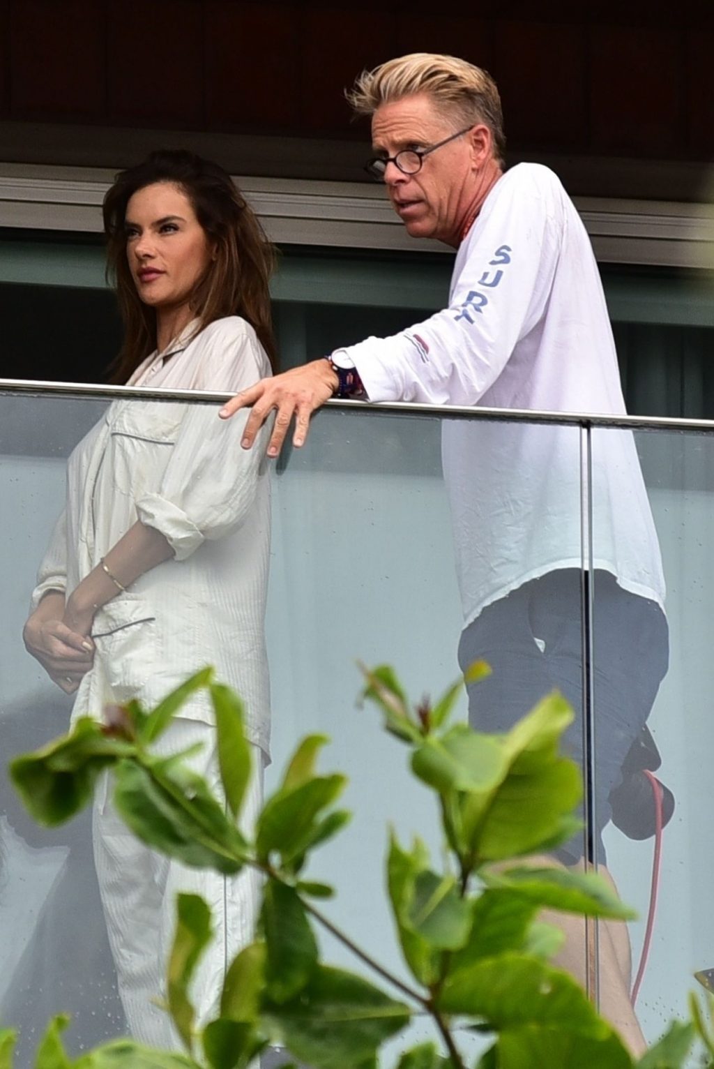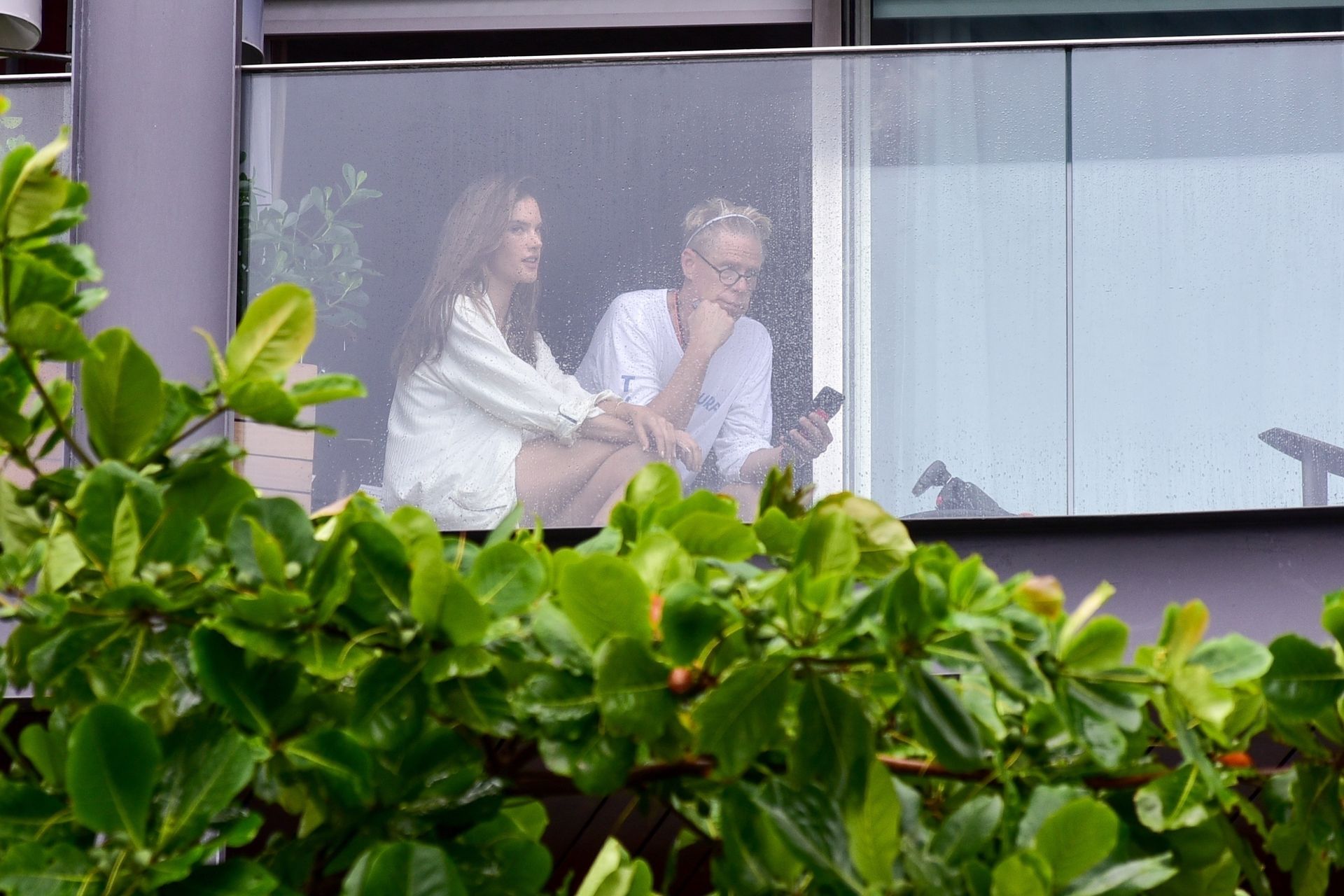 Alessandra Ambrosio tiene una sesión de fotos improvisada en un día lluvioso en el balcón de su hotel en Río de Janeiro, 27/02/2020. Alessandra no se avergüenza de mostrar algo de piel mientras luce solo una blusa de pijama, al mismo tiempo que revela lo que hay debajo. Estaba toda sonrisas mientras posaba para el fotógrafo privado.