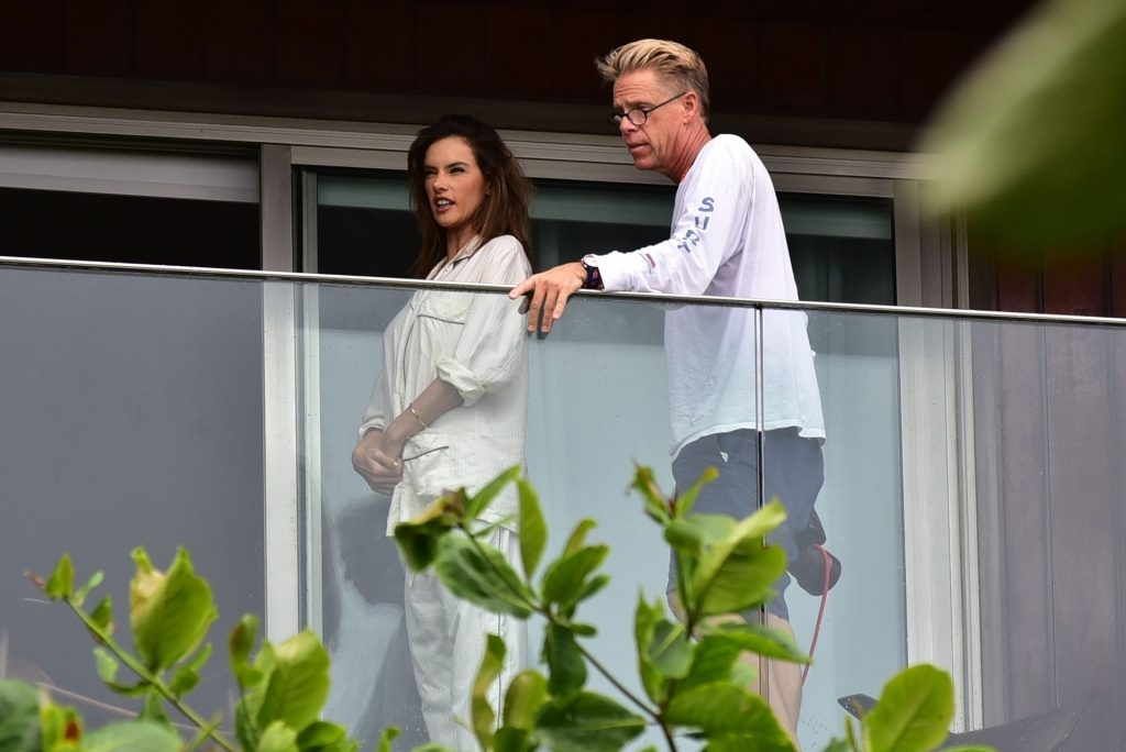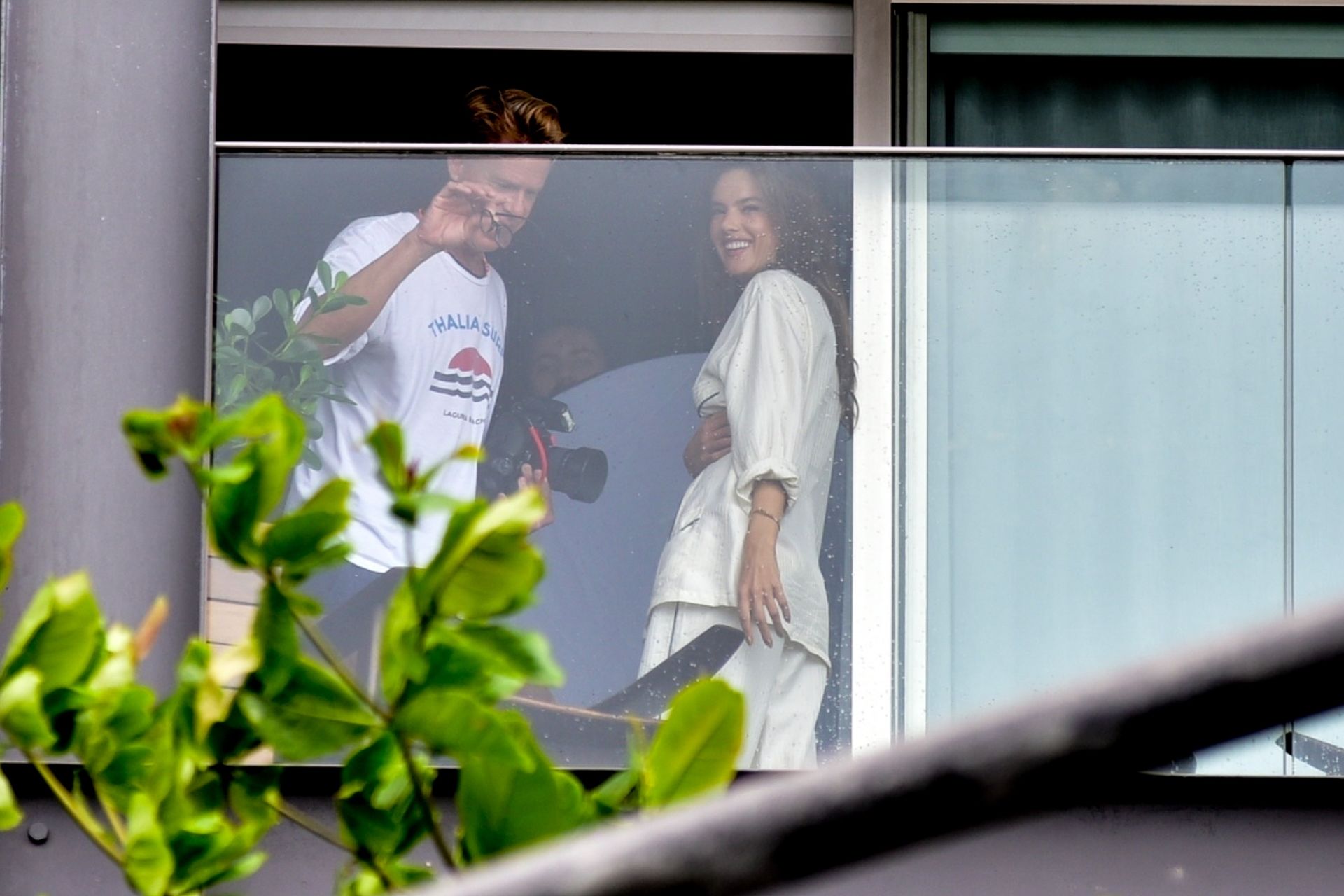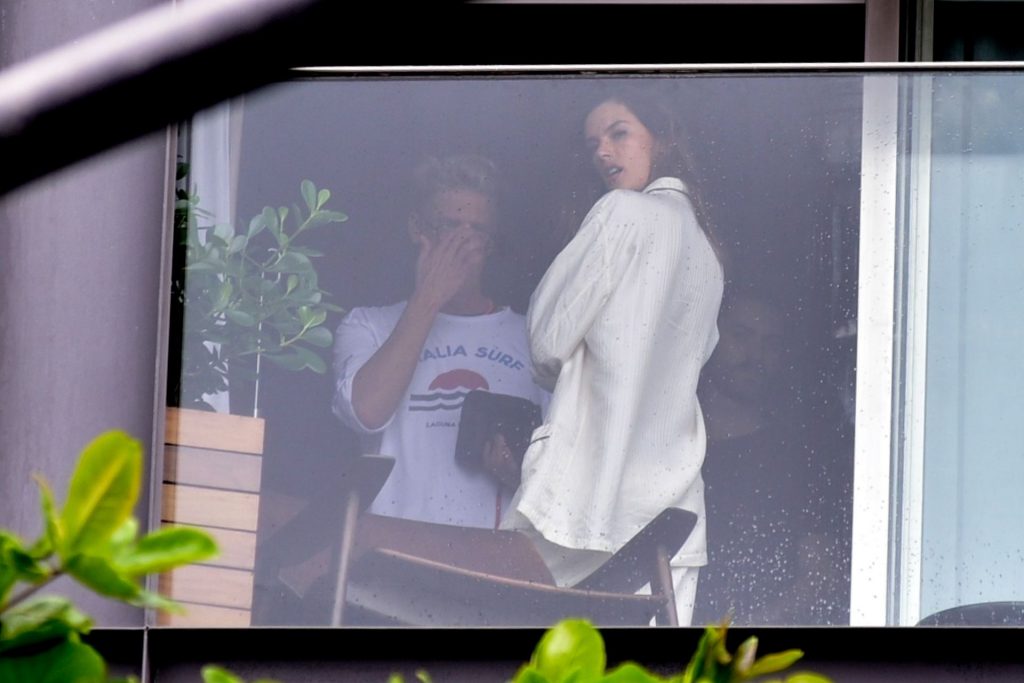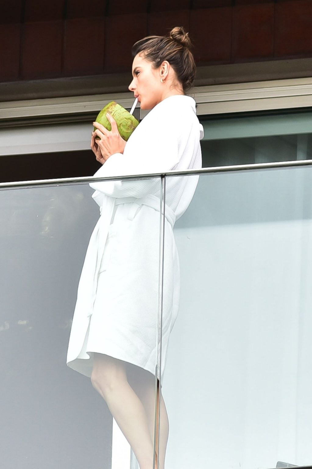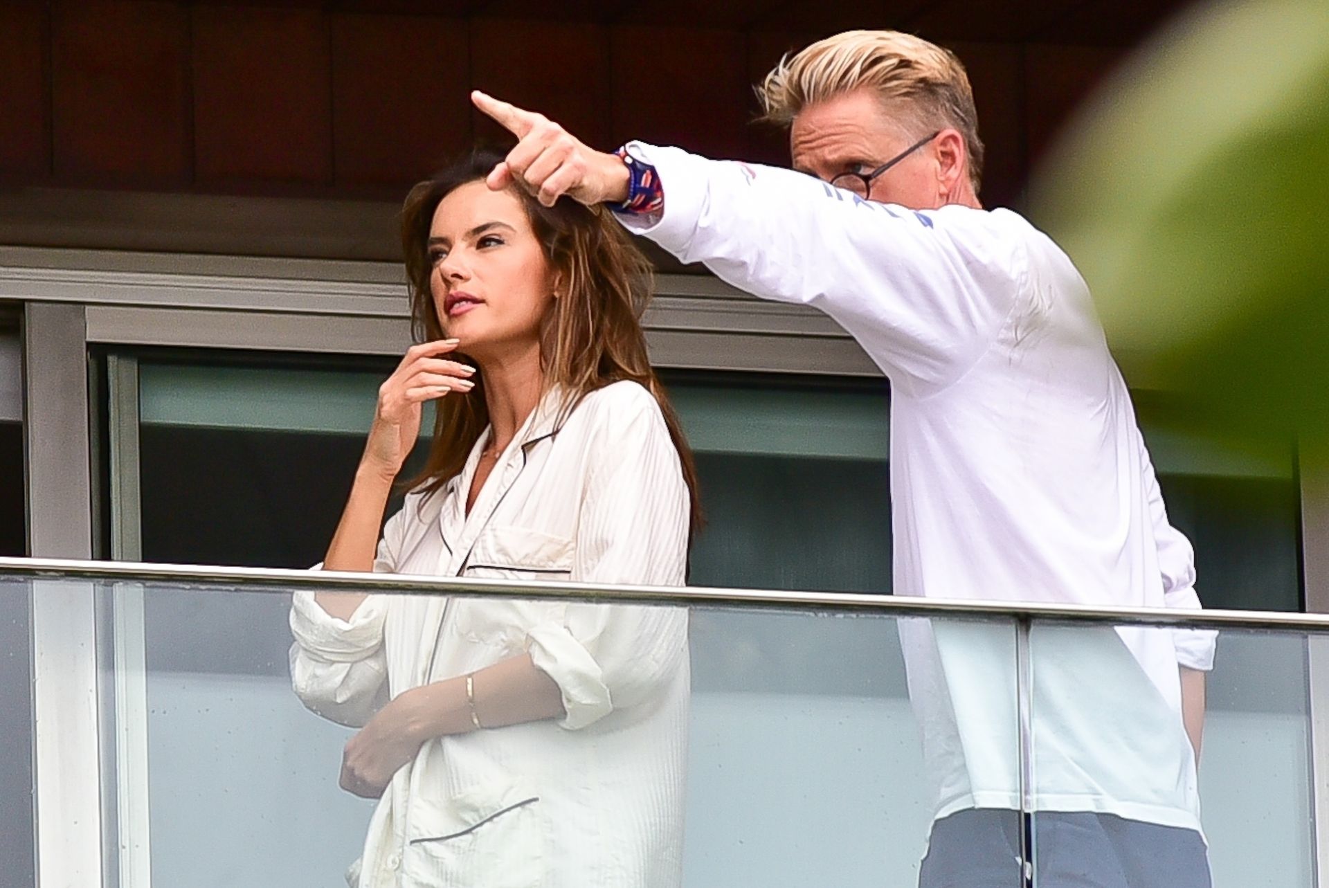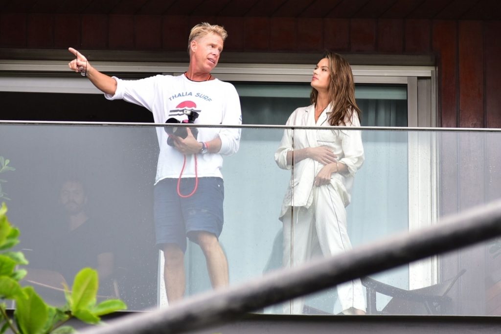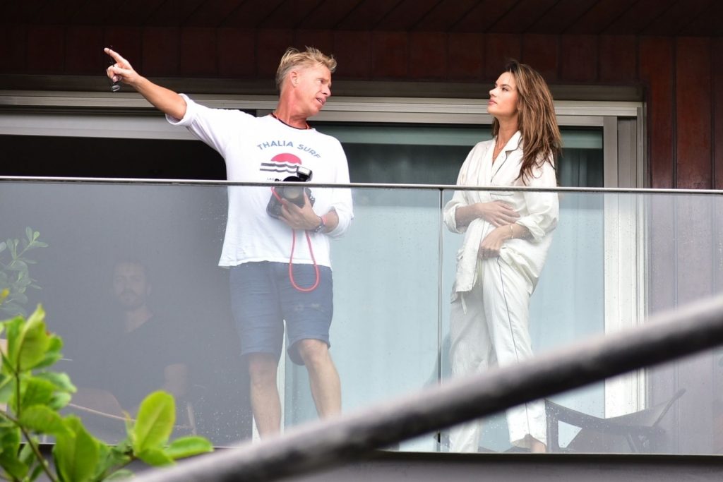Alessandra Ambrosio tiene una sesión de fotos improvisada en un día lluvioso en el balcón de su hotel en Río de Janeiro, 27/02/2020. Alessandra no se avergüenza de mostrar algo de piel mientras luce solo una blusa de pijama, al mismo tiempo que revela lo que hay debajo. Estaba toda sonrisas mientras posaba para el fotógrafo privado.