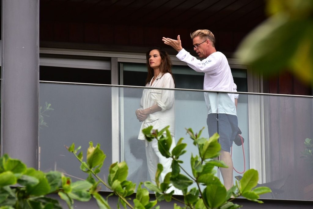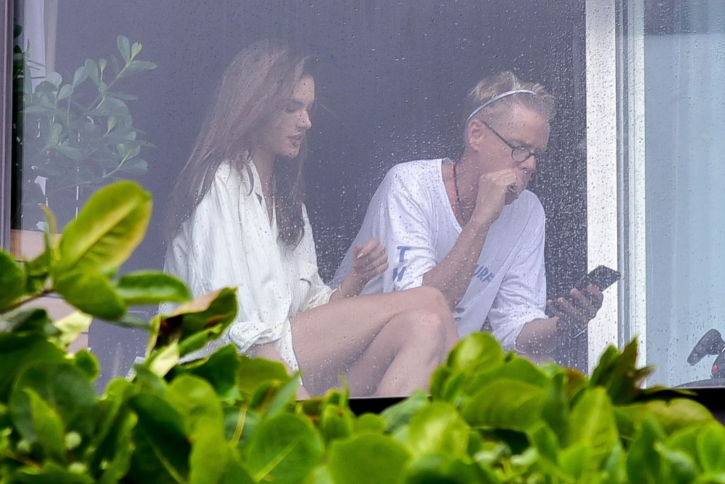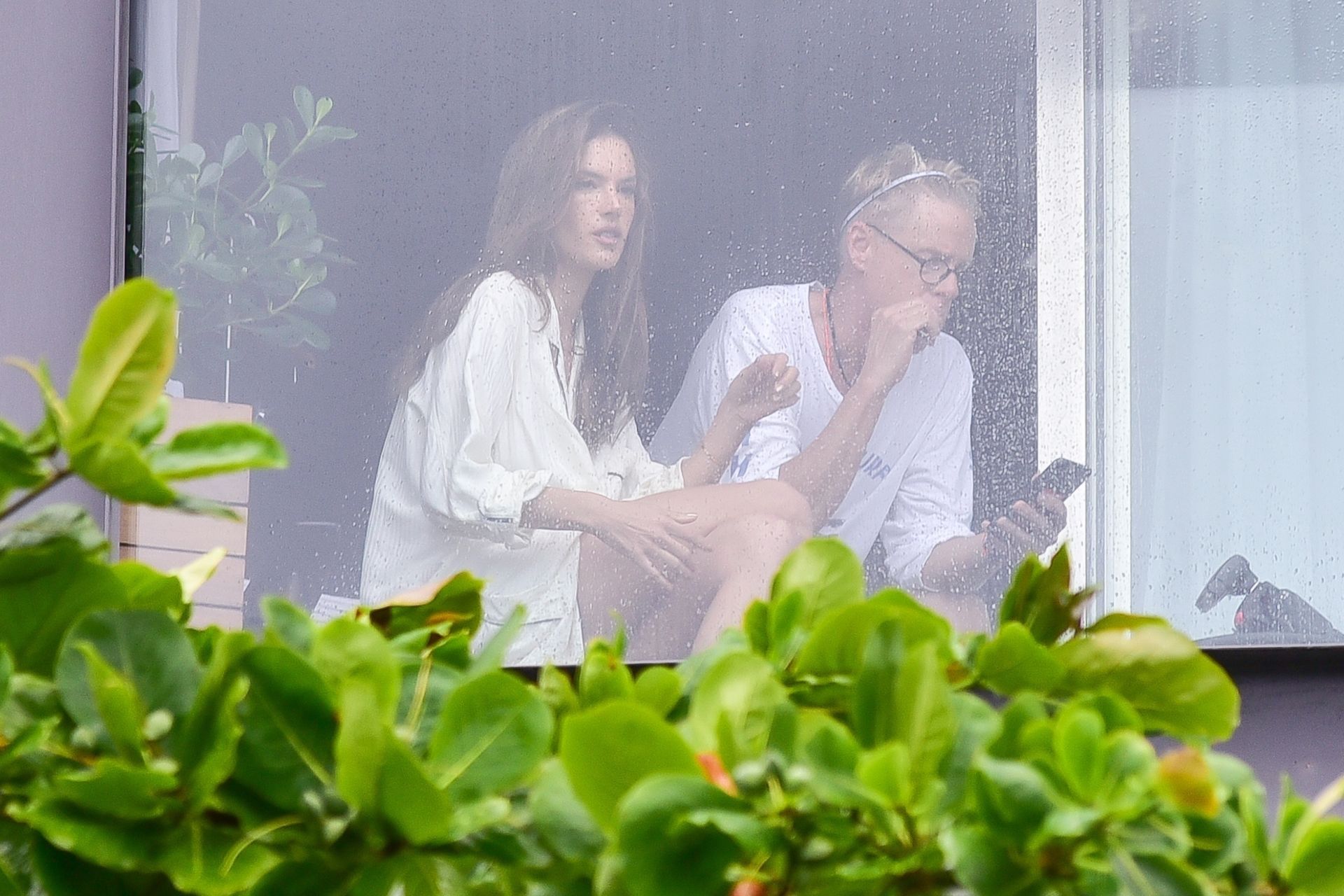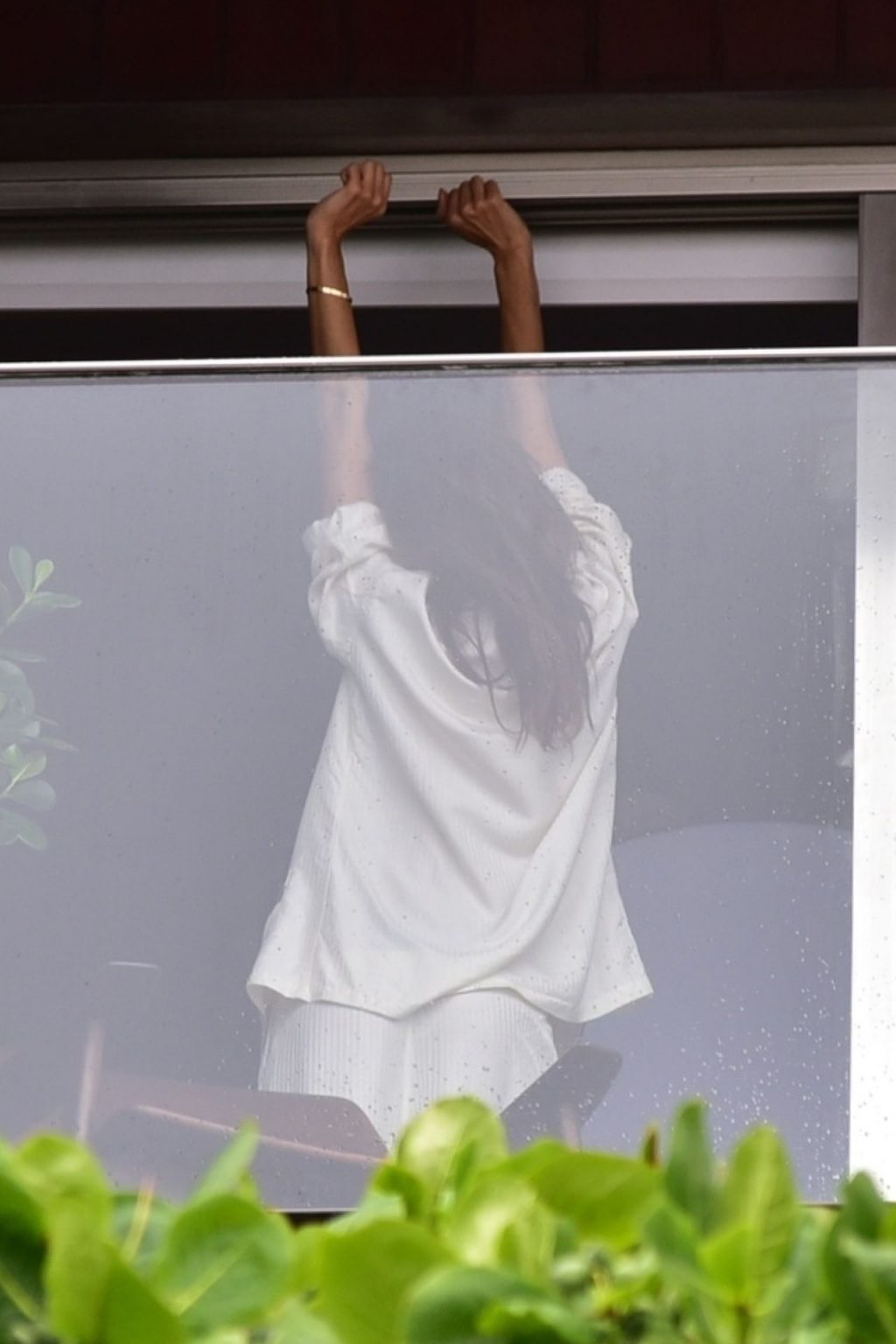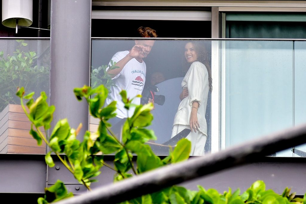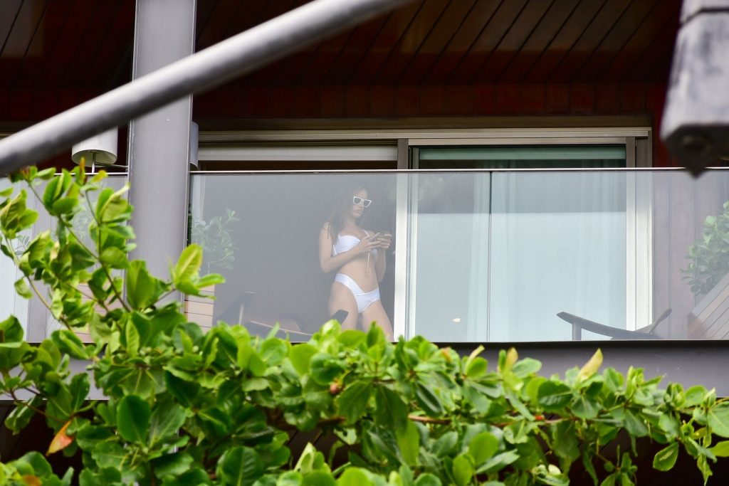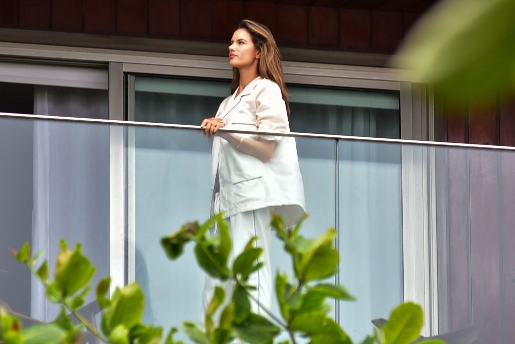 Alessandra Ambrosio tiene una sesión de fotos improvisada en un día lluvioso en el balcón de su hotel en Río de Janeiro, 27/02/2020. Alessandra no se avergüenza de mostrar algo de piel mientras luce solo una blusa de pijama, al mismo tiempo que revela lo que hay debajo. Estaba toda sonrisas mientras posaba para el fotógrafo privado.