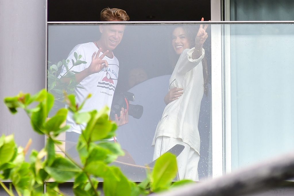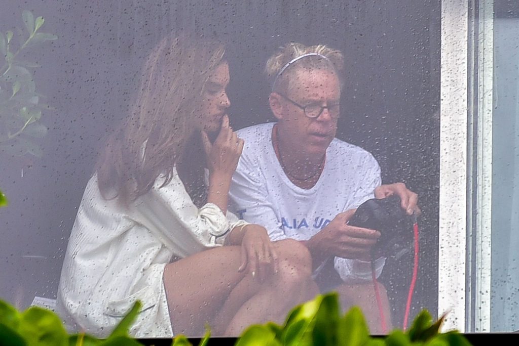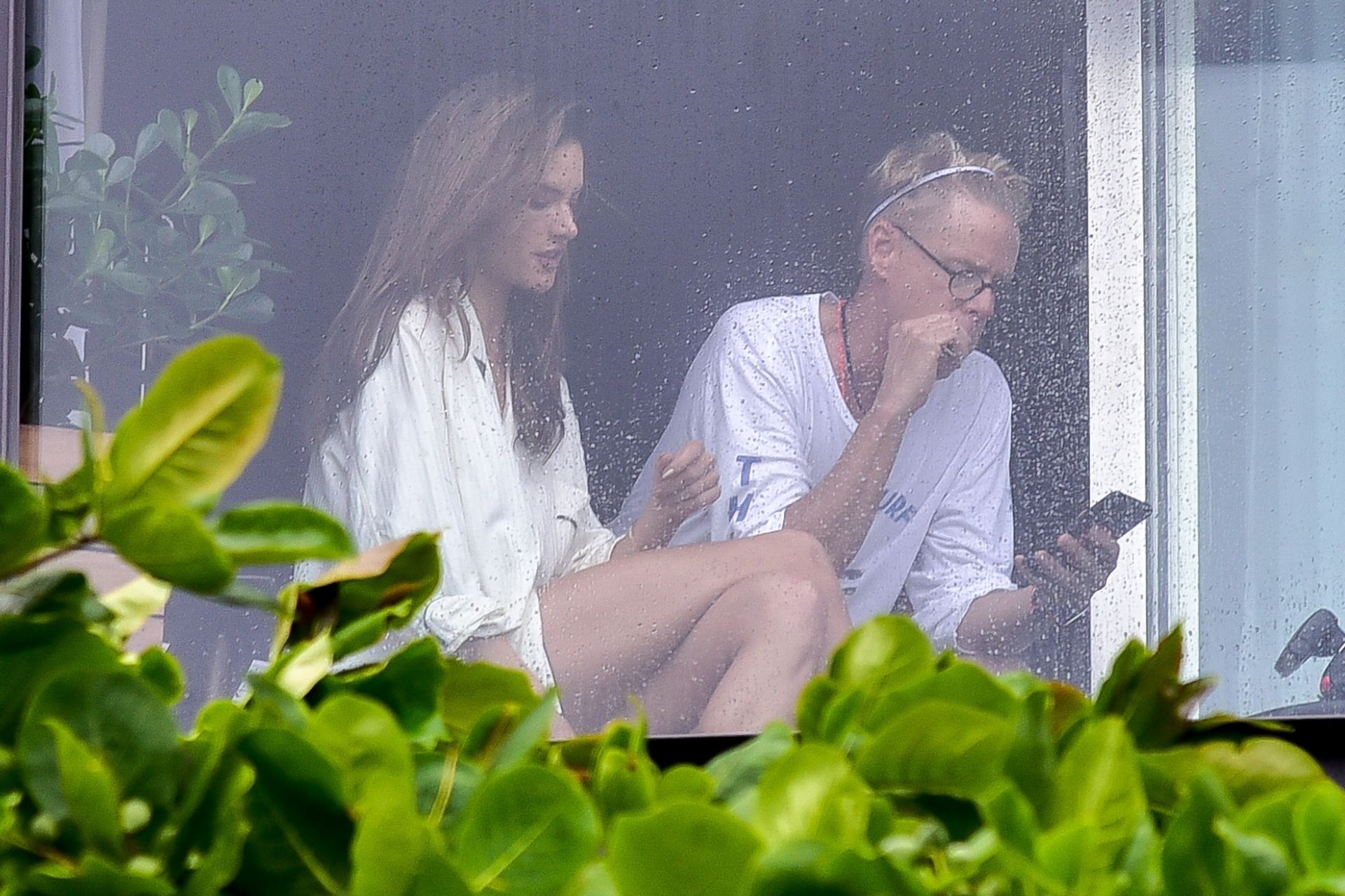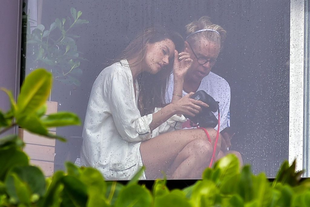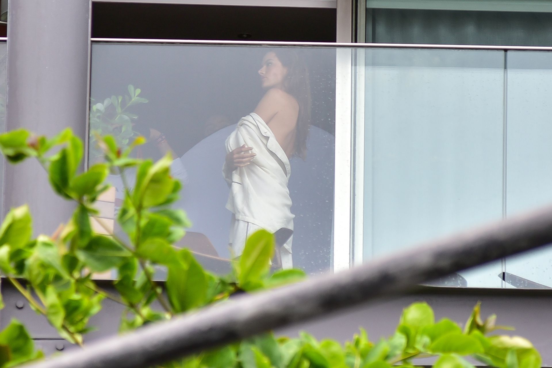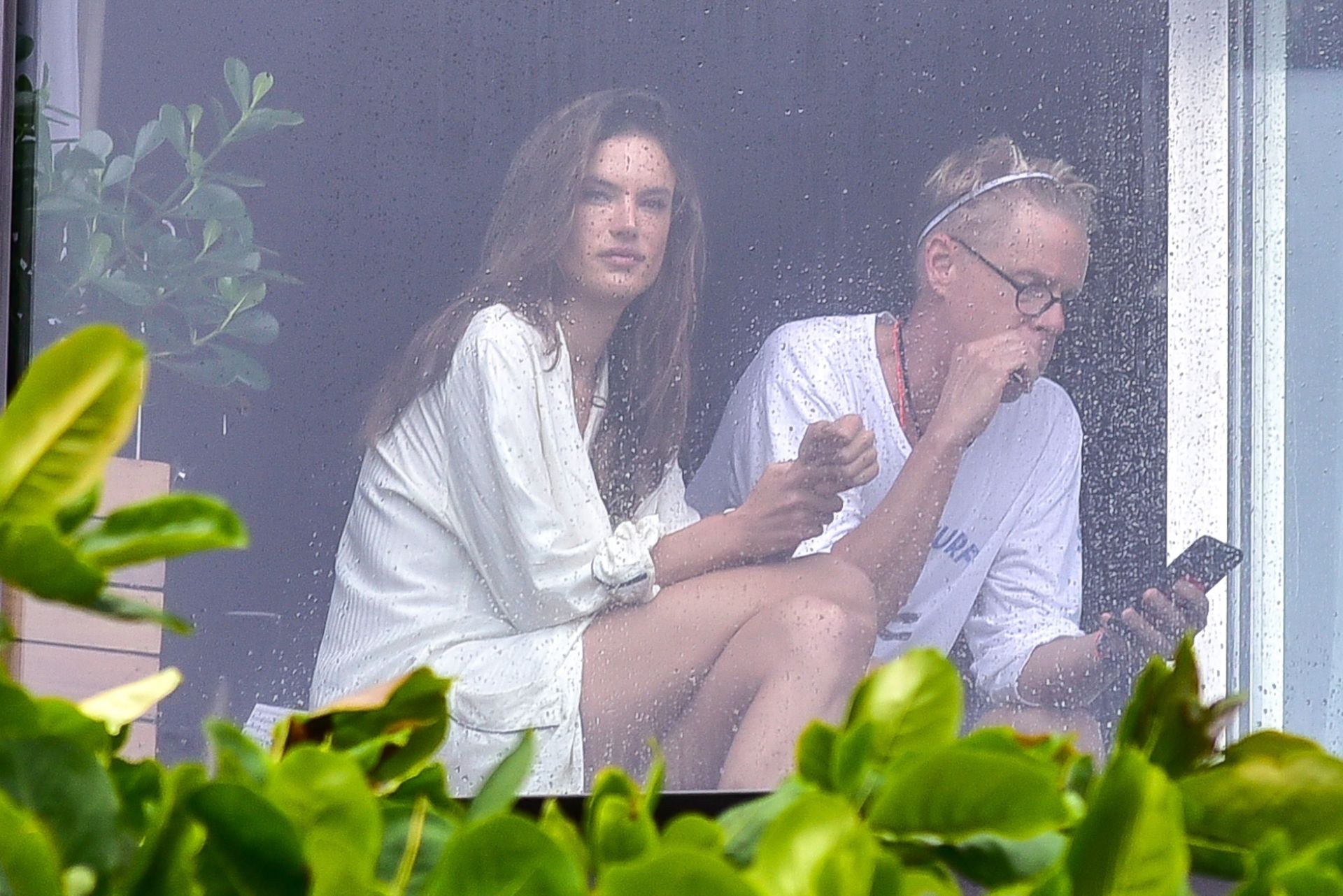 Alessandra Ambrosio tiene una sesión de fotos improvisada en un día lluvioso en el balcón de su hotel en Río de Janeiro, 27/02/2020. Alessandra no se avergüenza de mostrar algo de piel mientras luce solo una blusa de pijama, al mismo tiempo que revela lo que hay debajo. Estaba toda sonrisas mientras posaba para el fotógrafo privado.