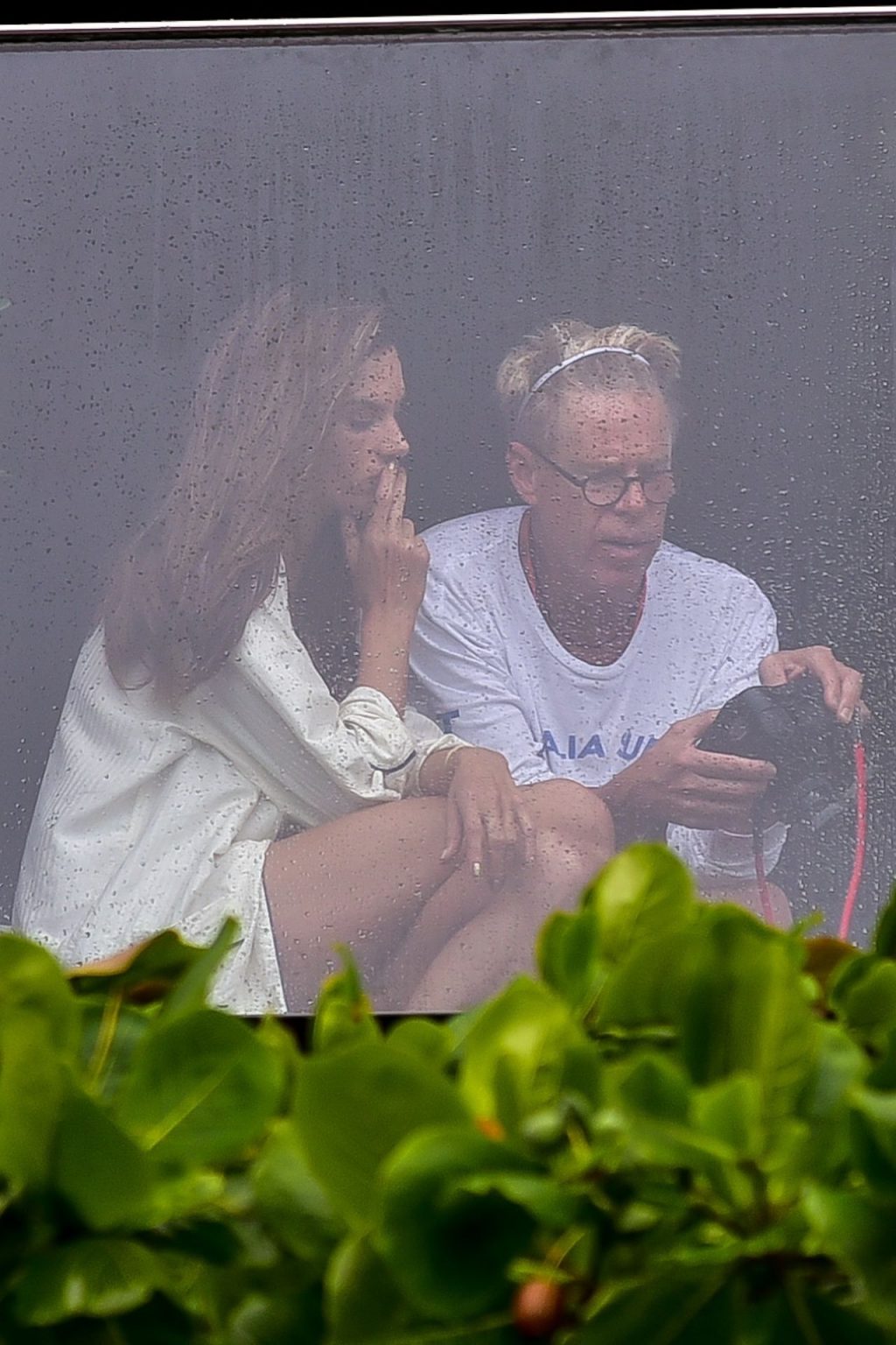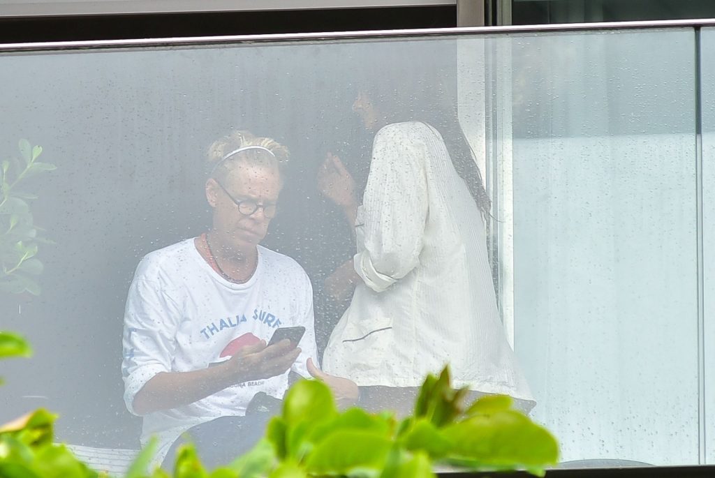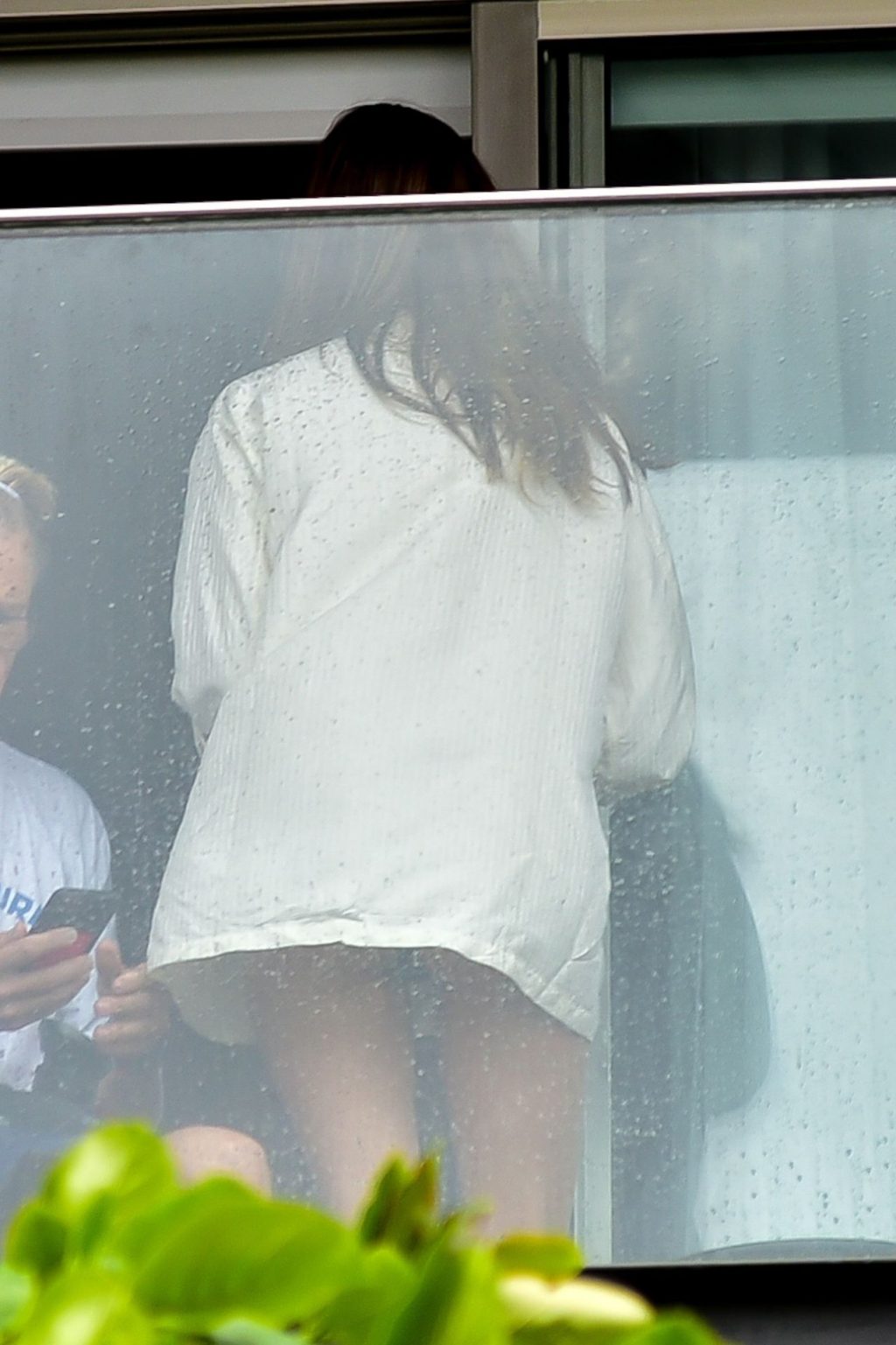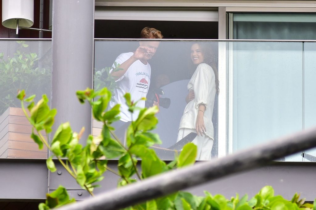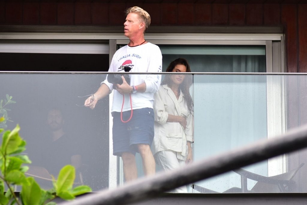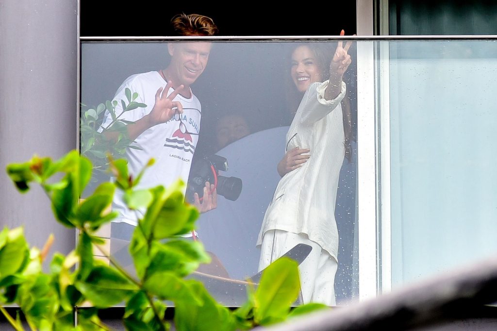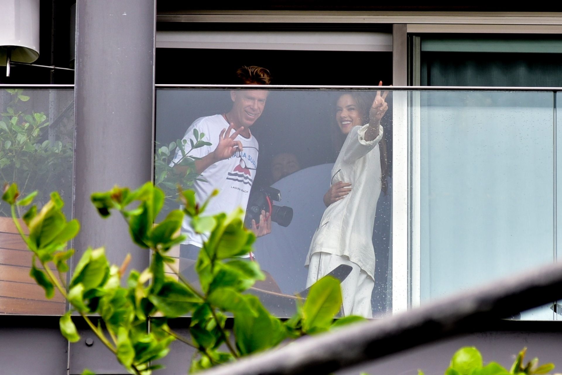 Alessandra Ambrosio tiene una sesión de fotos improvisada en un día lluvioso en el balcón de su hotel en Río de Janeiro, 27/02/2020. Alessandra no se avergüenza de mostrar algo de piel mientras luce solo una blusa de pijama, al mismo tiempo que revela lo que hay debajo. Estaba toda sonrisas mientras posaba para el fotógrafo privado.