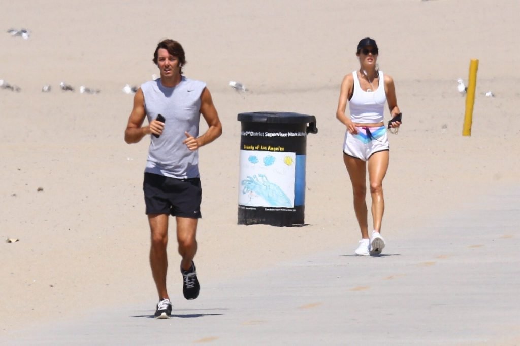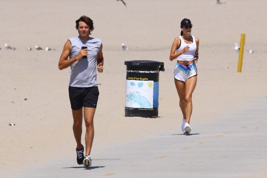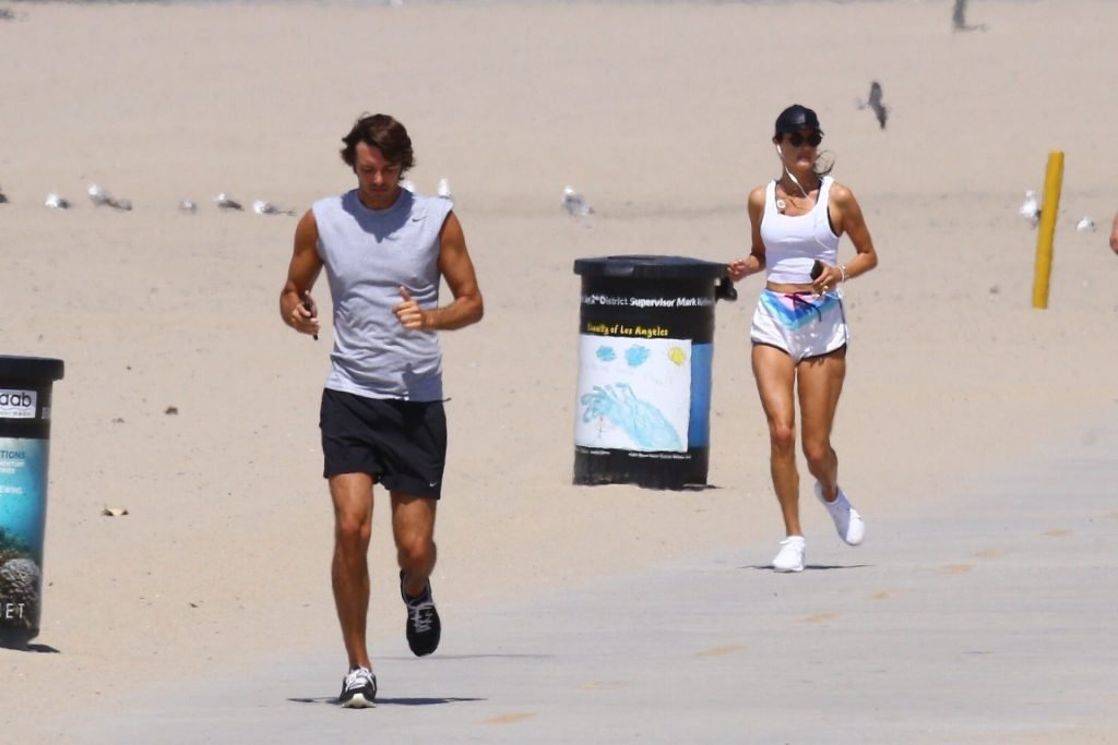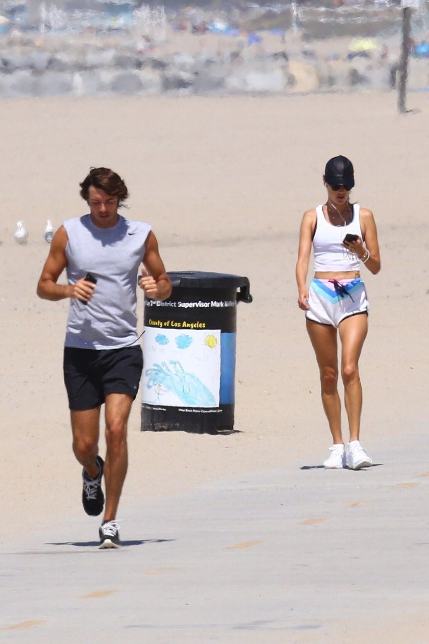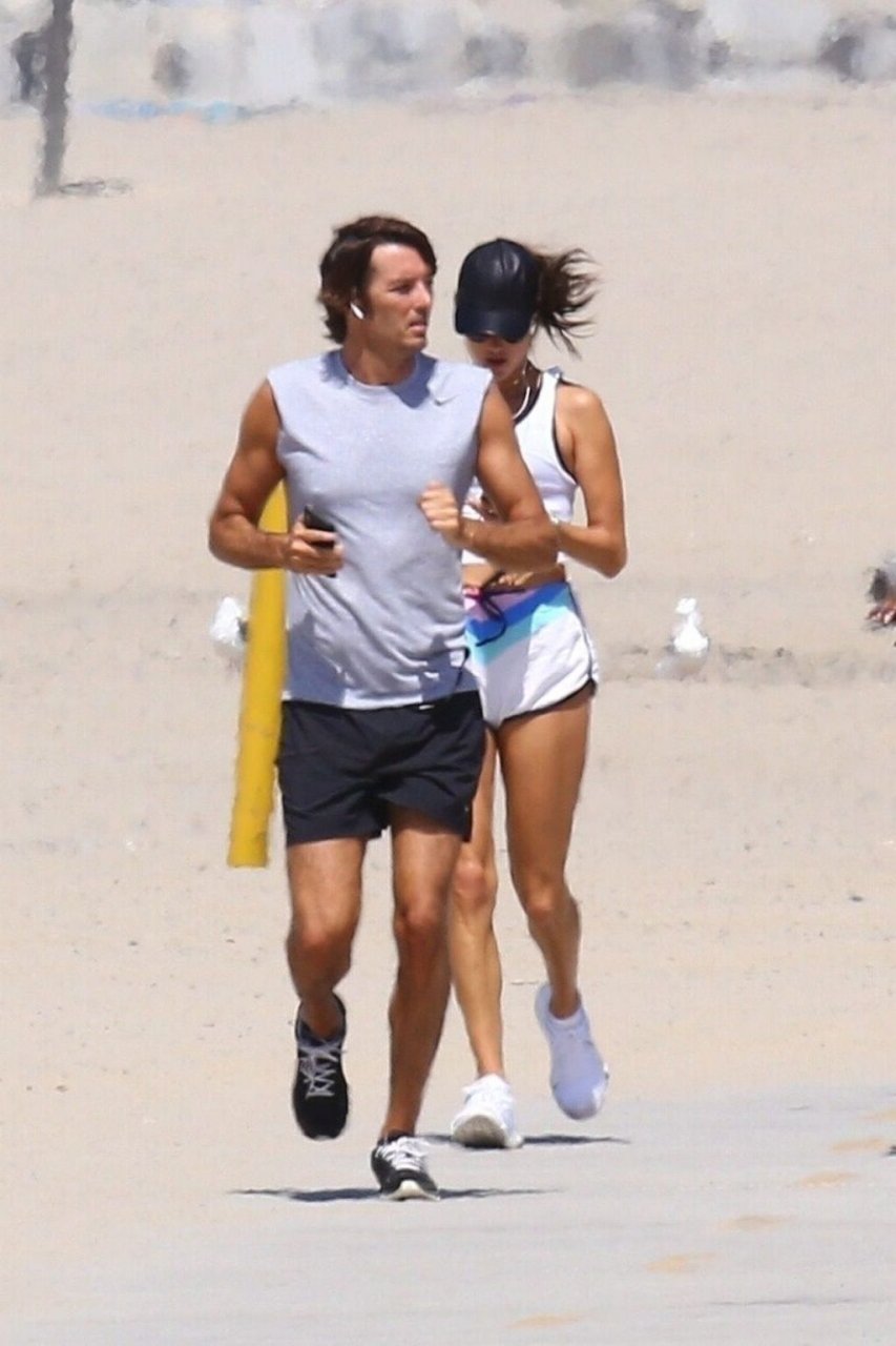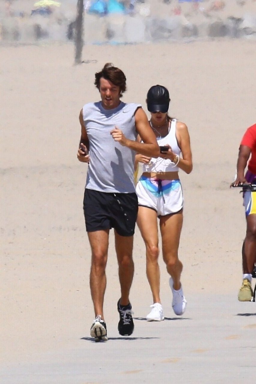 Alessandra Ambrosio y su novio Nicolo Oddi salen a correr juntos por la playa, 08/10/2019. La pareja luce casual mientras disfrutan de su ejercicio con vistas.