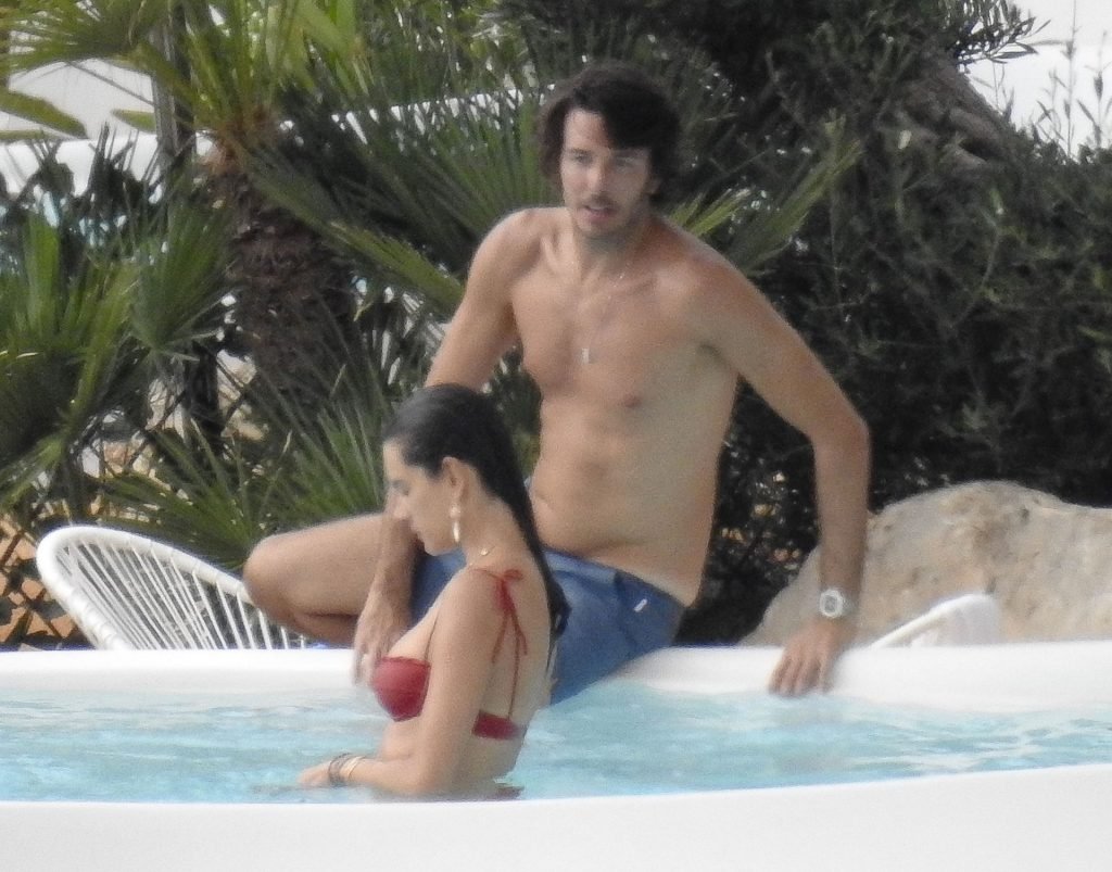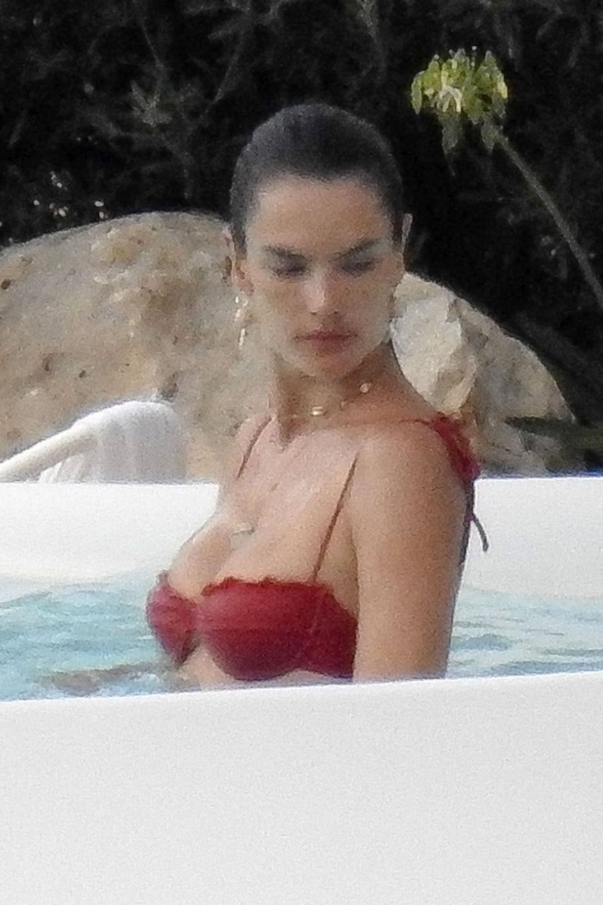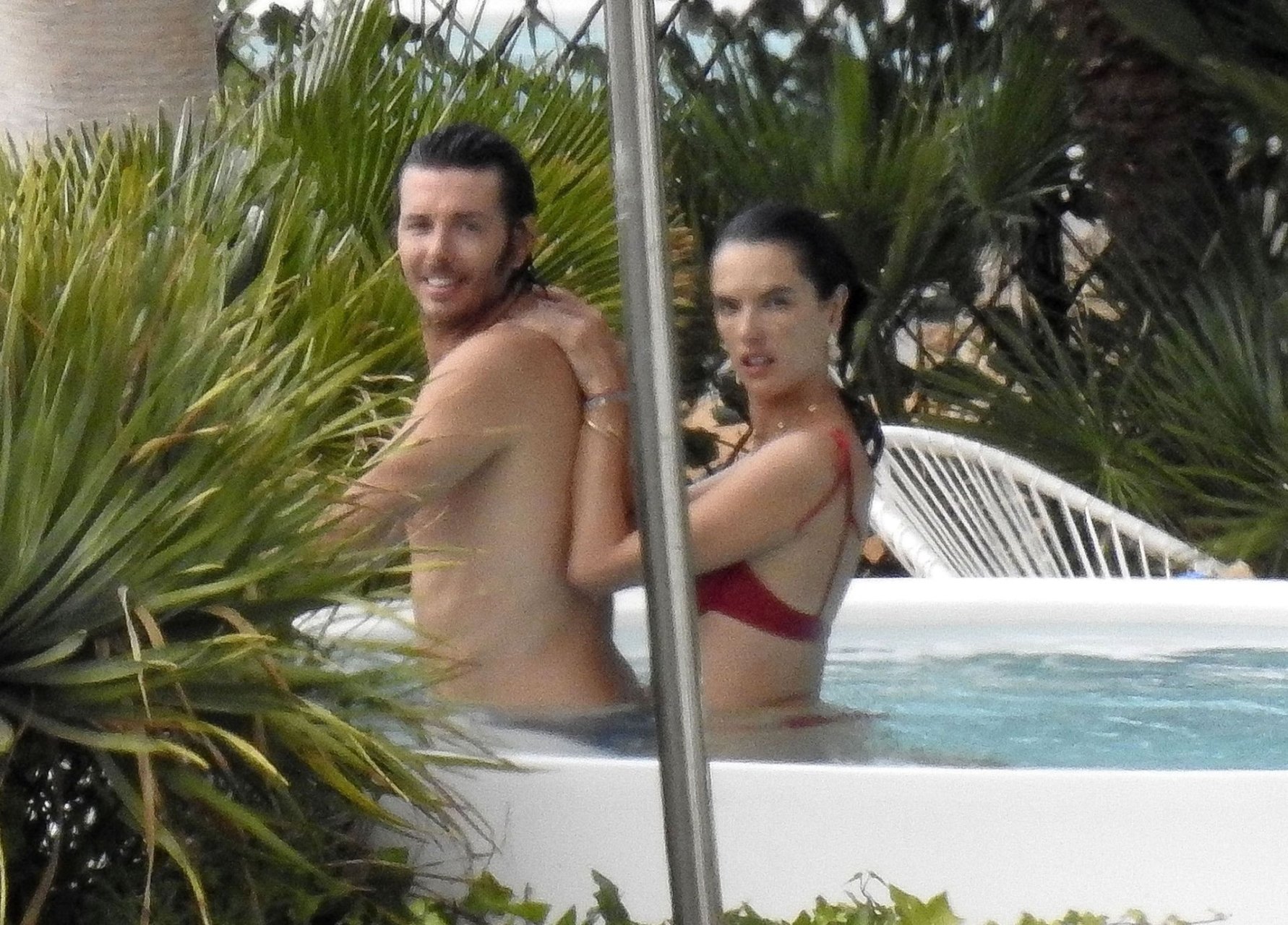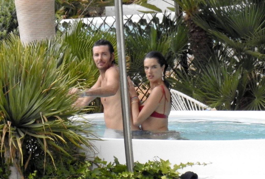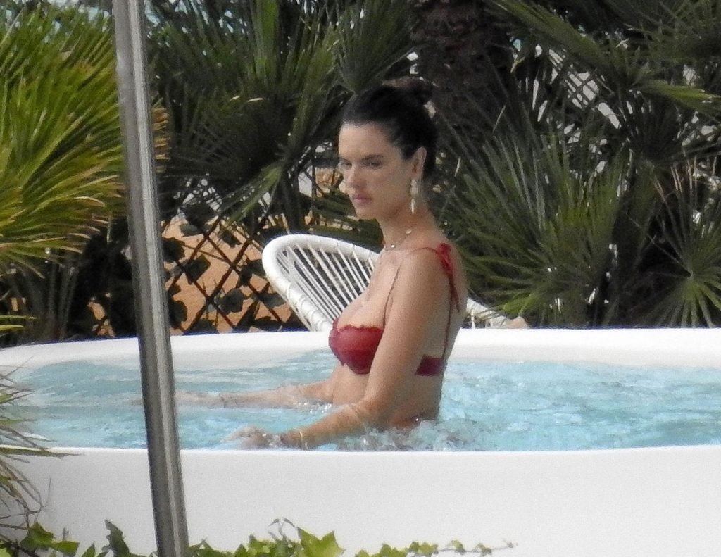 Usando su sexy bikini rojo, la supermodelo brasileña Alessandra Ambrosio se ve muy enamorada y relajada con su novio italiano Nicolo Oddi mientras la pareja se muestra cariñosa junto a la piscina durante sus vacaciones en Ibiza, 07/08/2019.