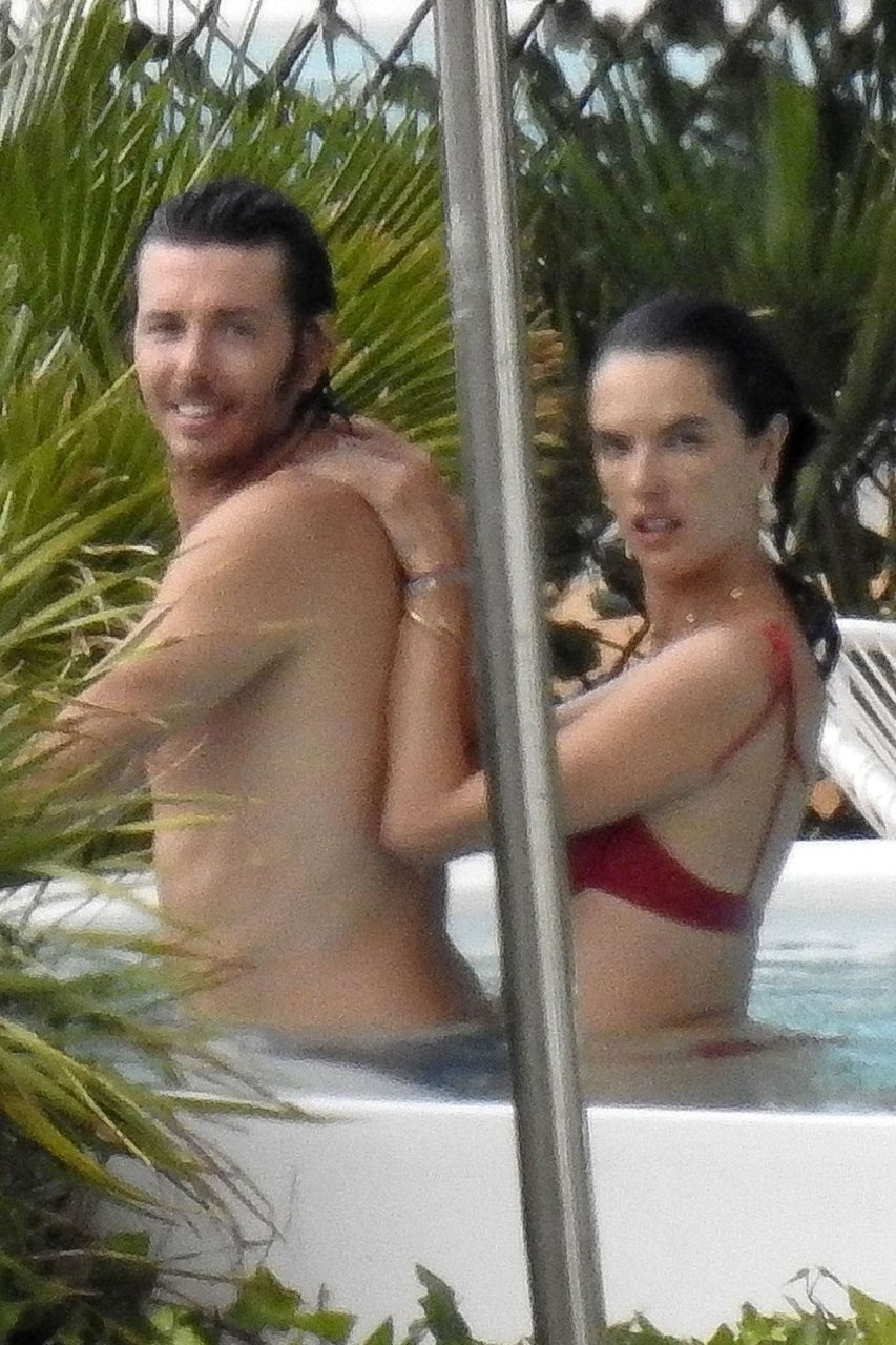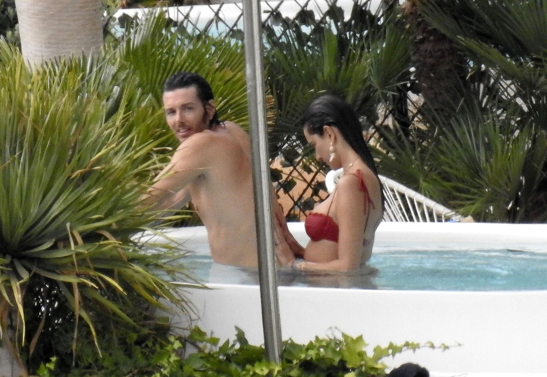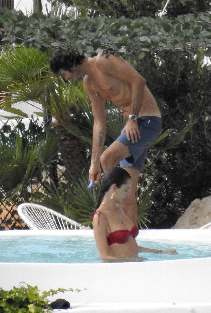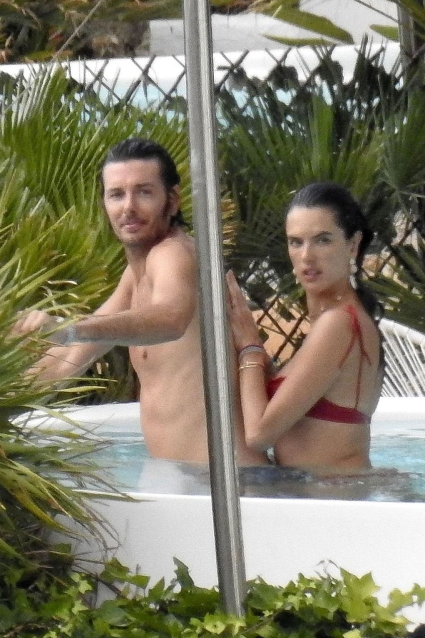 Usando su sexy bikini rojo, la supermodelo brasileña Alessandra Ambrosio se ve muy enamorada y relajada con su novio italiano Nicolo Oddi mientras la pareja se muestra cariñosa junto a la piscina durante sus vacaciones en Ibiza, 07/08/2019.
