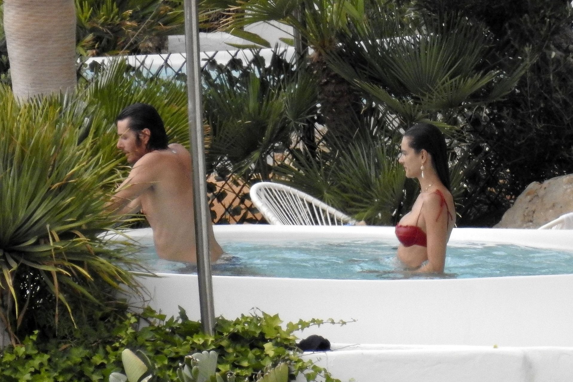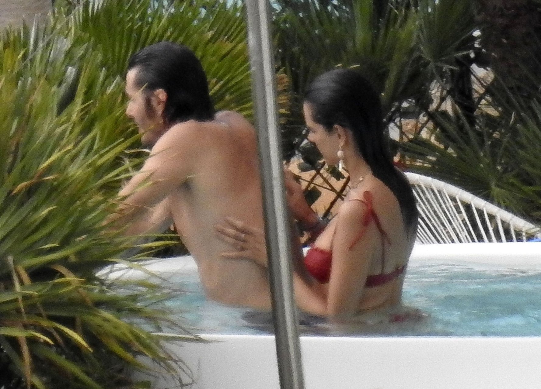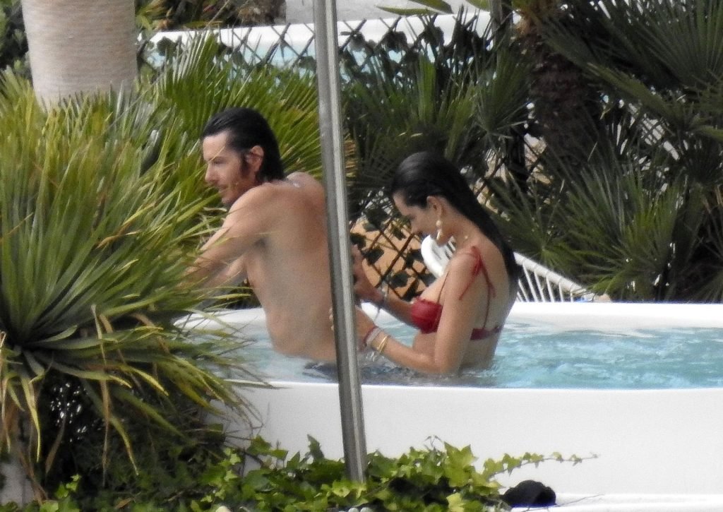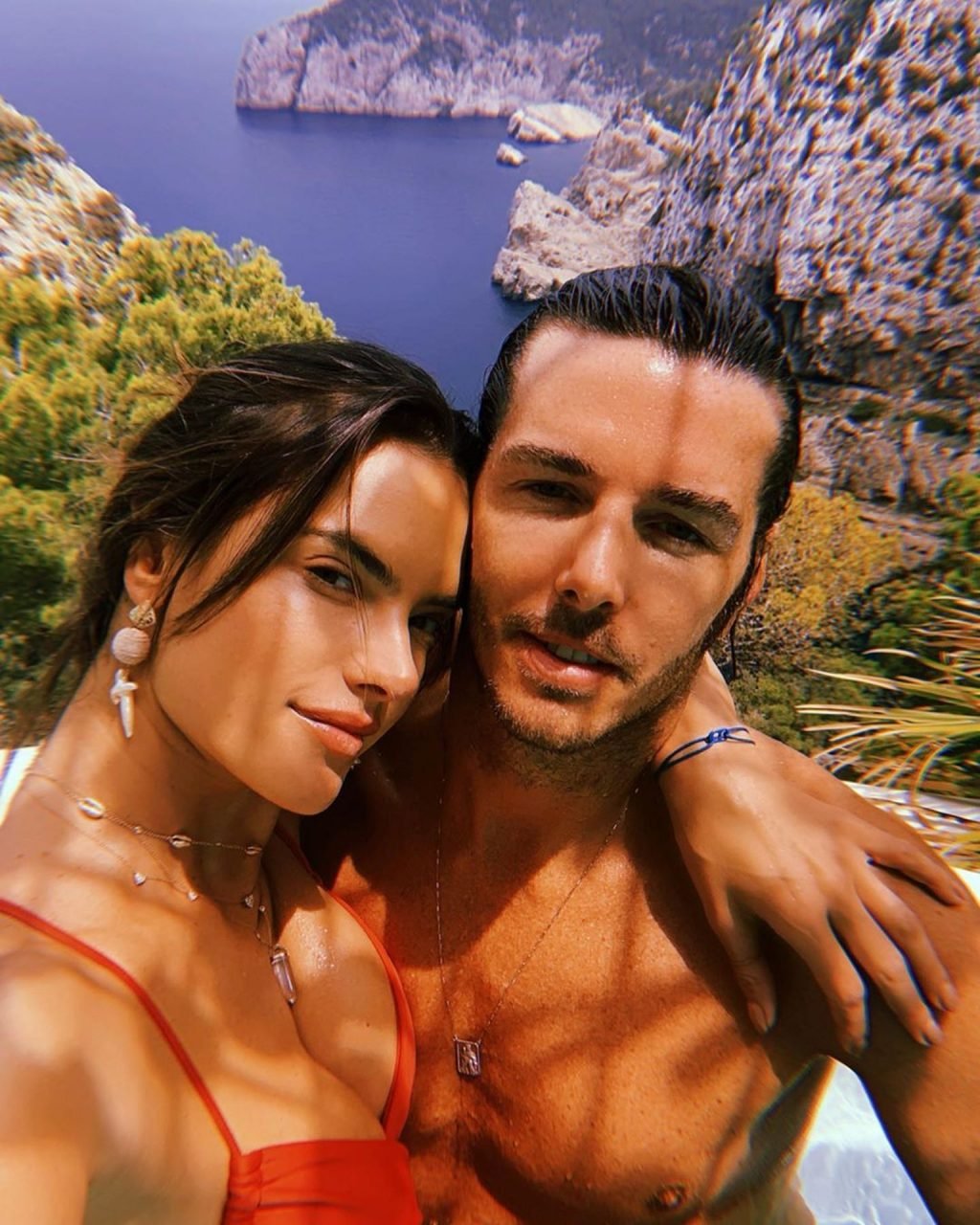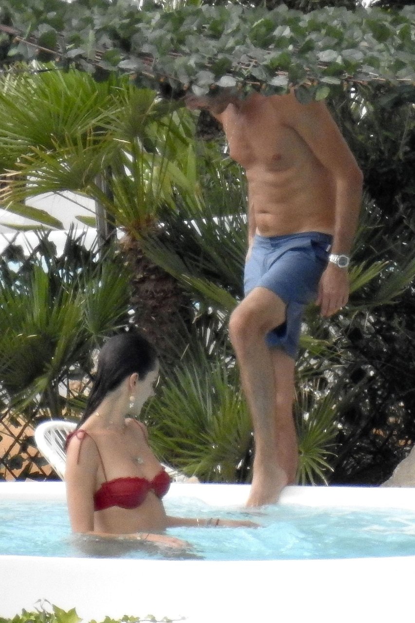 Usando su sexy bikini rojo, la supermodelo brasileña Alessandra Ambrosio se ve muy enamorada y relajada con su novio italiano Nicolo Oddi mientras la pareja se muestra cariñosa junto a la piscina durante sus vacaciones en Ibiza, 07/08/2019.