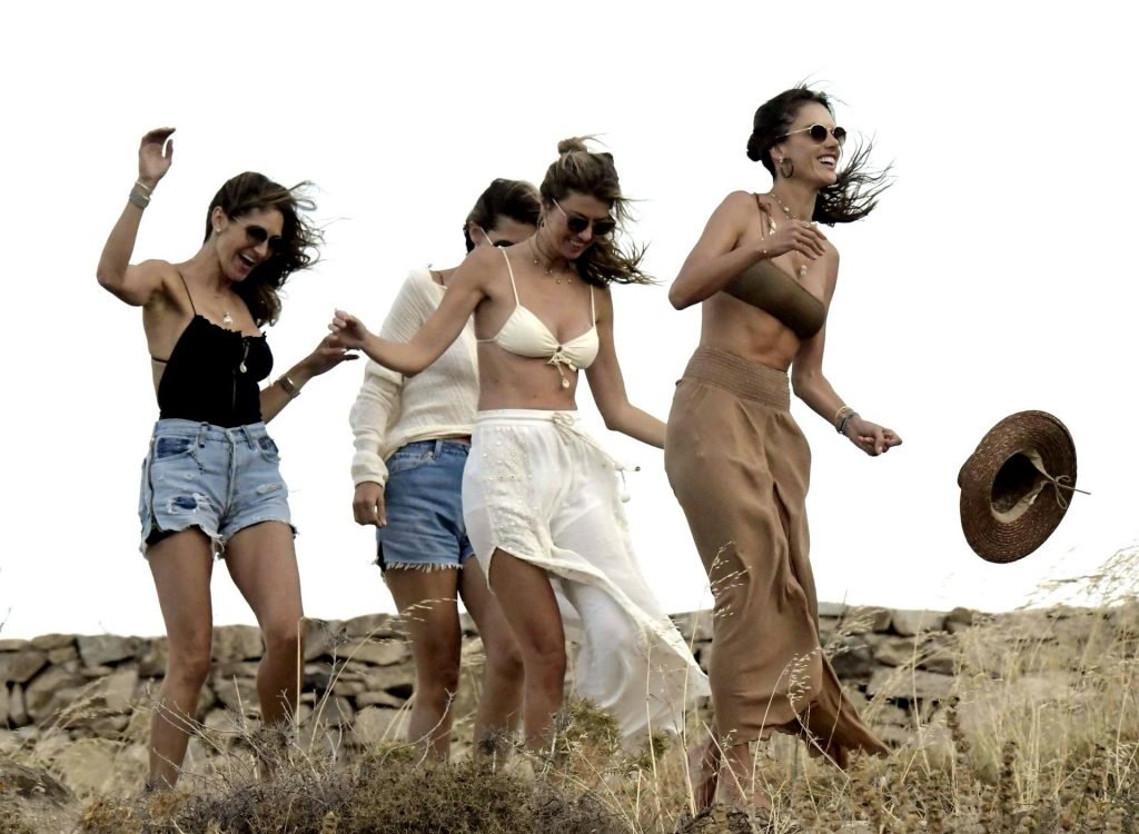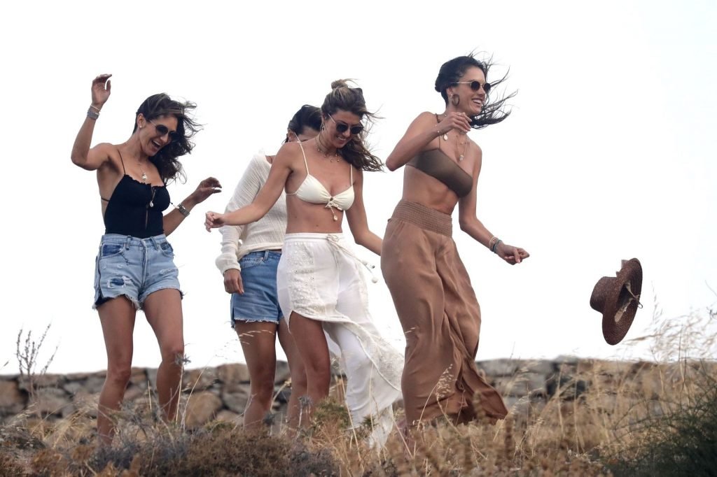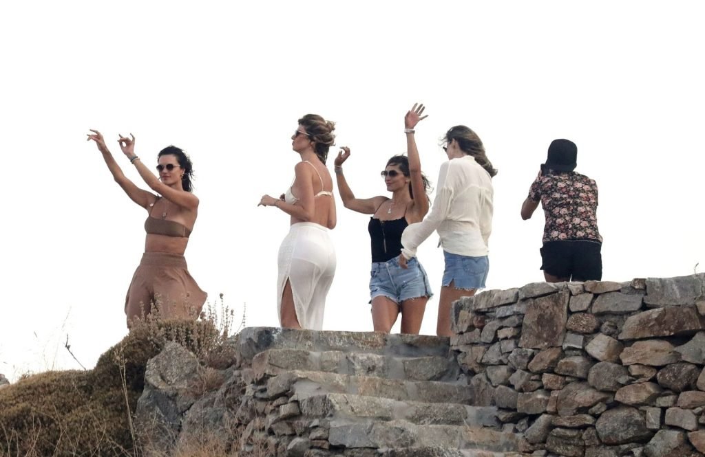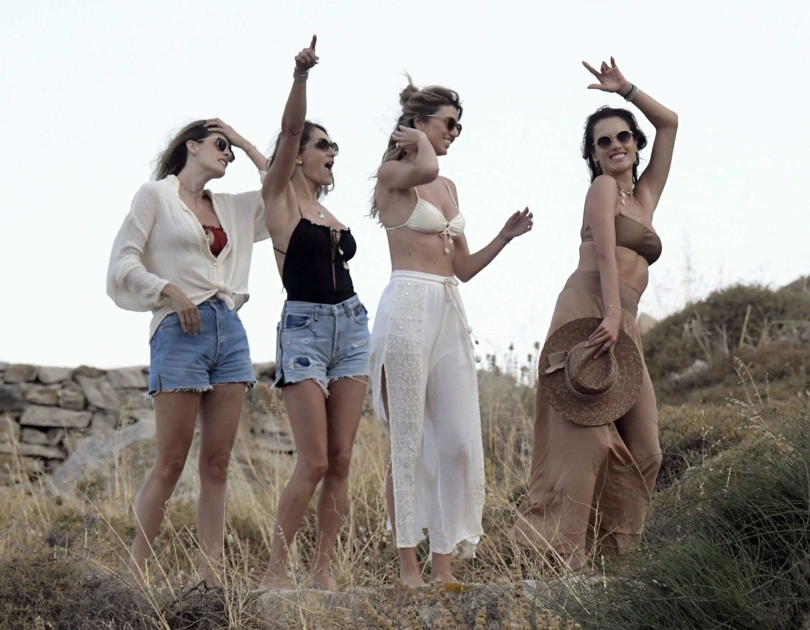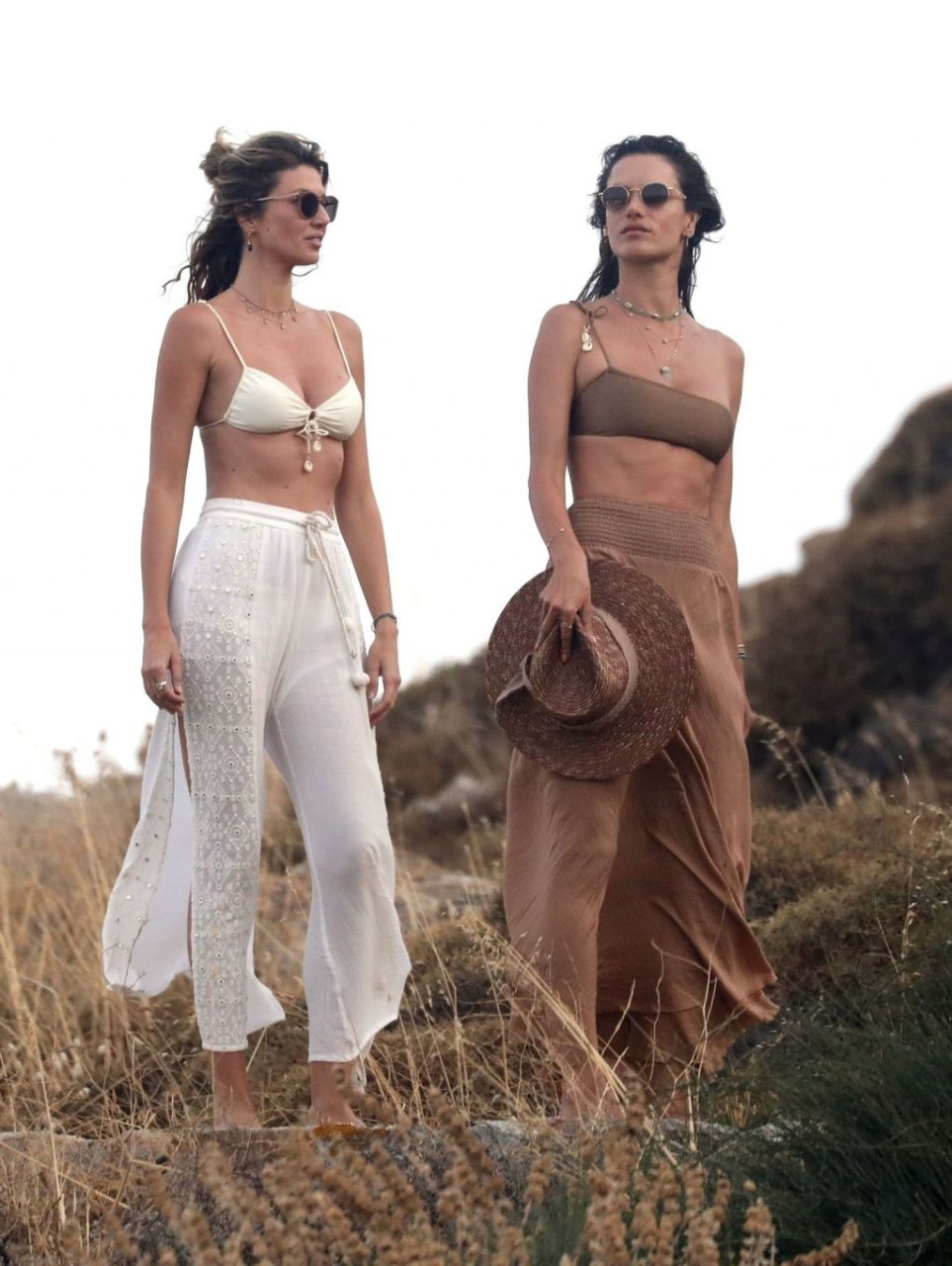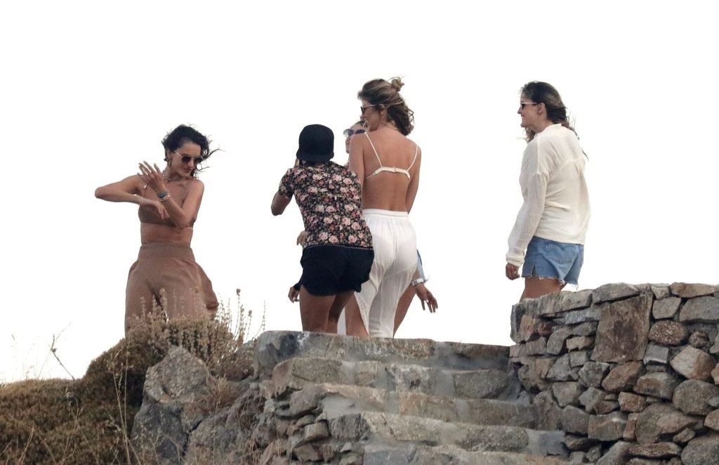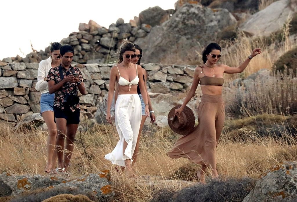 Alessandra estuvo acompañada por su hermana Aline Ambrosio y algunos amigos mientras el grupo se dirigía a la Fiesta Sunset Country, donde subieron la montaña cerca de la playa para bailar desde la parte superior de la playa al ritmo de la música del bar de playa Kensho Psarou.