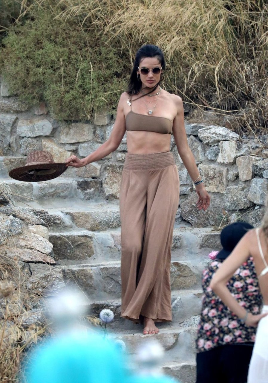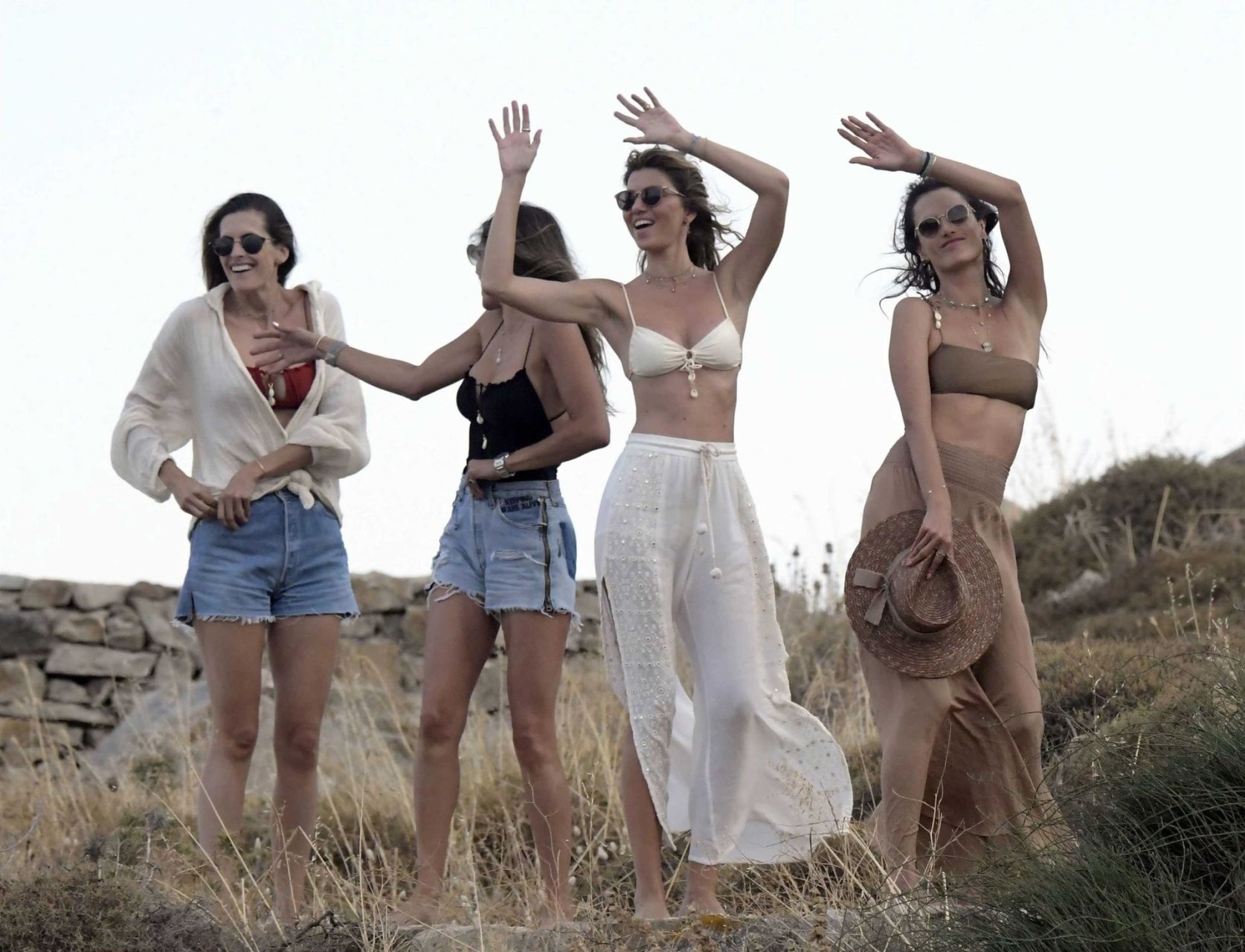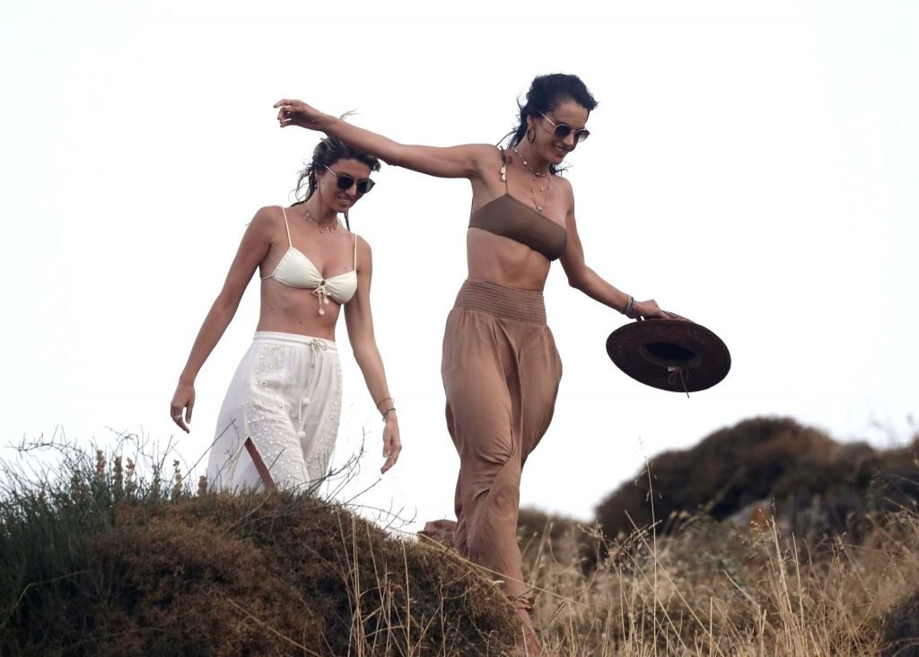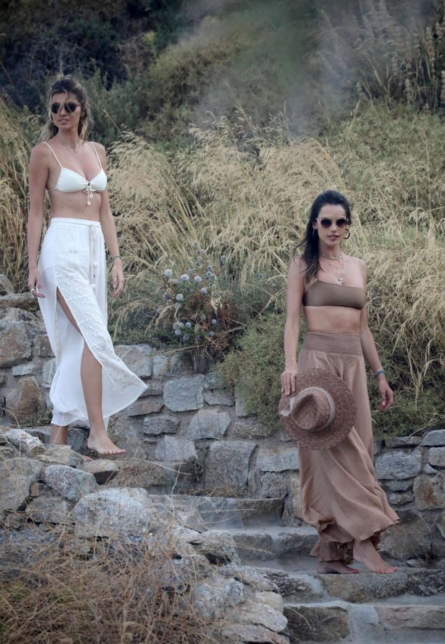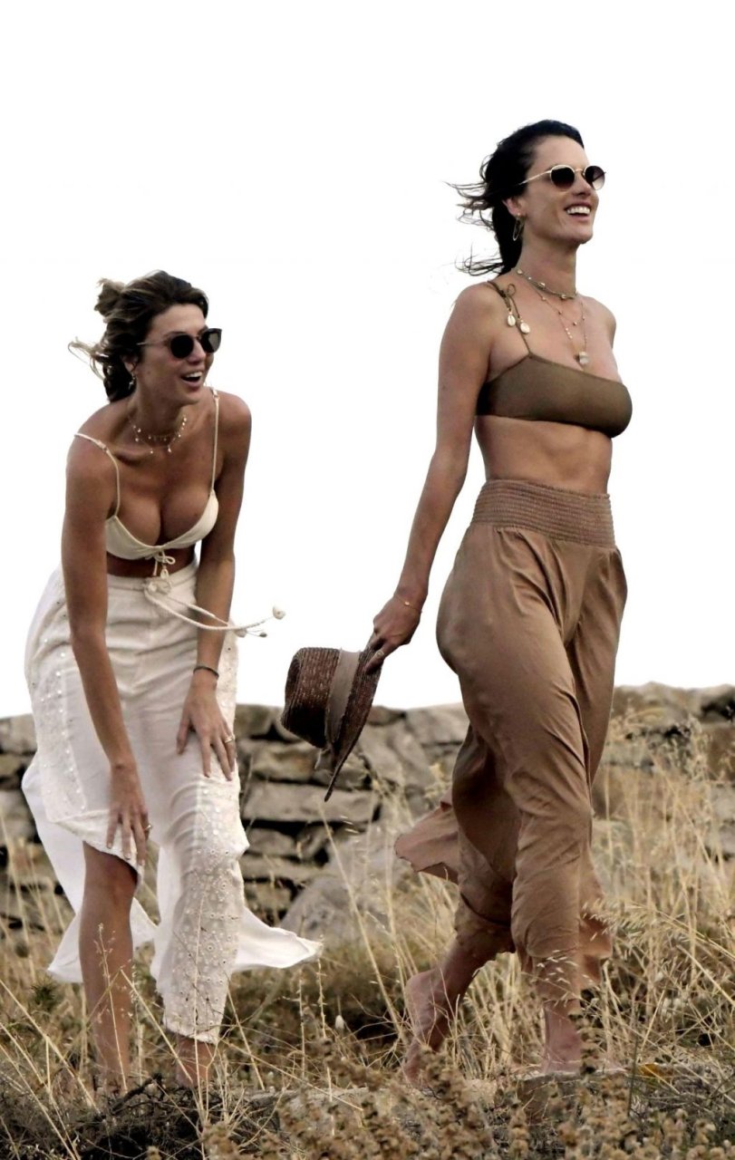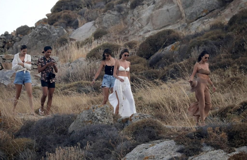 Alessandra estuvo acompañada por su hermana Aline Ambrosio y algunos amigos mientras el grupo se dirigía a la Fiesta Sunset Country, donde subieron la montaña cerca de la playa para bailar desde la parte superior de la playa al ritmo de la música del bar de playa Kensho Psarou.