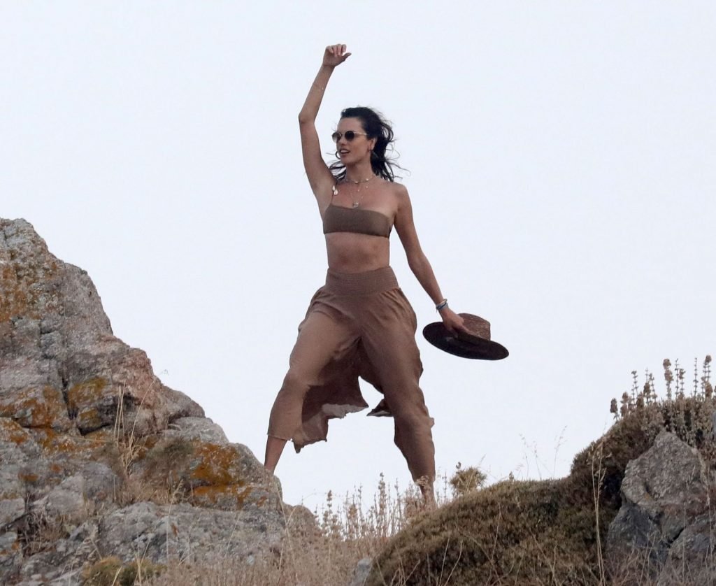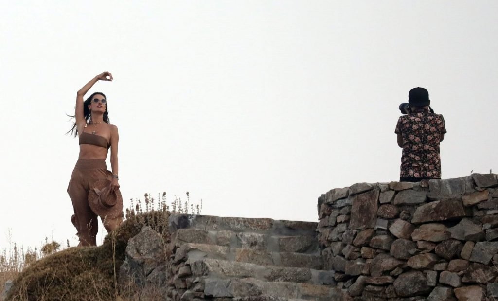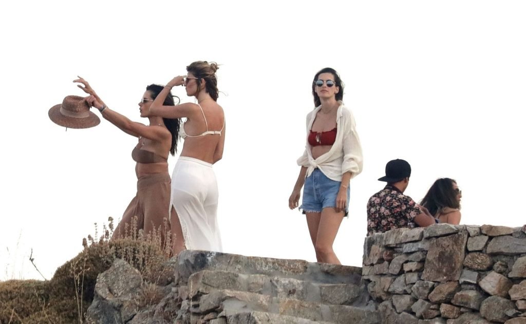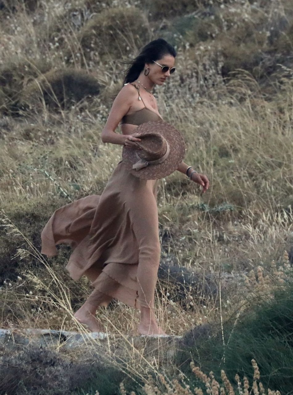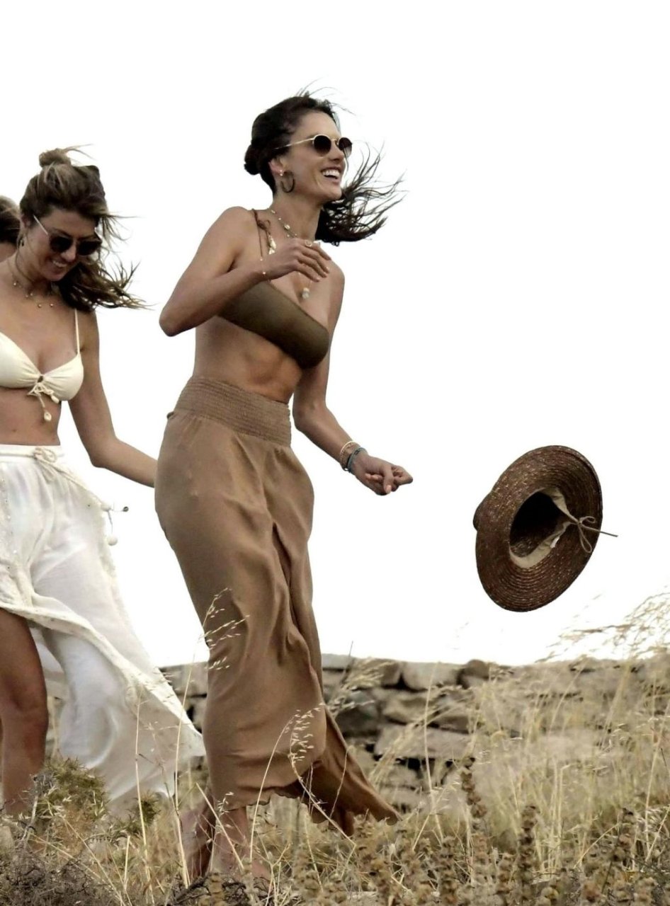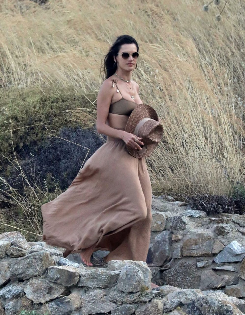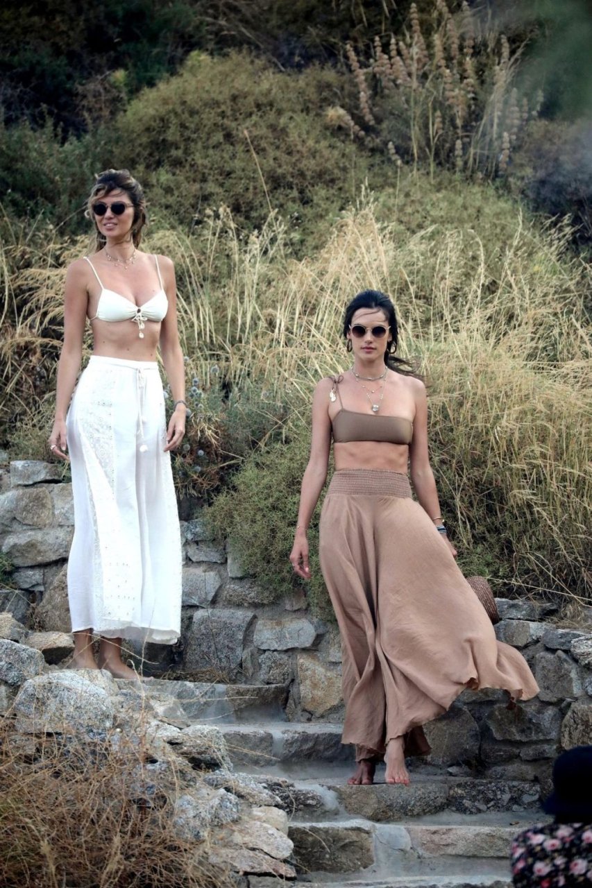 Alessandra estuvo acompañada por su hermana Aline Ambrosio y algunos amigos mientras el grupo se dirigía a la Fiesta Sunset Country, donde subieron la montaña cerca de la playa para bailar desde la parte superior de la playa al ritmo de la música del bar de playa Kensho Psarou.