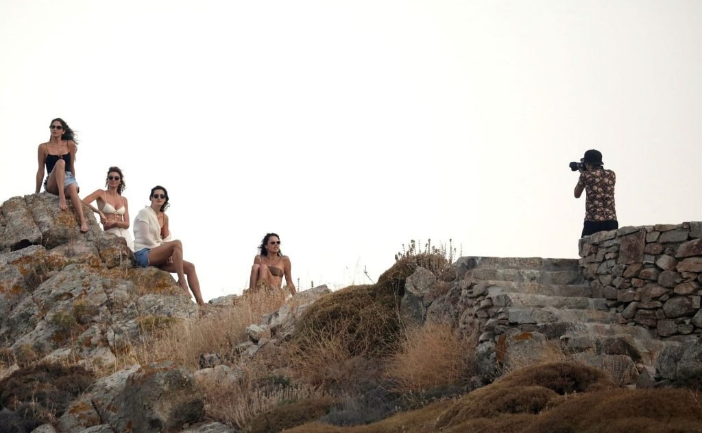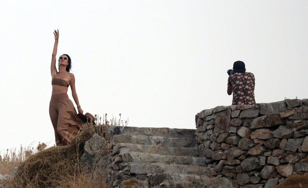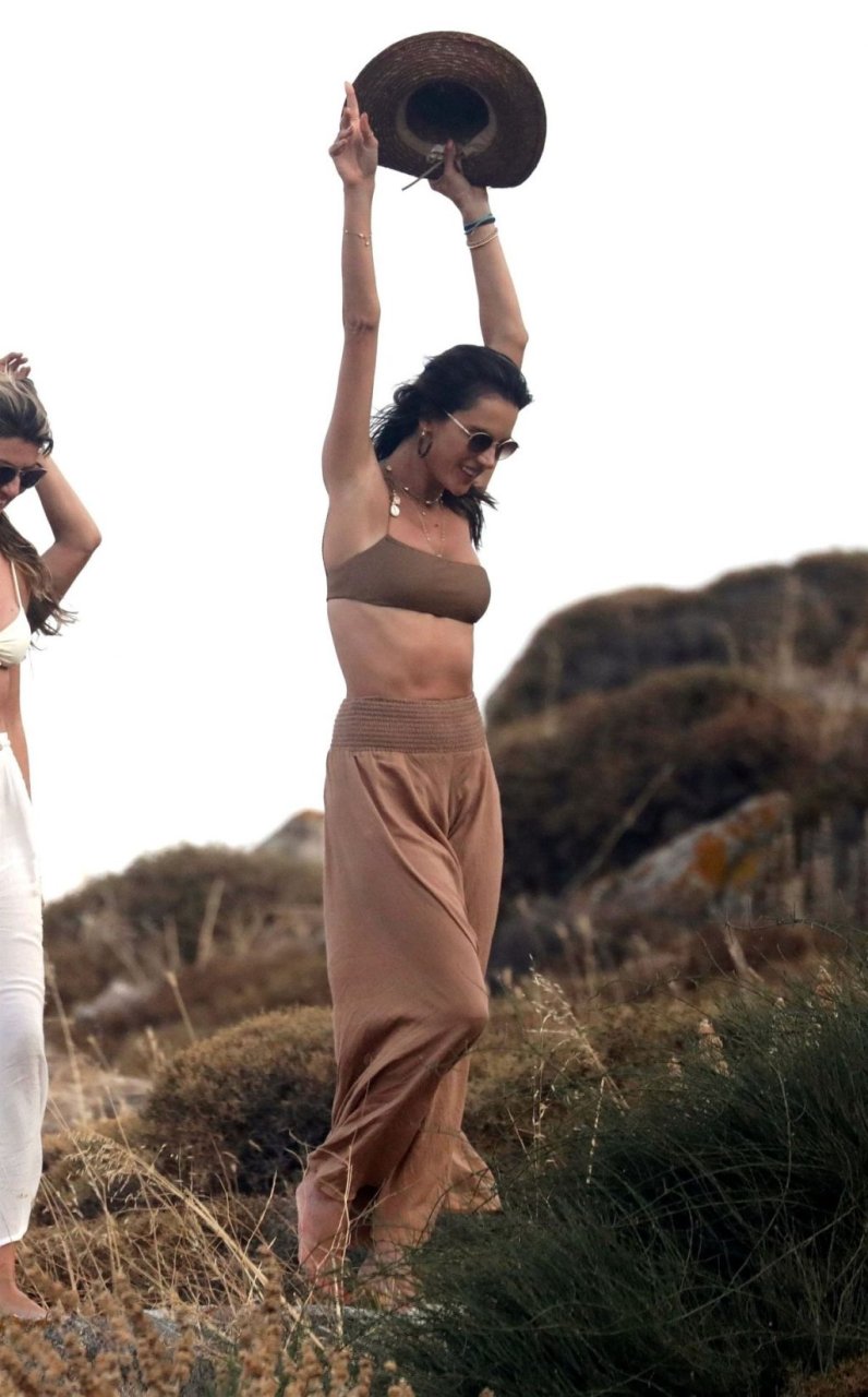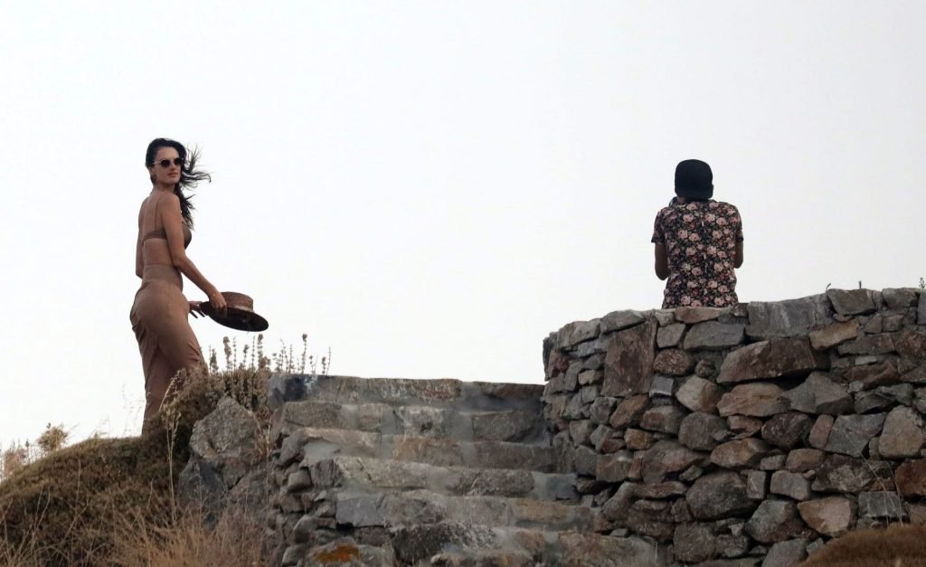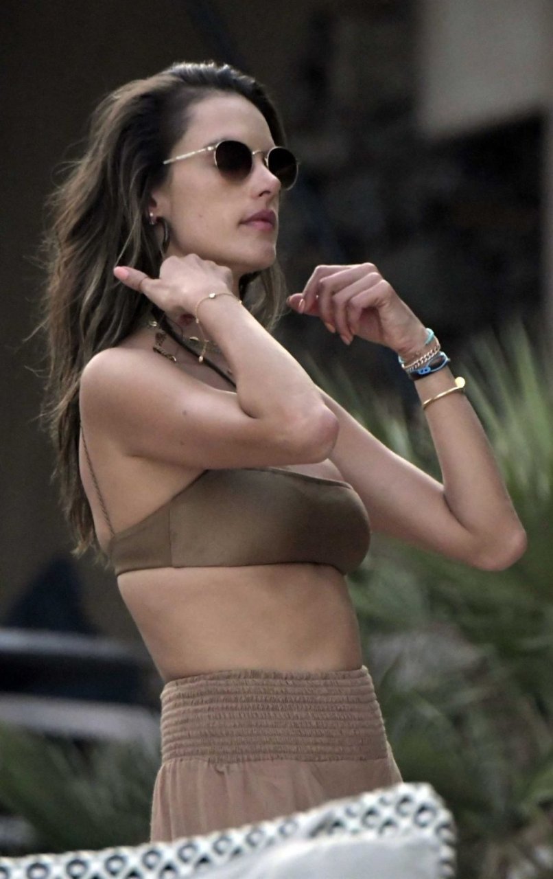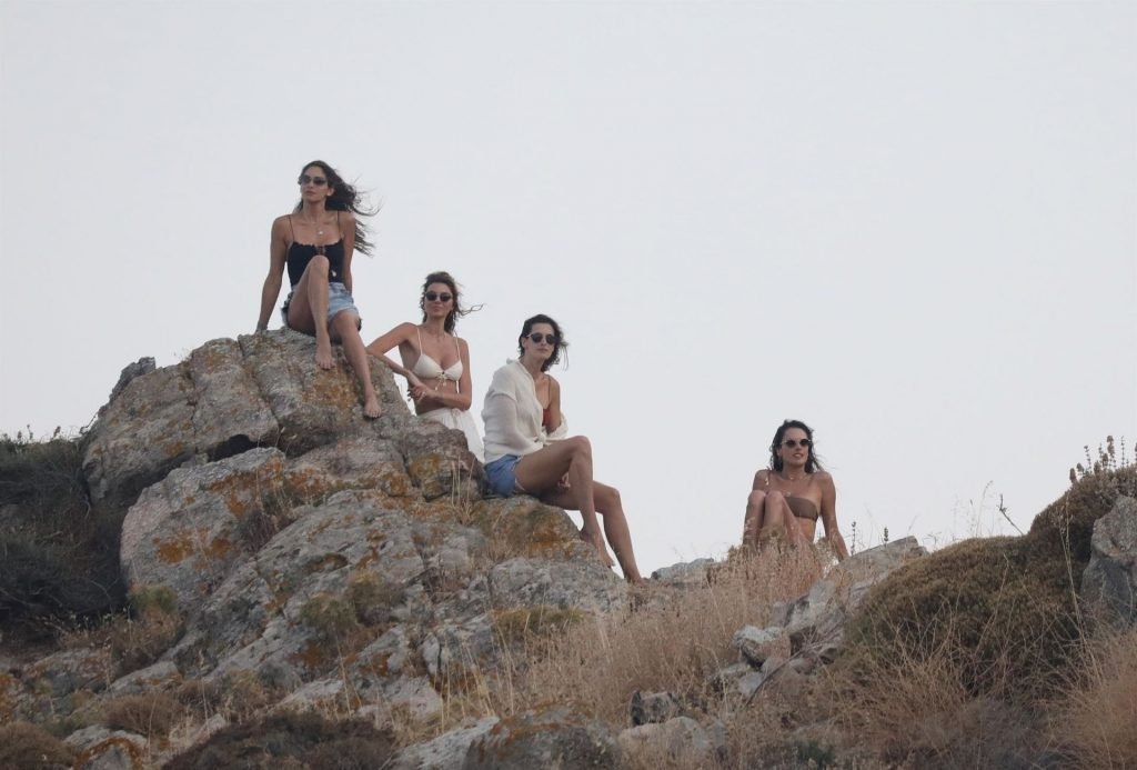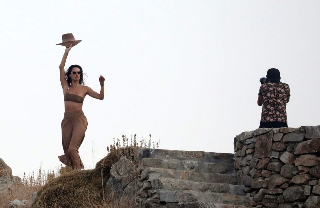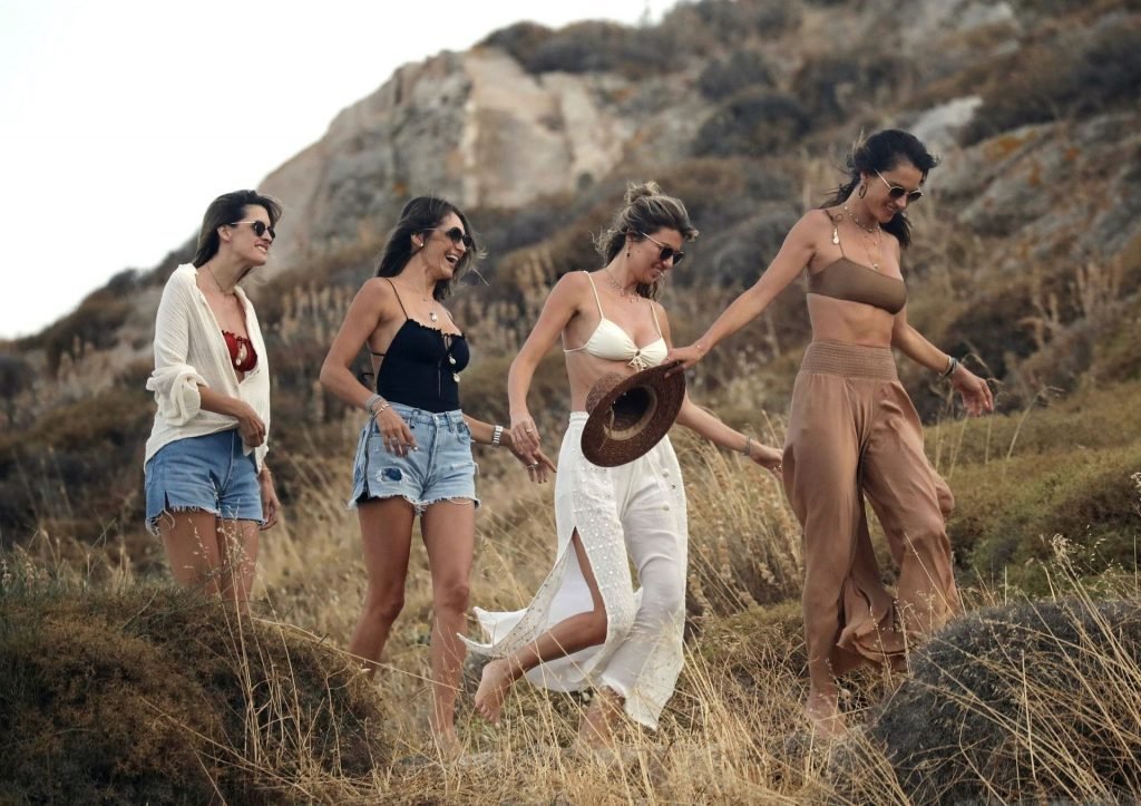Alessandra estuvo acompañada por su hermana Aline Ambrosio y algunos amigos mientras el grupo se dirigía a la Fiesta Sunset Country, donde subieron la montaña cerca de la playa para bailar desde la parte superior de la playa al ritmo de la música del bar de playa Kensho Psarou.