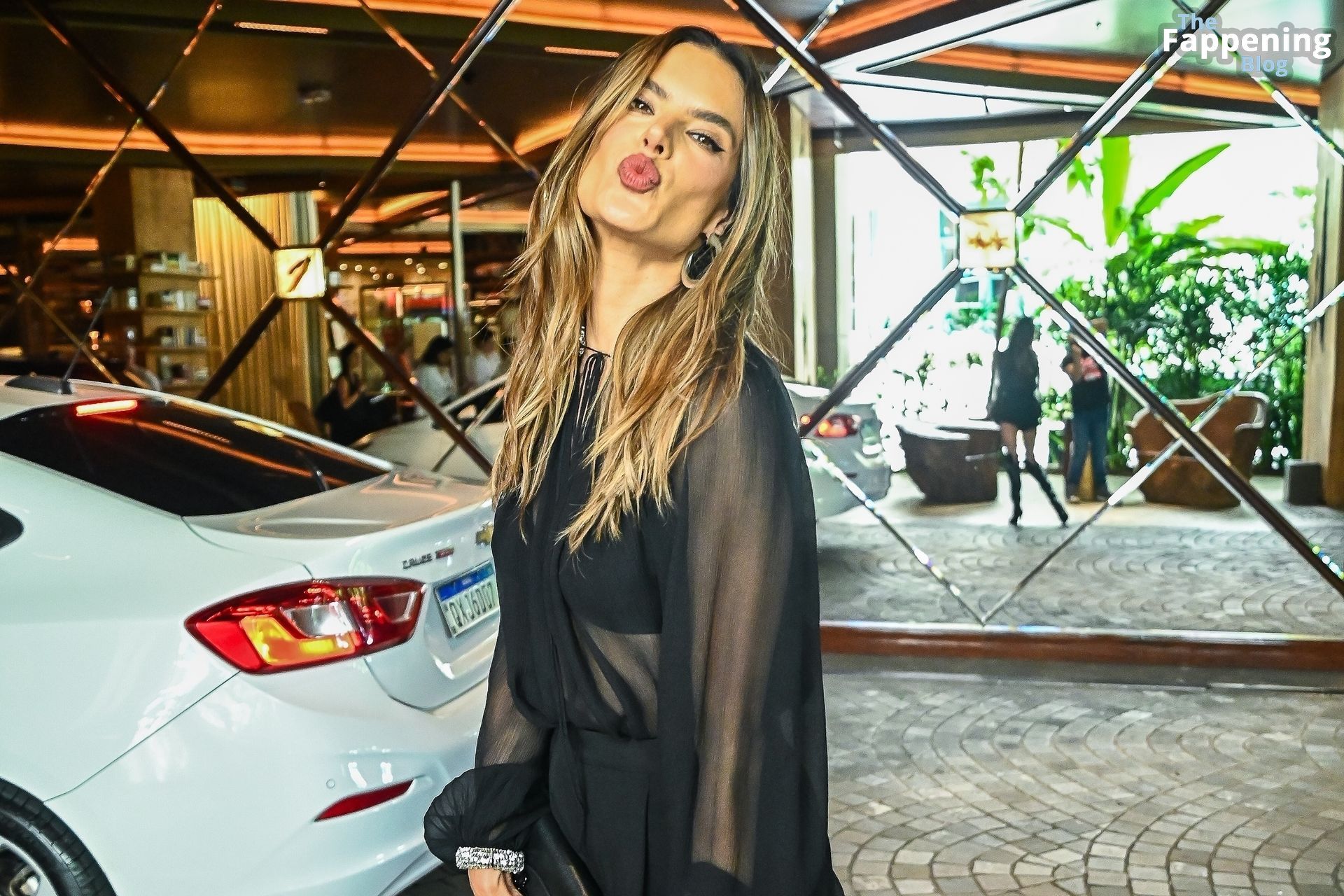 Alessandra Ambrosio lleva una blusa negra transparente y botas altas hasta el muslo, luciendo sus impresionantes piernas en un hotel de São Paulo.