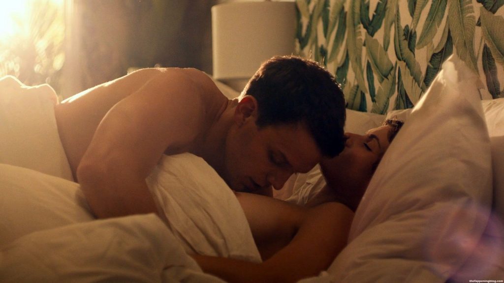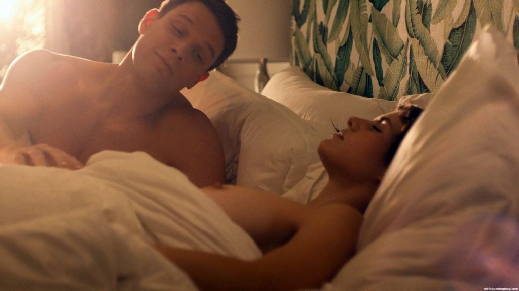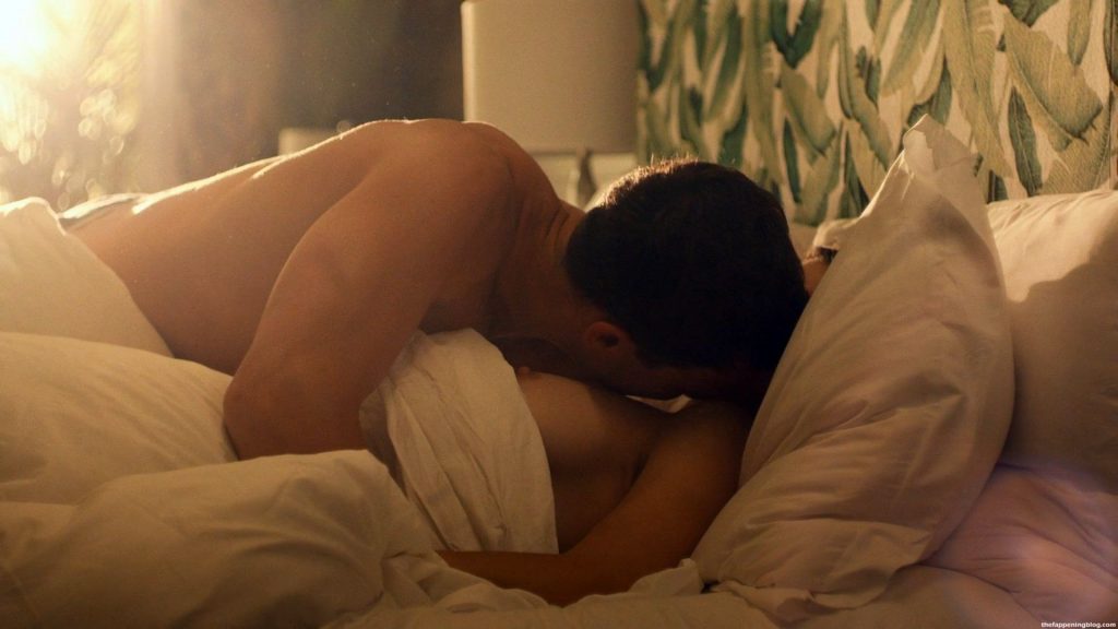 Alexandra Daddario está durmiendo desnuda boca arriba mientras un chico tira de las sábanas para descubrir su pecho izquierdo y el pezón, luego se muestra impresionado mientras lo observa antes de darse la vuelta y comenzar a besar su pecho, torso y cuello para despertarla hasta que ella lo mira y comienzan a besarse lentamente.