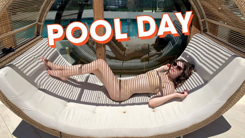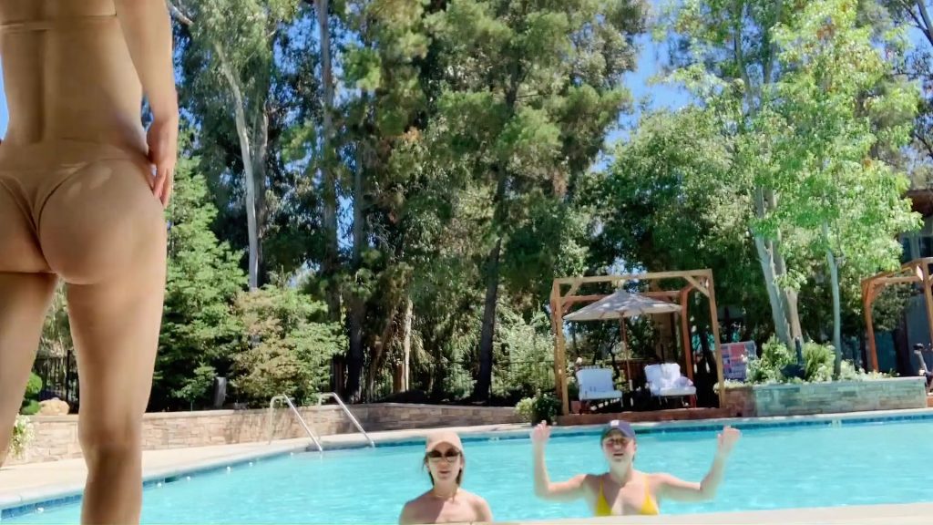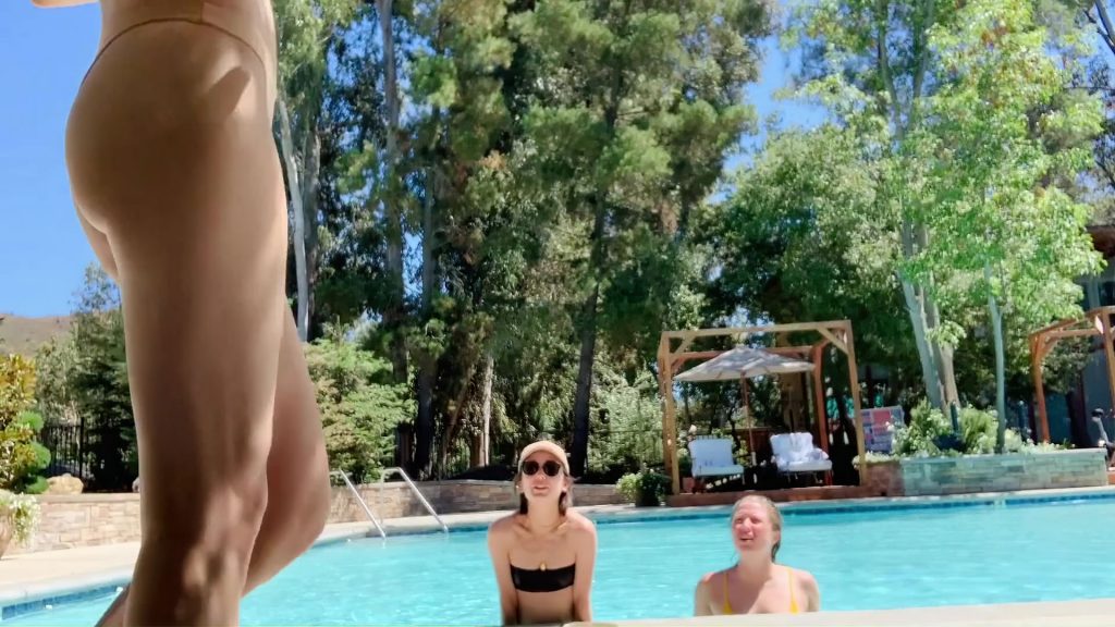 La actriz/modelo Alexandra Daddario muestra sus pechos y trasero en un bikini mientras disfruta un día con sus amigas Kate y Morgan en la piscina (agosto 2020).