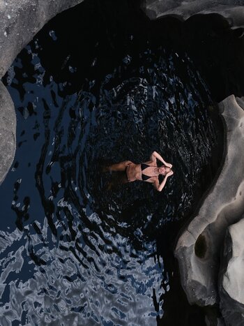 Alexandra Kabi muestra sus pechos desnudos mientras posa sin camiseta en una sesión de fotos en la playa.