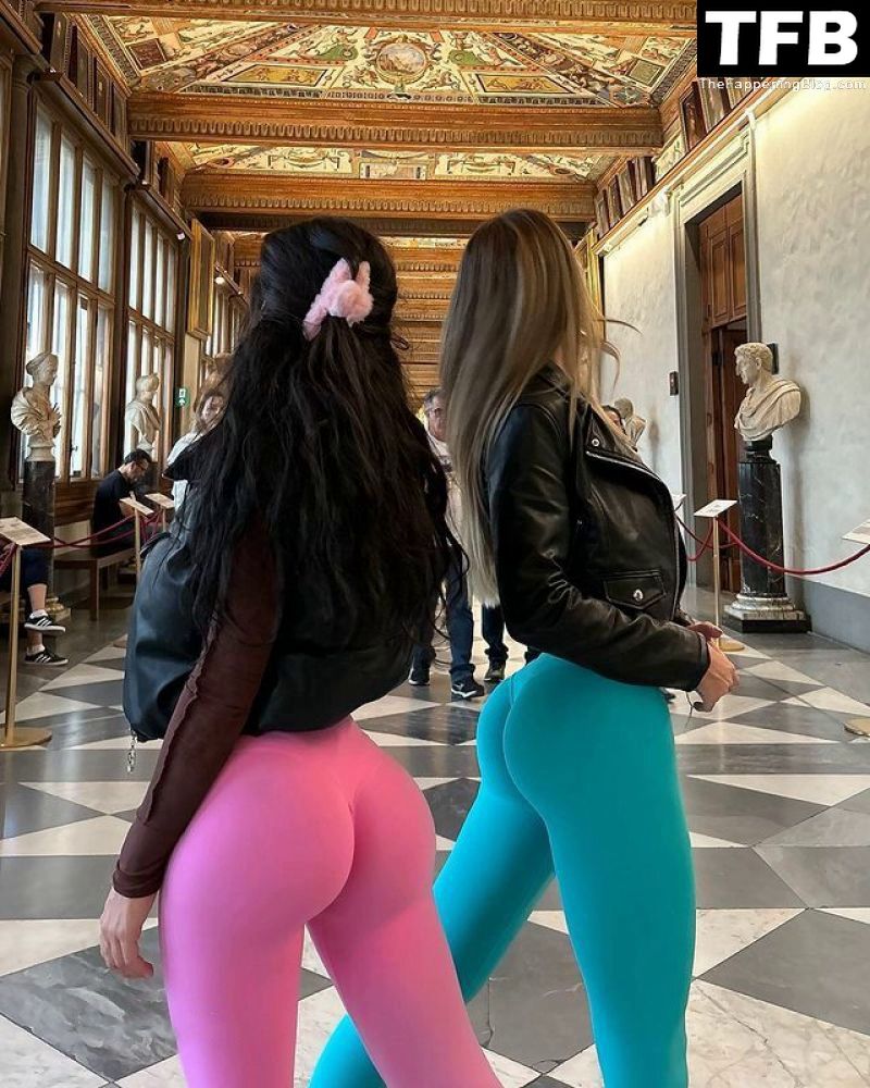 Modelos Alexis Mucci y Eva Menta muestran sus pechos desnudos mientras posan con tops transparentes sin sujetador en el museo italiano, 26/10/2022.