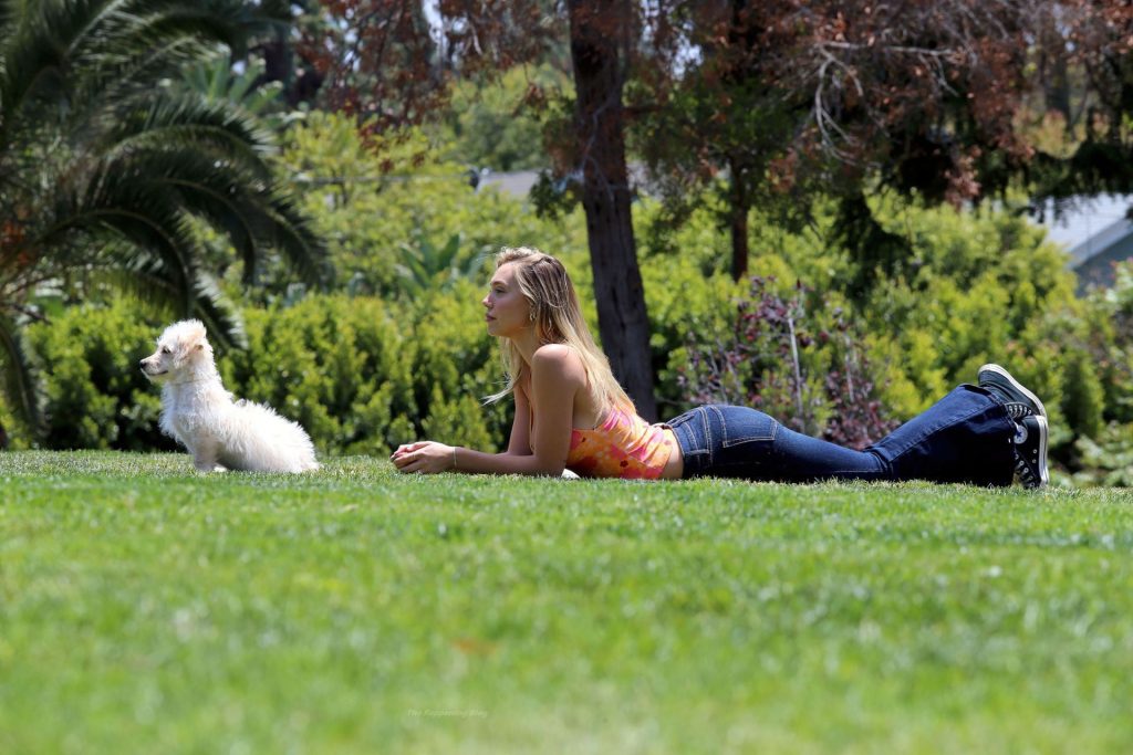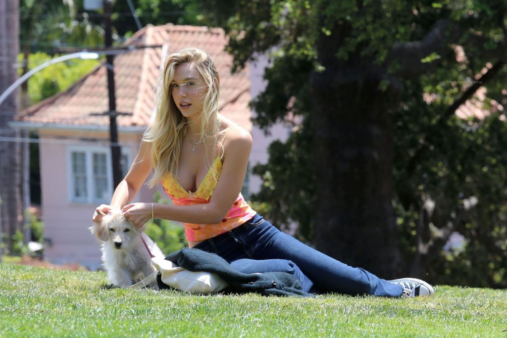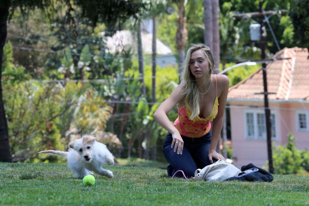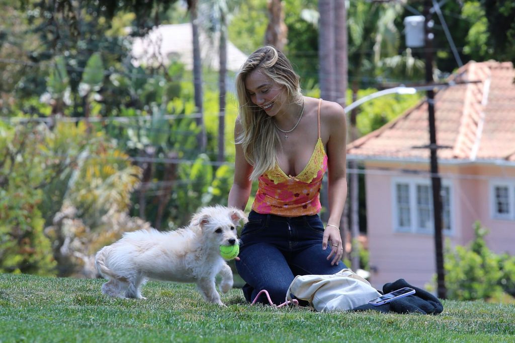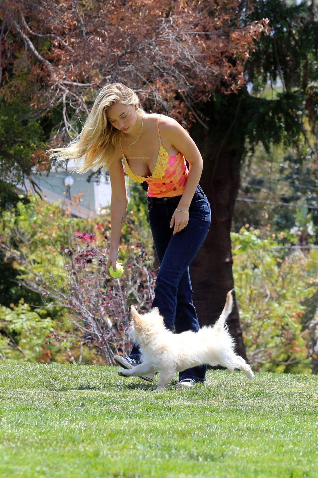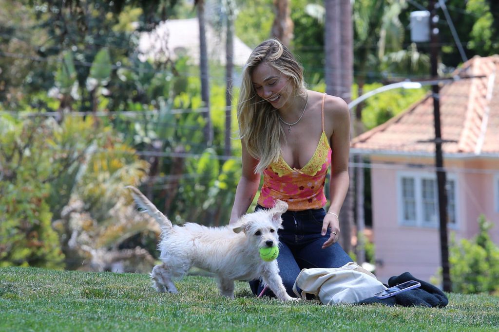 Alexis Ren se ve pasando un buen rato con su cachorro Angel en un parque local, 28/04/2021.