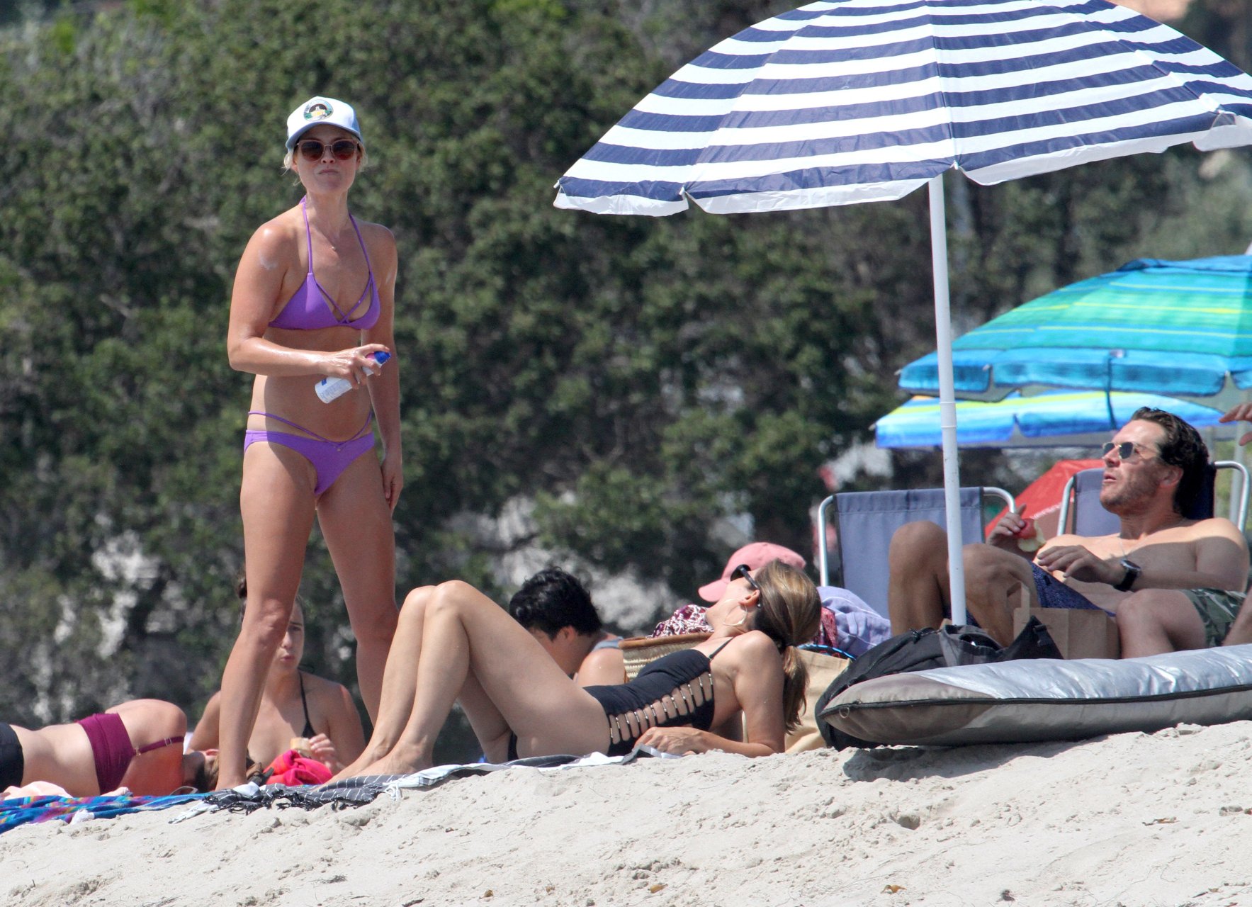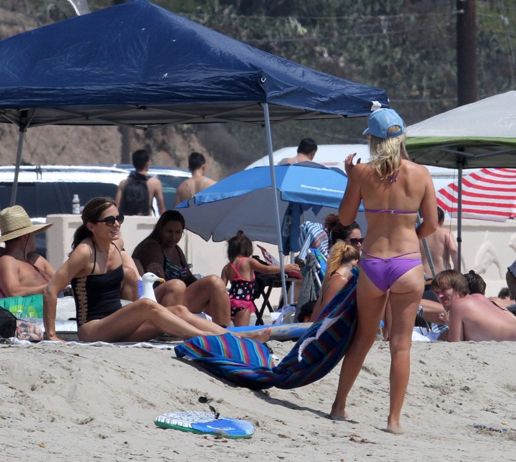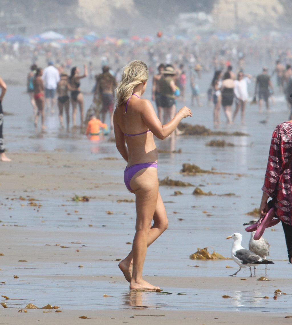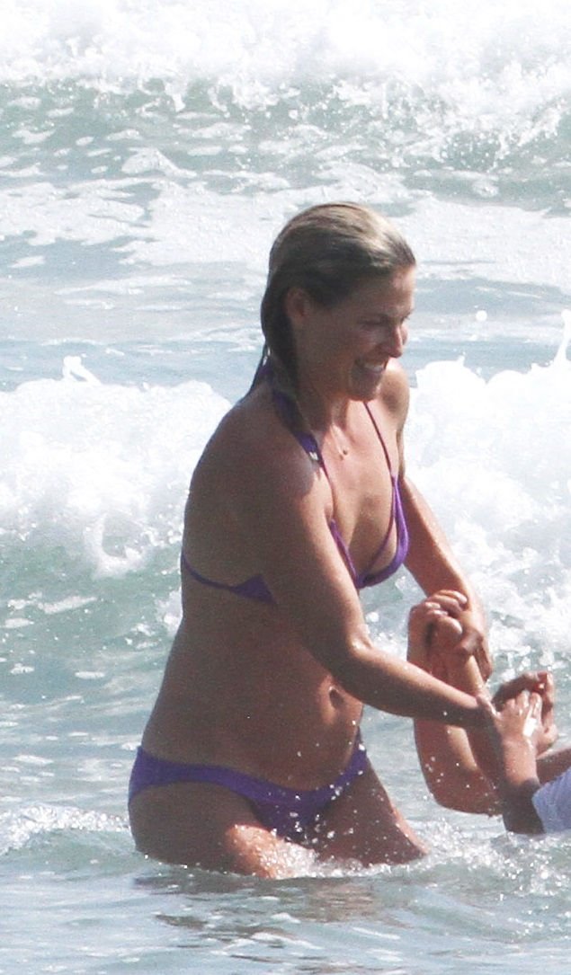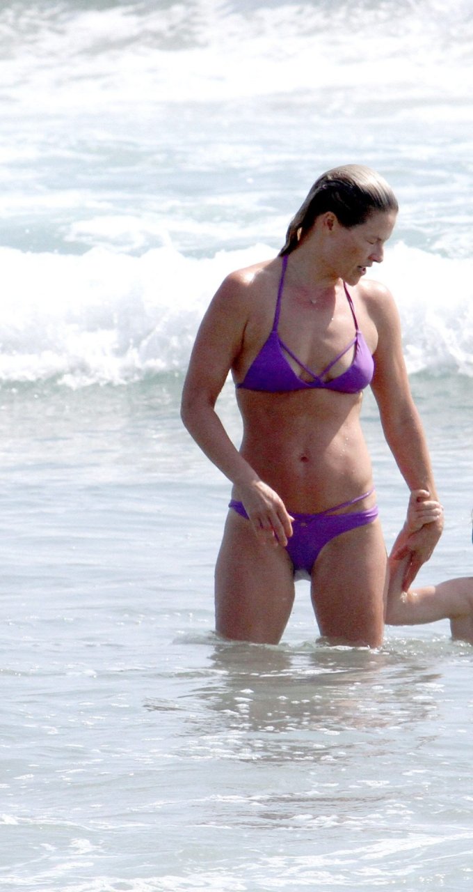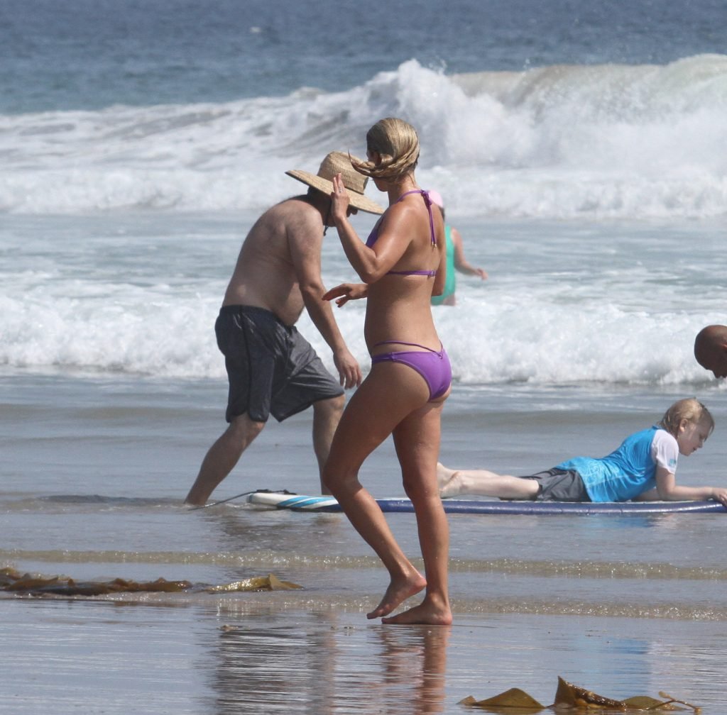 Ali Larter fue vista usando un bikini haciendo caras divertidas mientras se aplicaba aceite de loción bronceadora, nadando en el océano con sus hijos y su esposo Hayes MacArthur en la playa de Malibu, 14/08/2018. Alison Elizabeth (Ali) Larter es una actriz estadounidense y exmodelo. Edad: 42.