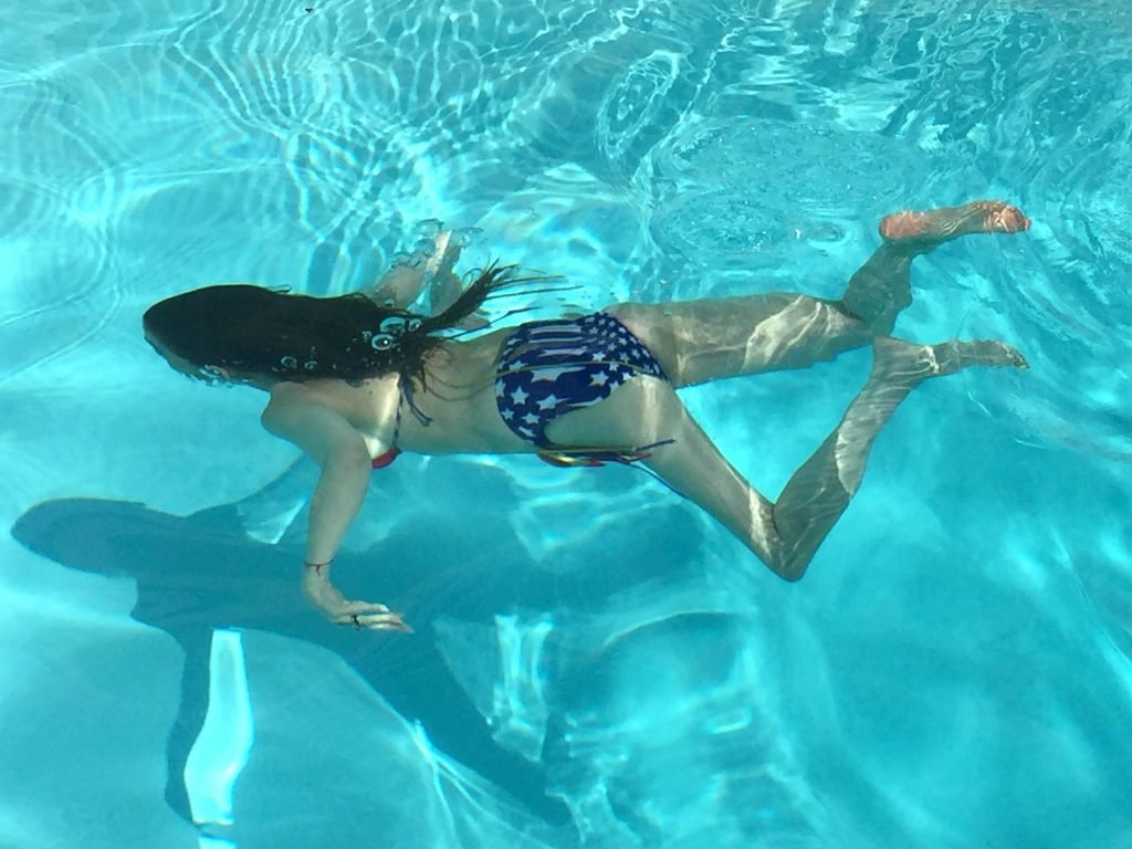“Baywatch” actriz Alicia Arden relajándose en su bikini de Wonder Woman en el pop-up “Wonder Spa” en San Diego Comic-Con, 18/07/2019. Arden ha estado en los titulares recientemente debido a su informe policial temprano contra Jeffrey Epstein.