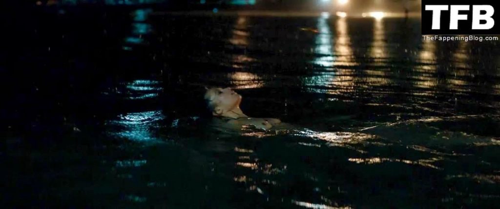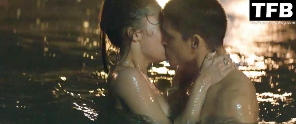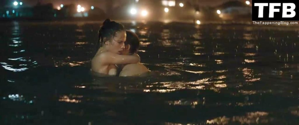 Alicia Vikander está sin camiseta con un par de panties mientras camina hacia las olas del océano por la noche, mirando hacia atrás por encima del hombro a un chico en la playa. Luego vemos más de sus pechos mientras nada de espaldas en el agua antes de que el chico se una a ella, momento en el que se besan y Alicia le rodea con los brazos.