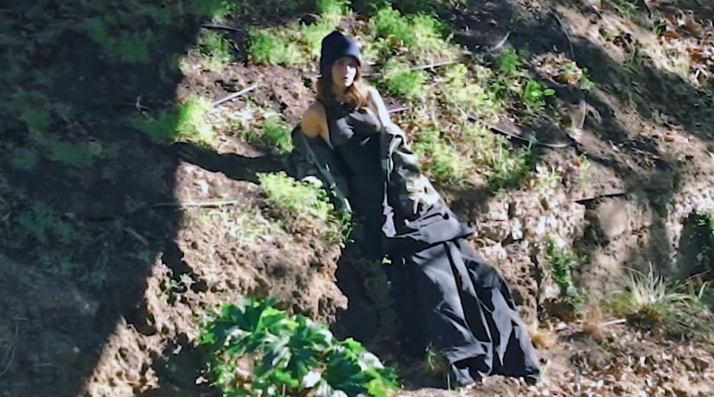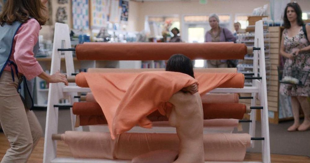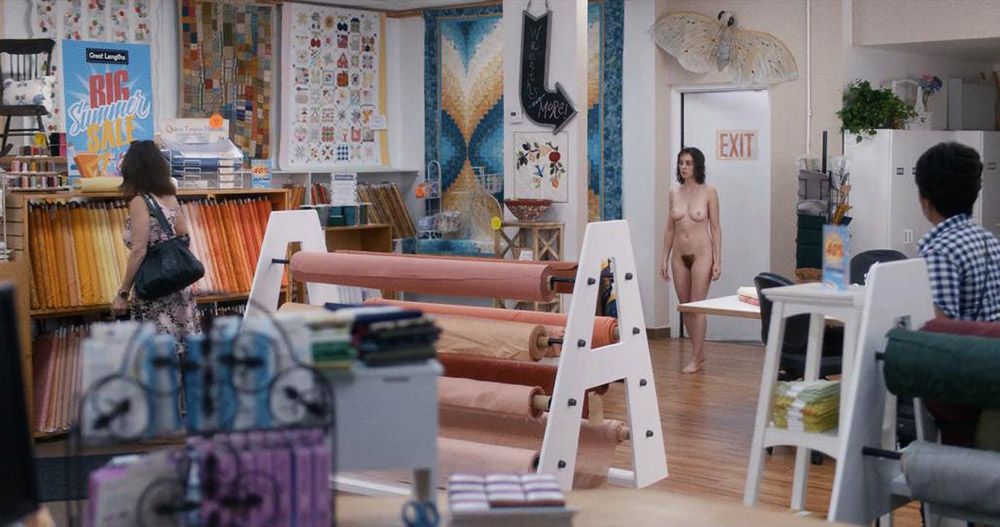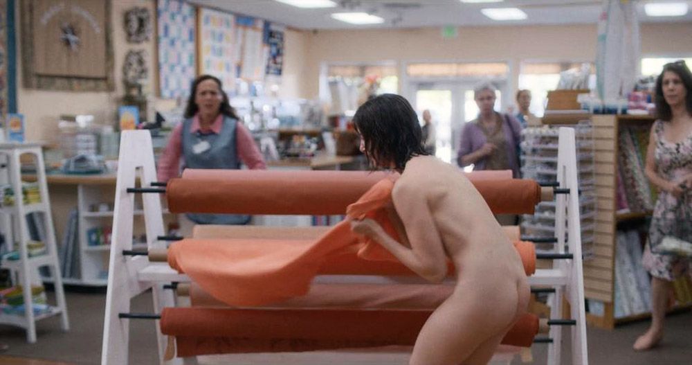 Alison Brie is seen stepping fully nude onto the floor of a store. We can see her nude boobs and hairy pussy as she walks forward and people stare at her. She then moves near a rack of fabric and kneels. Someone helps her cover-up by wrapping her in the fabric. This is the newest scene from 2020.