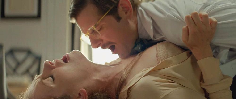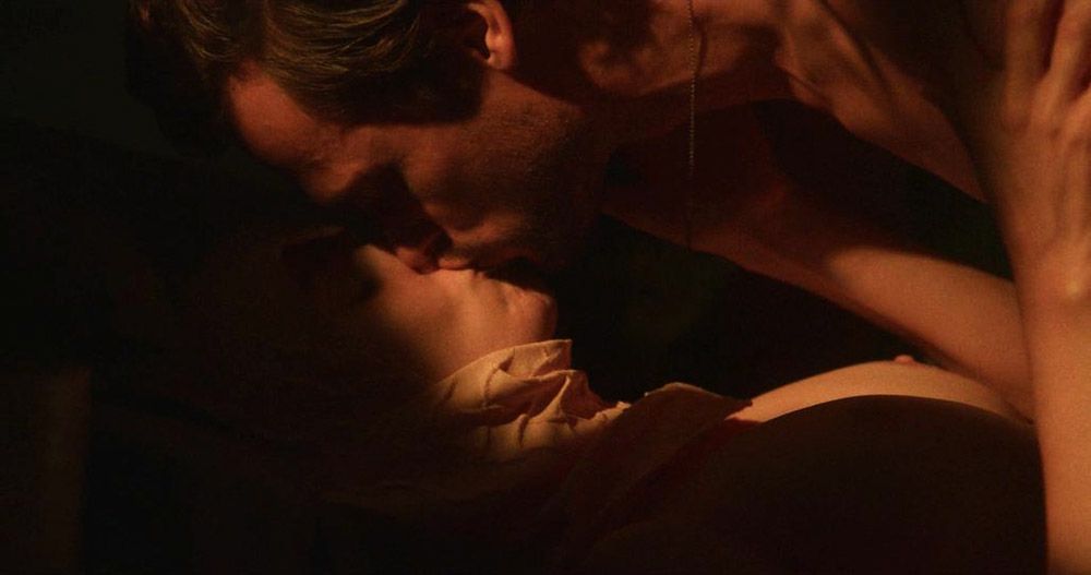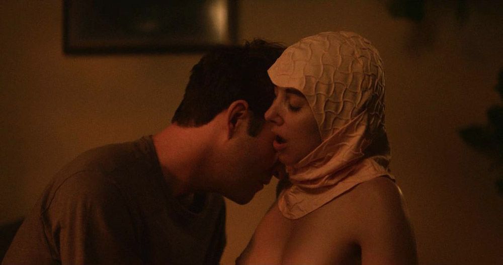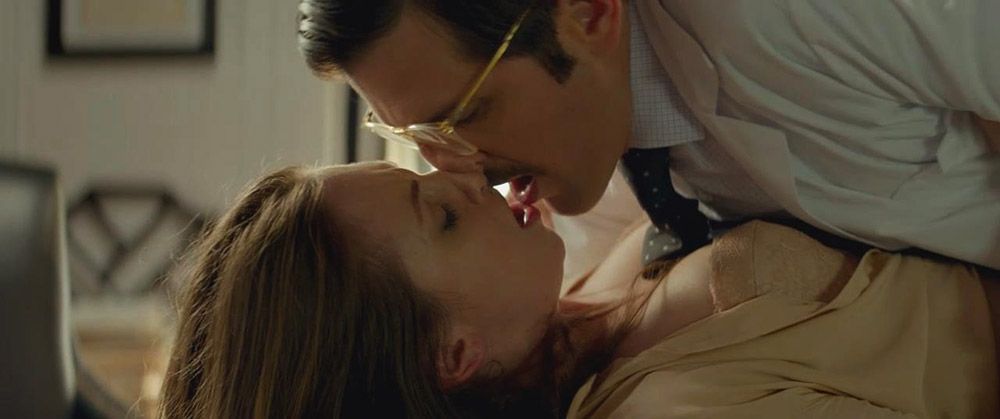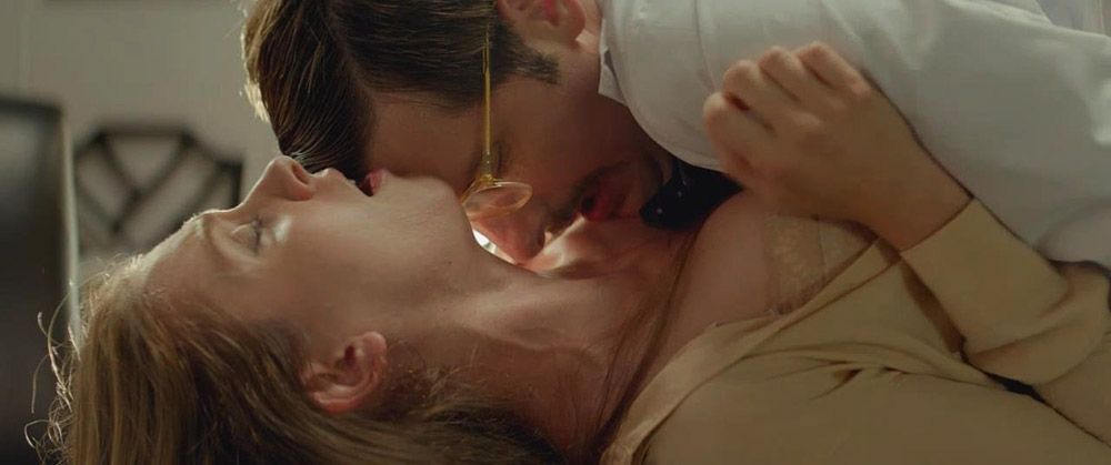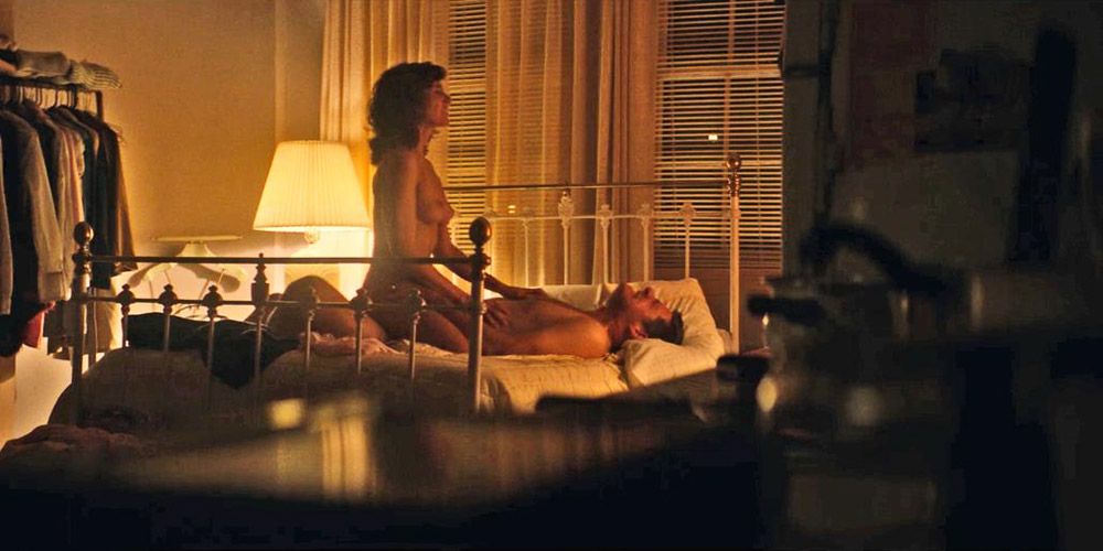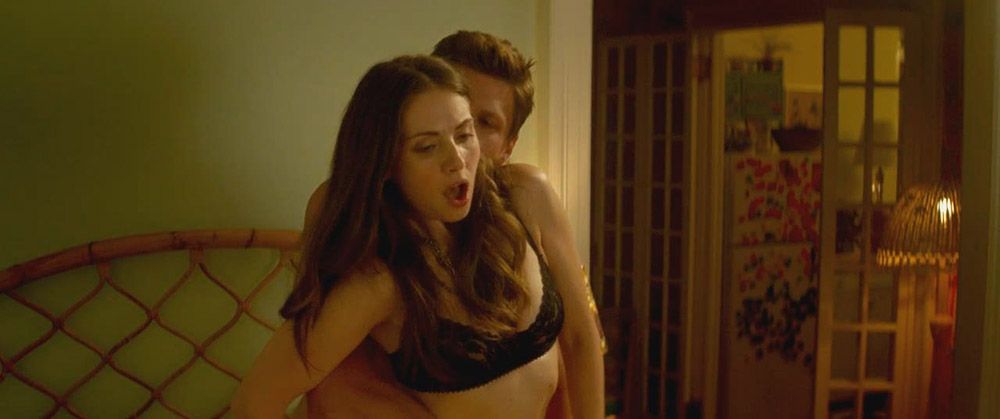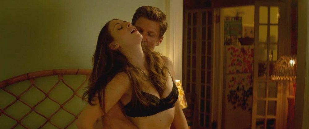 In the same movie, Alison Brie is making out with a guy as he unbuttons her shirt. She is lying back on a table with her bra and cleavage exposed as the guy leans over to have sex with her.