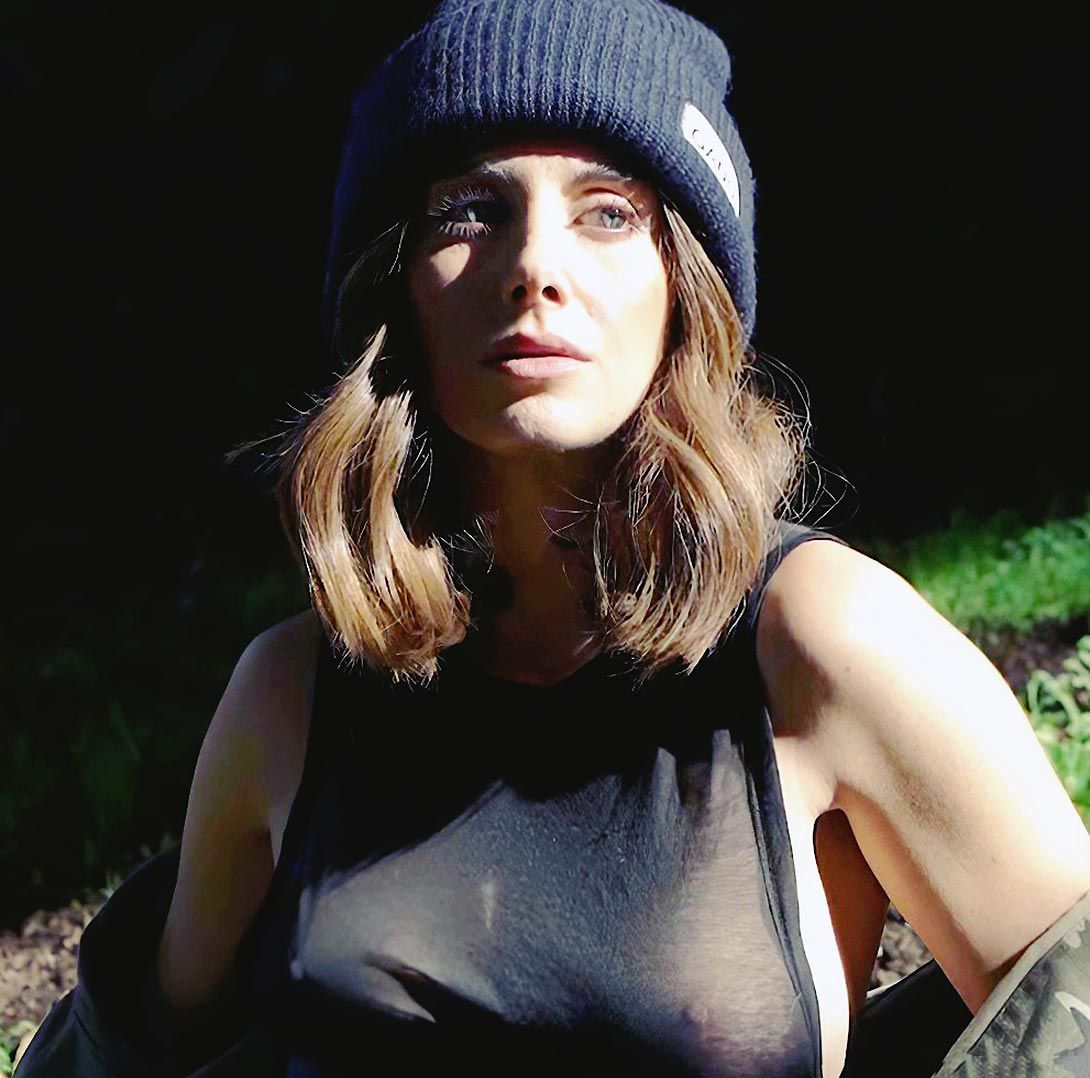 Let’s now take a look at some nice shots of Alison Brie’s boobs! First, she showed us her tits and nipples through a thin see-through shirt that she was wearing! Then, in a new sexy video for Basic Magazine, she poses in a see-through black T-shirt! We have some photos as well as the video from the shoot! So folks, keep scrolling down and enjoy!