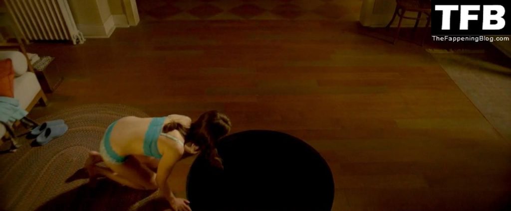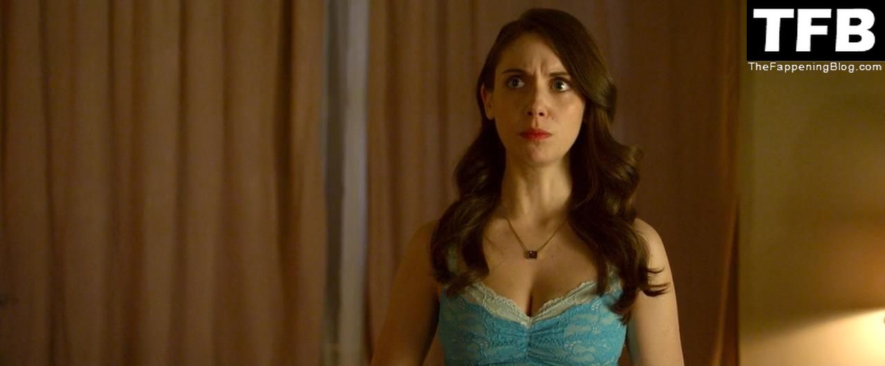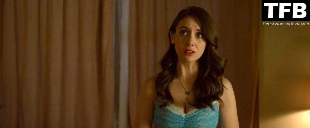 La estrella de The Fappening Alison Brie está de pie frente a un hombre mientras se desnuda hasta quedar con un sujetador y bragas azules que dejan ver el escote. Habla con el hombre un rato mientras está en ropa interior antes de que, después de un tiempo, el hombre desaparezca por un agujero en el suelo.