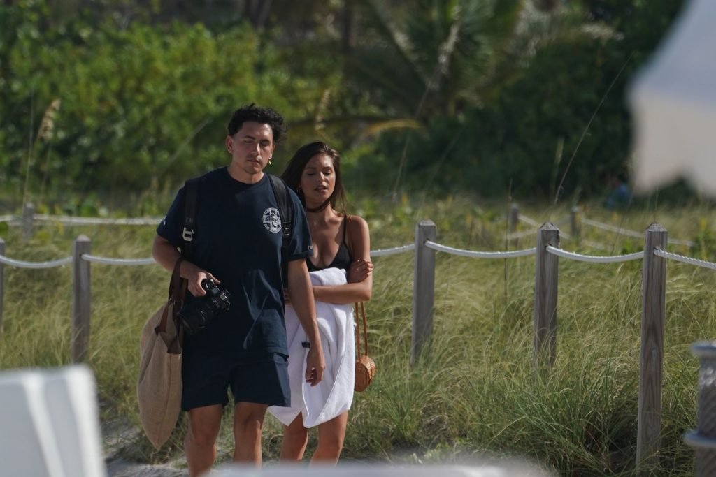 La actriz canadiense Alyssa Lynch lleva un traje de baño blanco de una pieza en una sesión de fotos en la playa en Miami Beach, 17/07/2019.