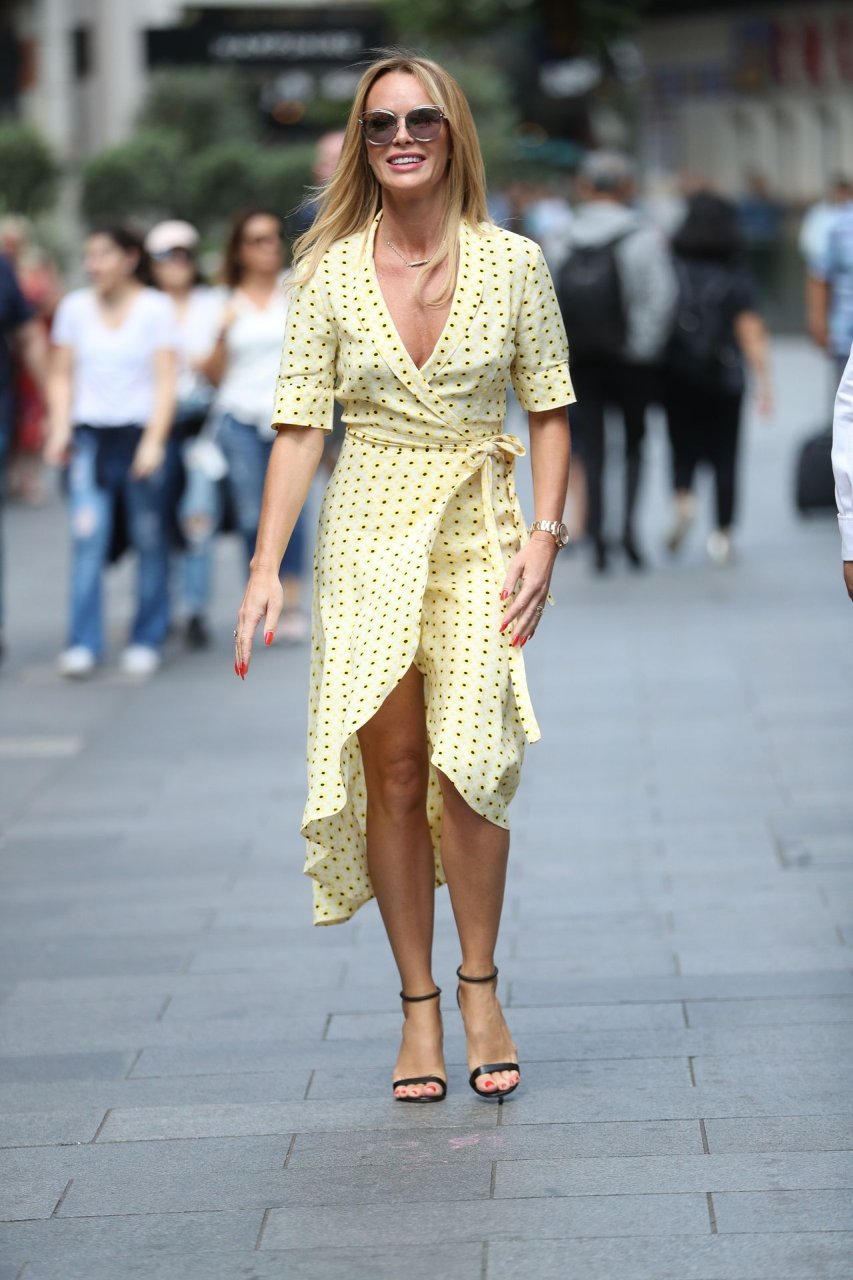 Presentadora de televisión Amanda Holden muestra sus largas piernas con un atrevido vestido amarillo con lunares y una abertura alta mientras salía de Heart Radio, Global House en Londres, 07/08/2019.