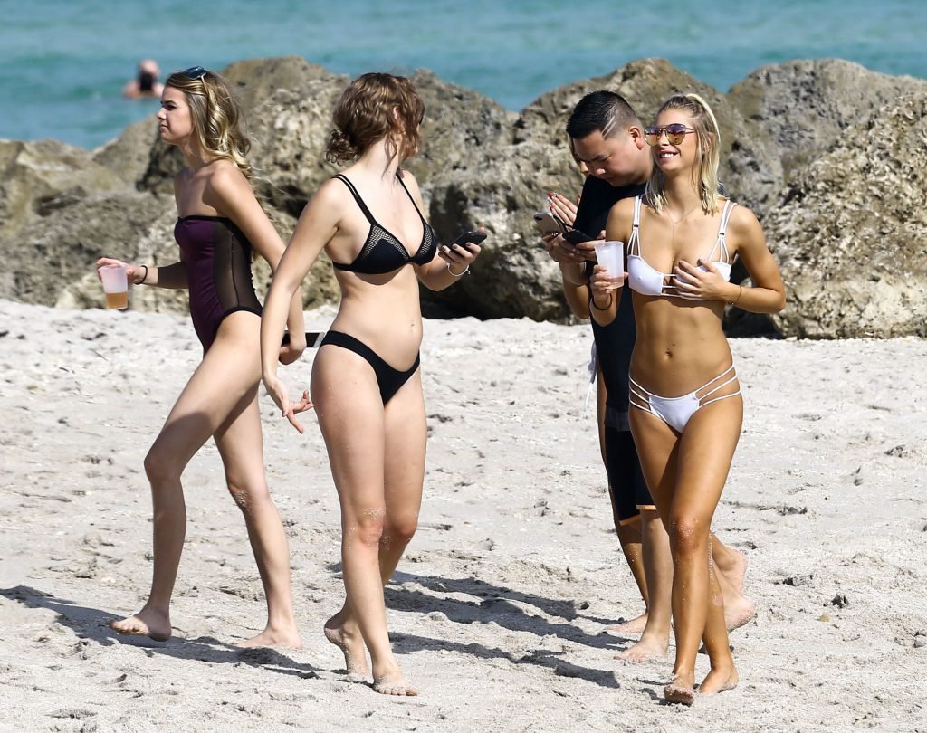 Models Amanda Kaylor and Callie Cattaneo fueron capturadas en la playa con amigos en Miami, Florida, 15/12/2016. La pareja se tomó selfies y disfrutó de algunos cócteles antes de volver adentro.