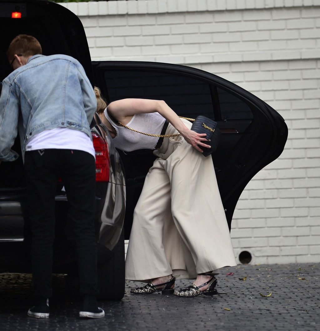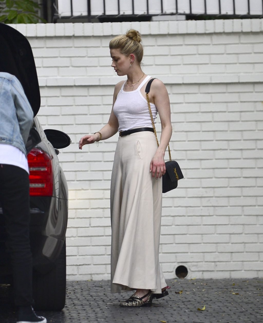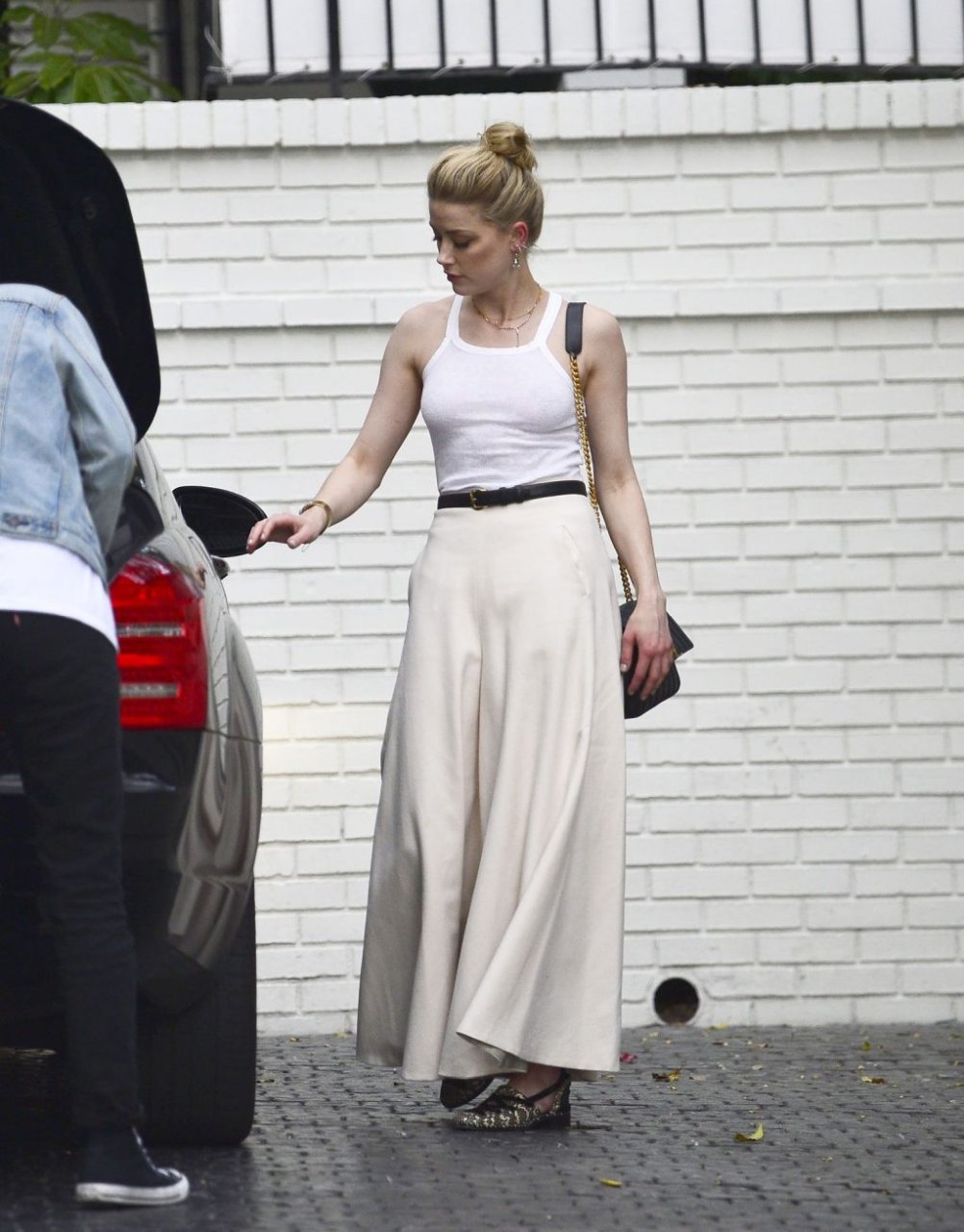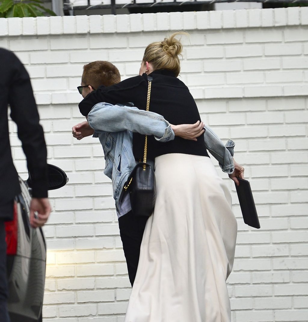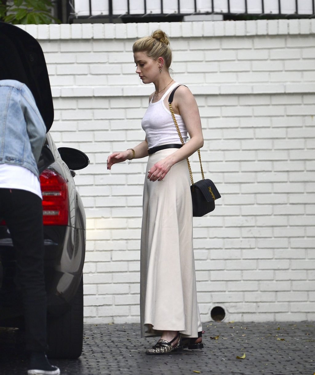 La actriz y estrella de The Fappening Amber Heard intenta subirse a la espalda de un amigo mientras llega al Hotel Chateau Marmont en Los Ángeles, 04/01/2019. La actriz de 32 años llevaba una camiseta sin mangas blanca, chaqueta negra, pantalones holgados y zapatos de piel de serpiente.