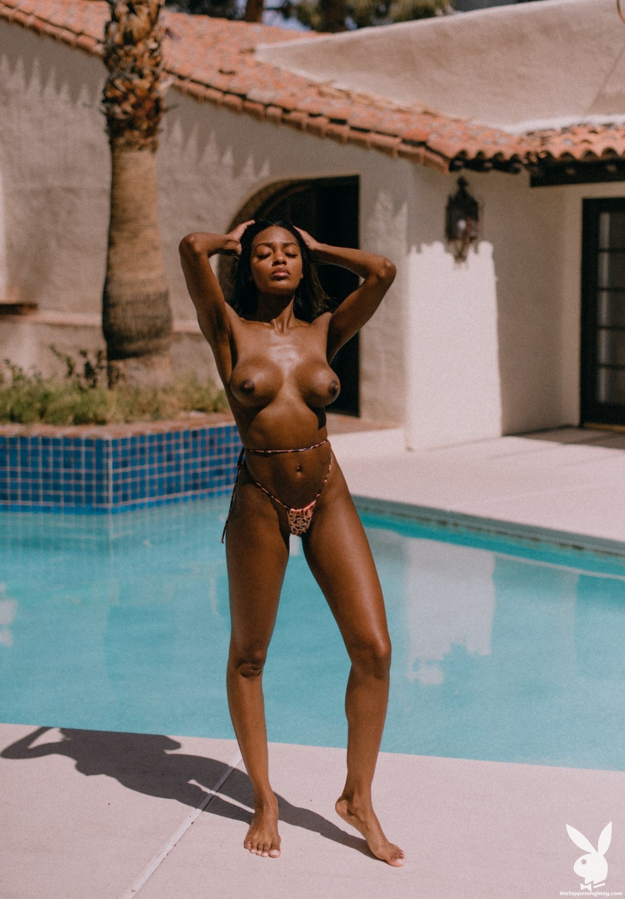 Chocolate babe Amber Rose con sus extraños pechos posa desnuda junto a la piscina y en la ducha en una sesión de fotos para Playboy Plus (2021). Originaria de Wichita, Kansas, Amber es amable, una nerd autoproclamada y una madre que es nueva en el sitio para hombres.