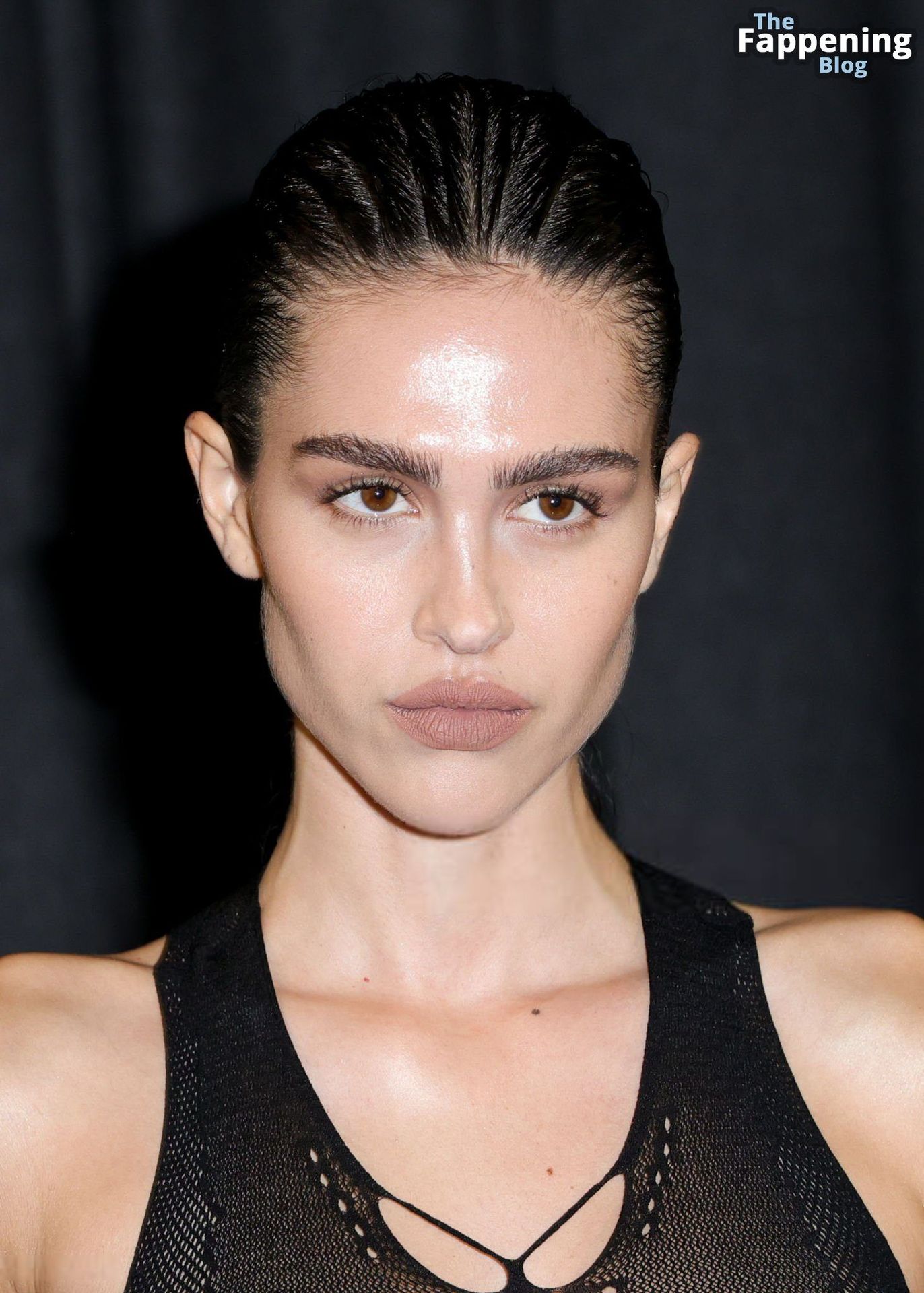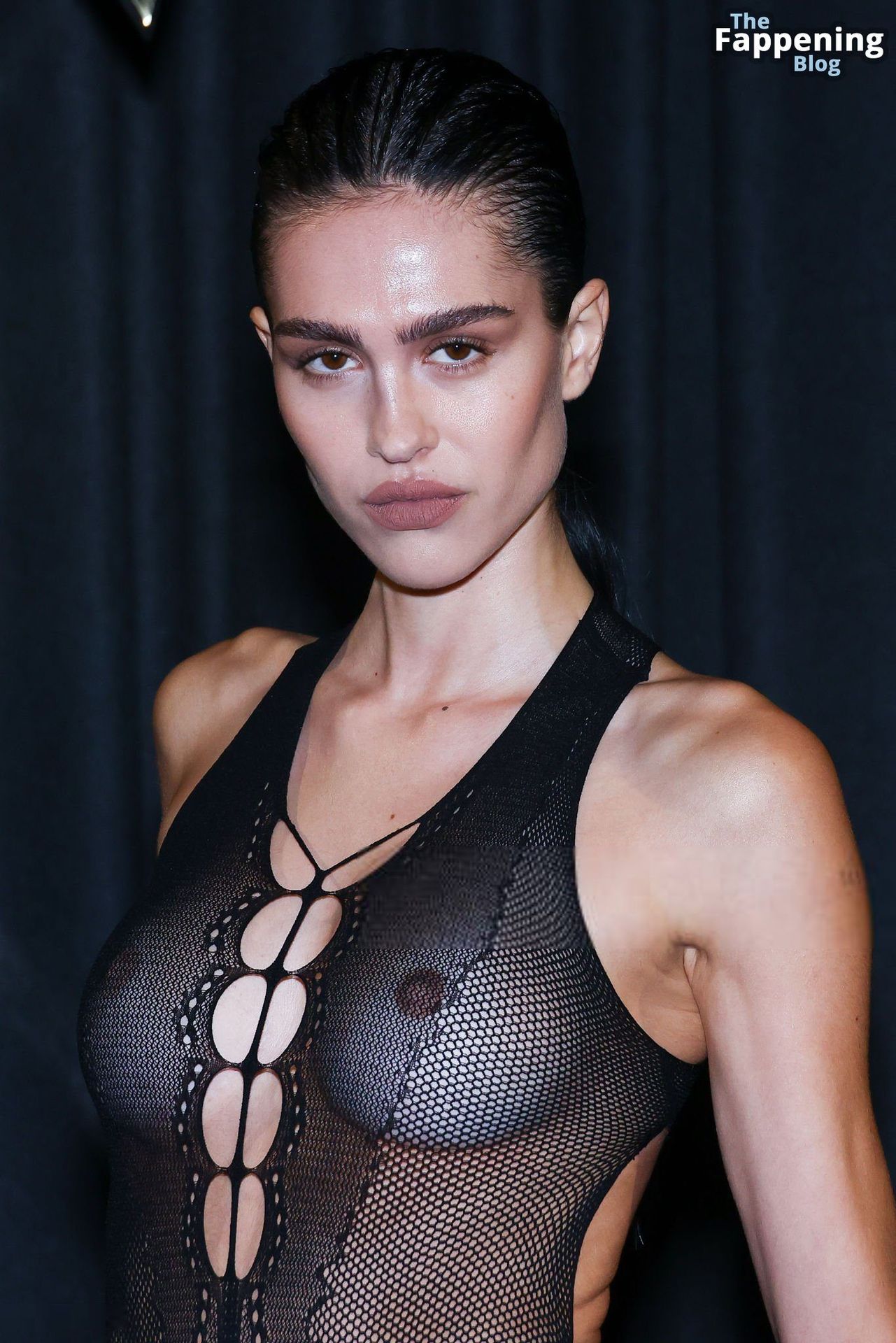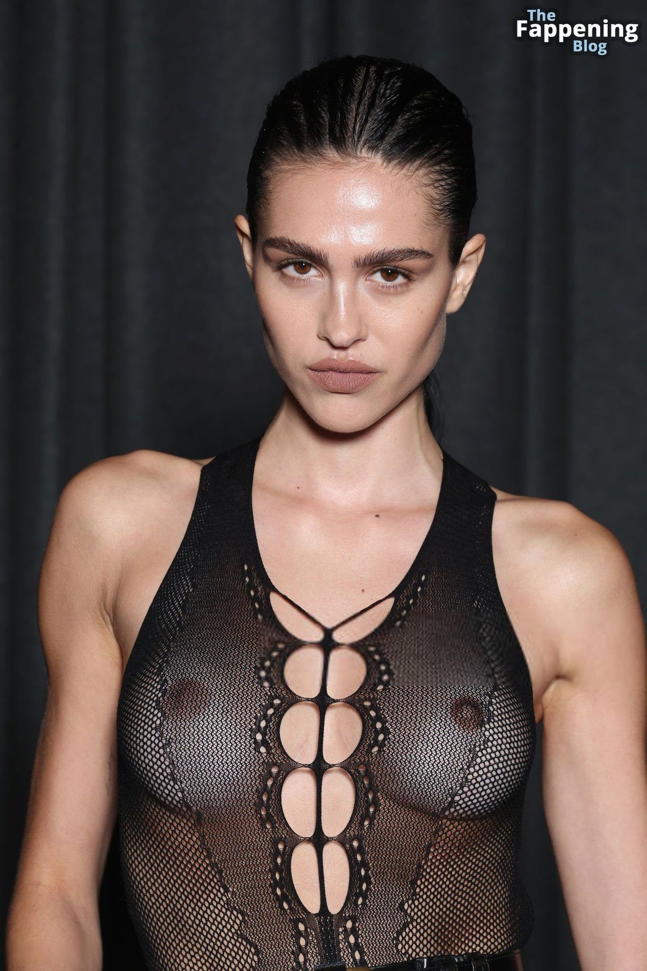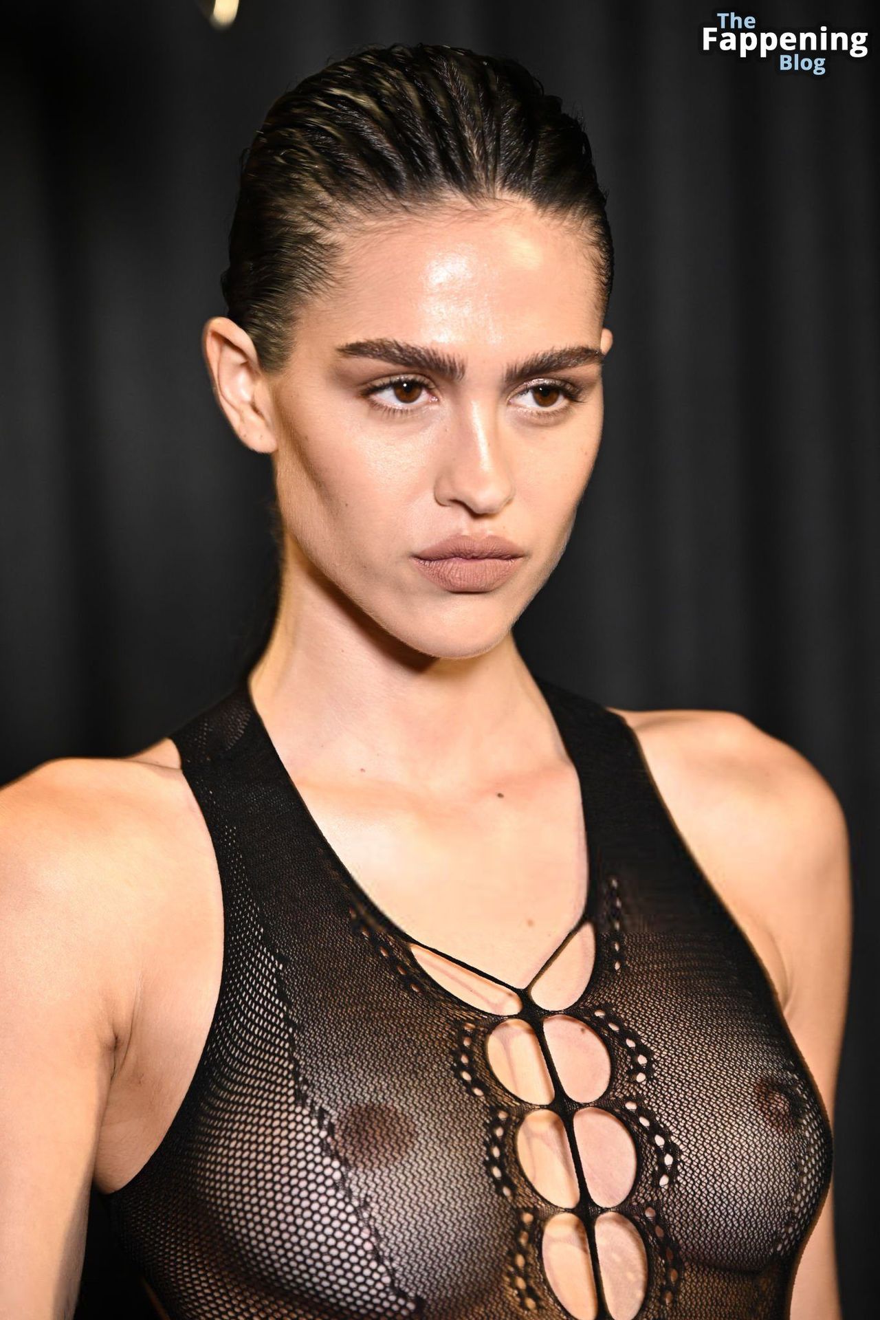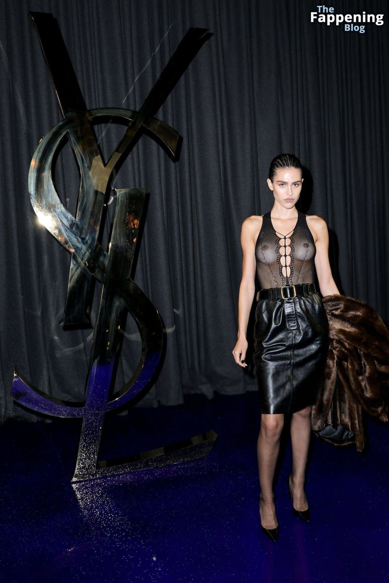 Amelia Gray Hamlin impresiona con un top transparente y translúcido, luciendo sus pequeños pezones en el desfile Saint Laurent RTW 2025 en París.