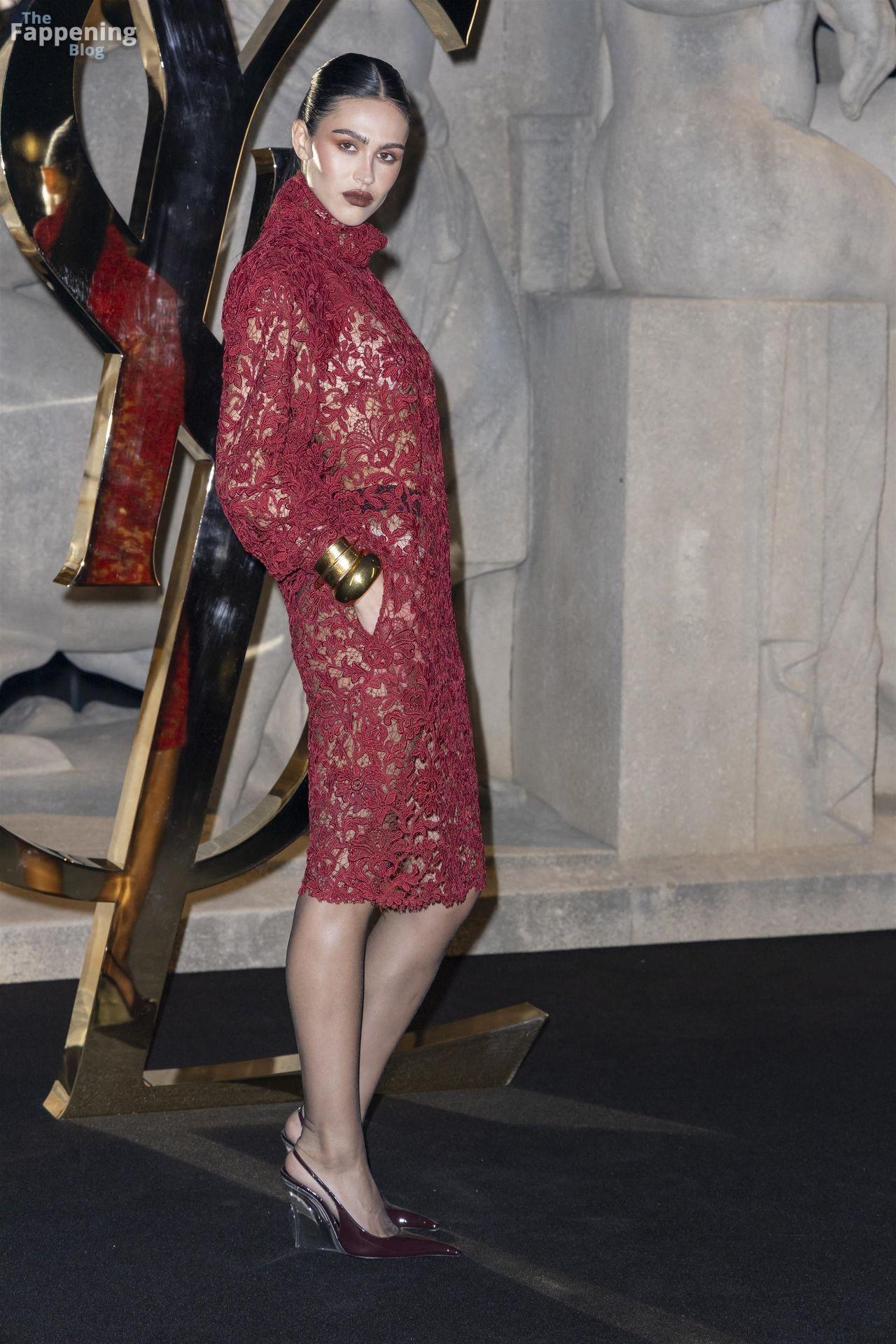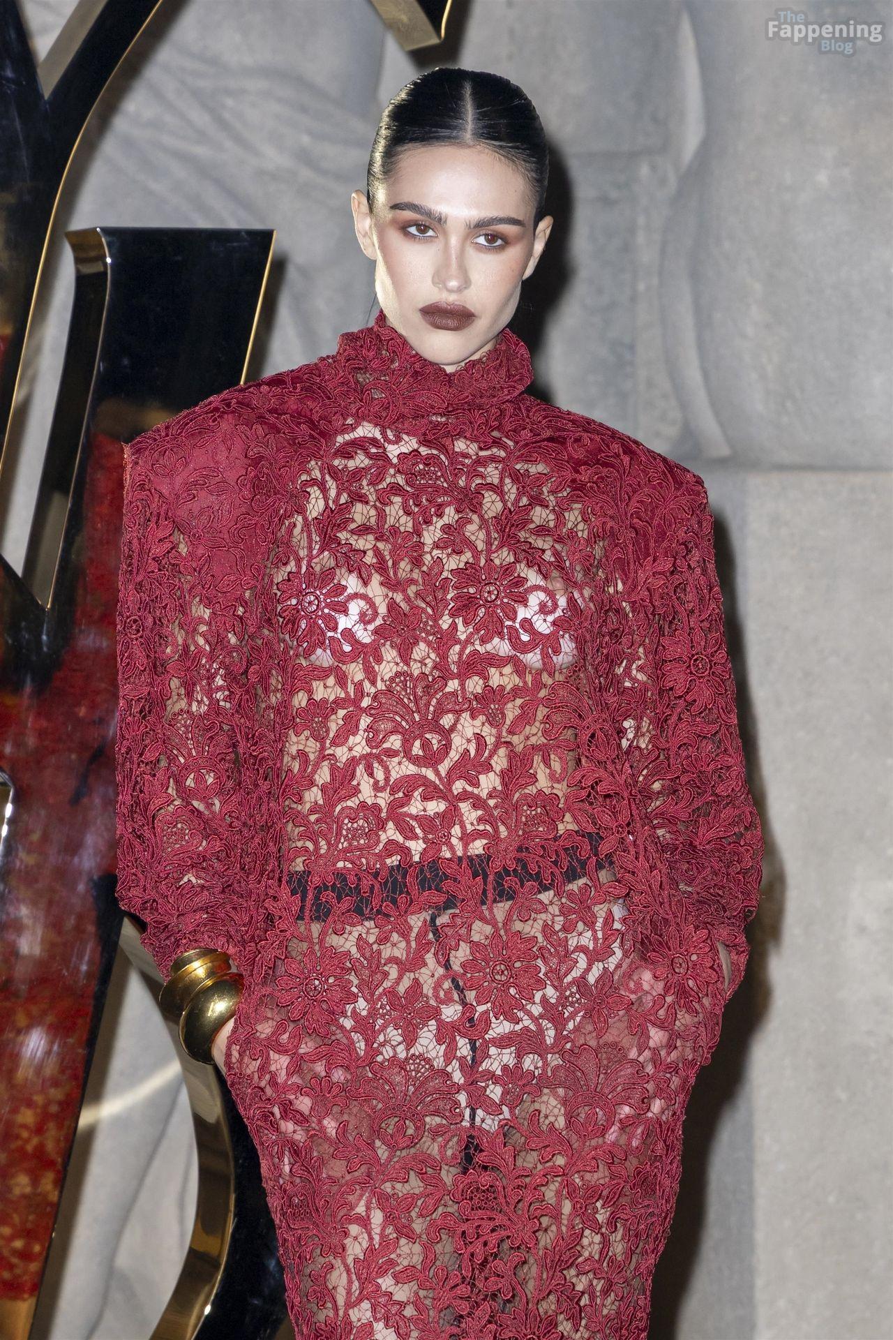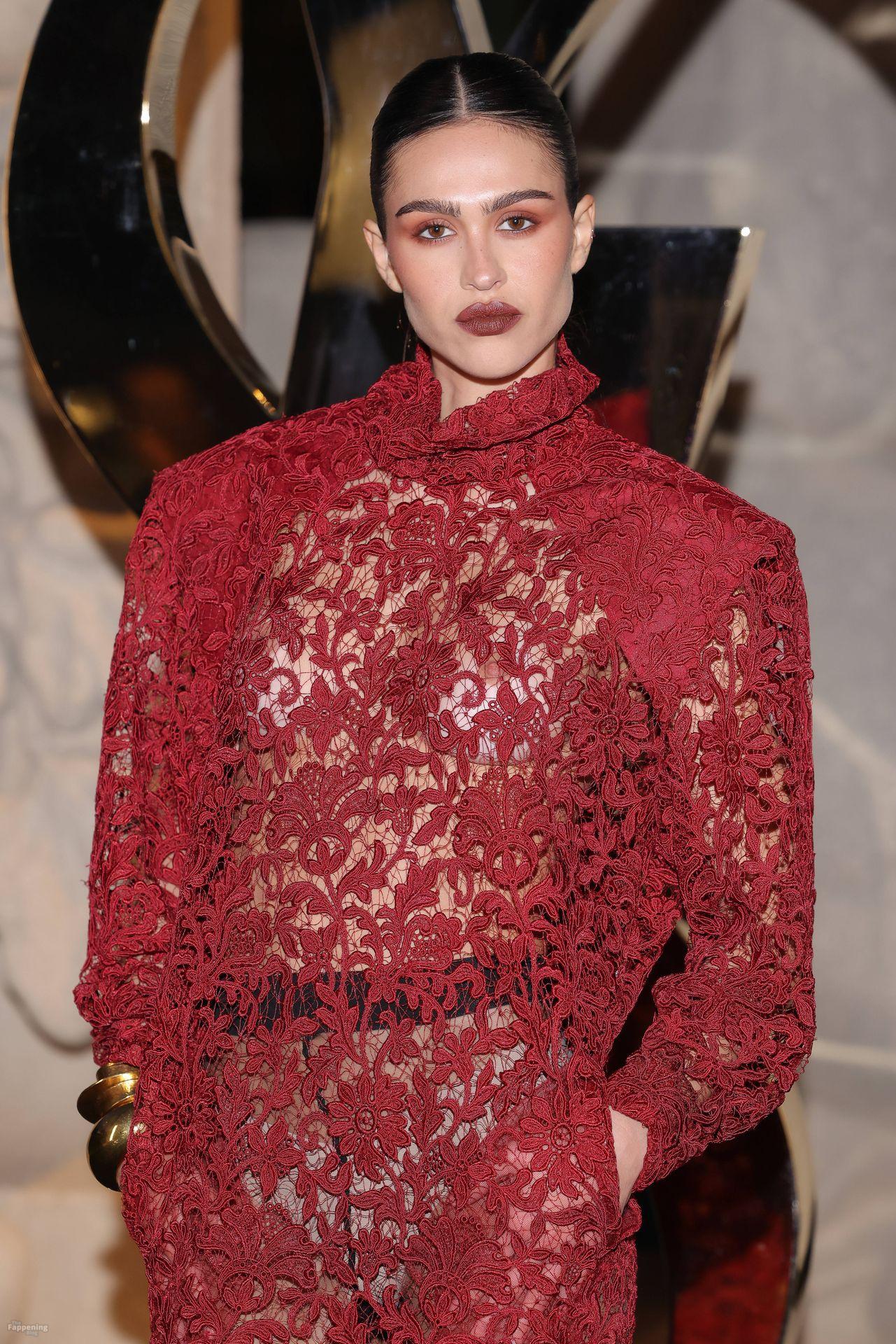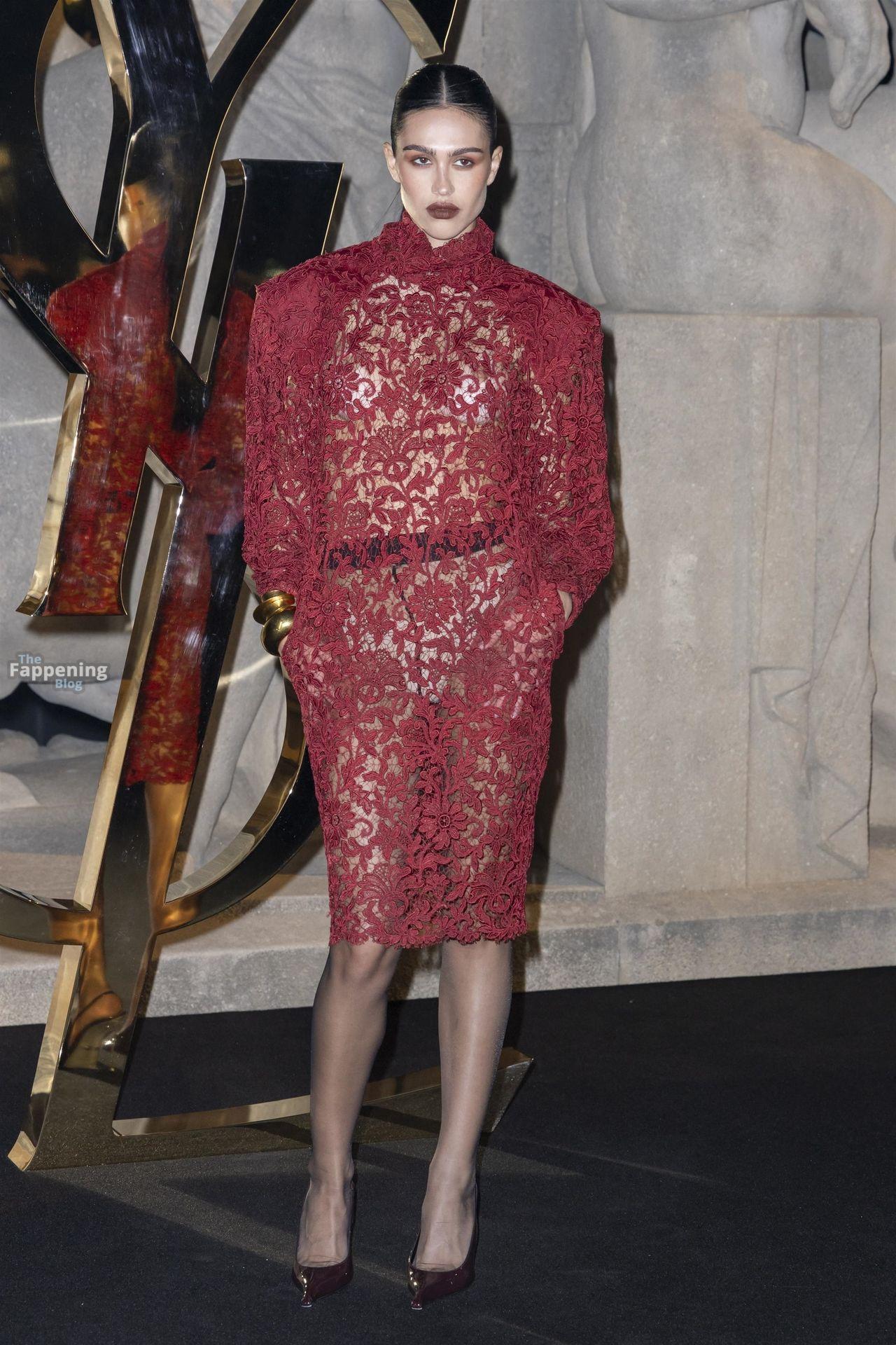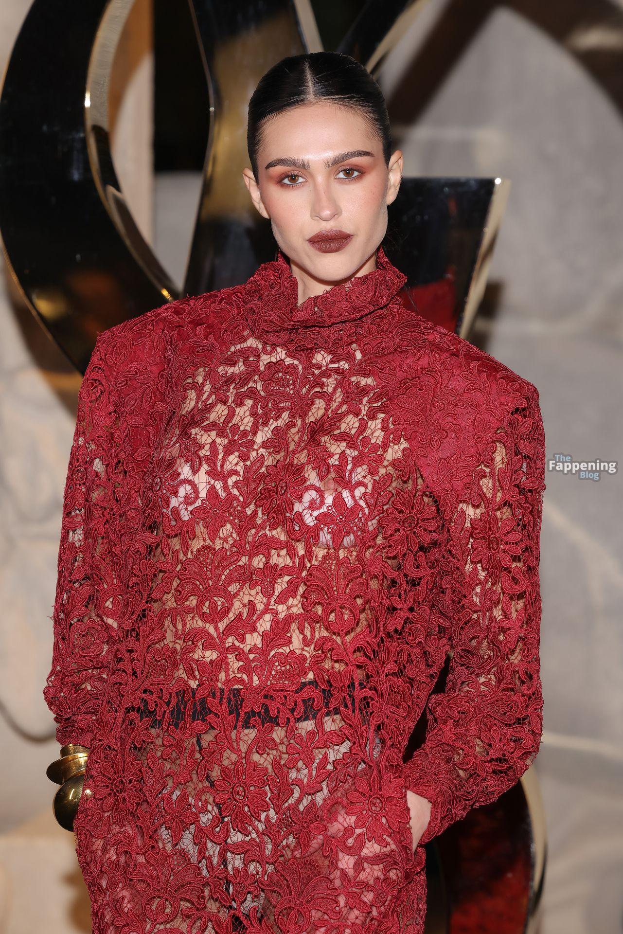 Amelia Gray Hamlin es vista con un vestido rojo transparente mientras asiste al desfile de Saint Laurent Womenswear Primavera/Verano 2026 como parte de la Semana de la Moda de París.