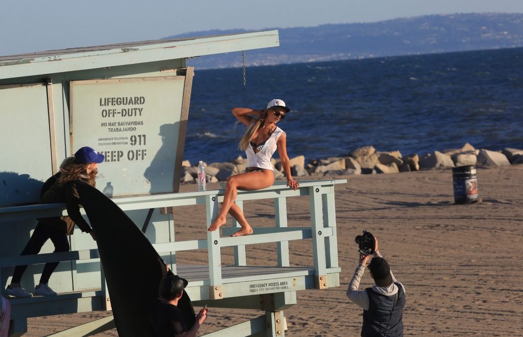 Modelo australiana con busto, Amy Lee Summers (26), desafía el calor en Los Ángeles y muestra su sexy cuerpo en bikini en el set de una sesión de fotos para 138 Water en Malibu, 31/08/2017.