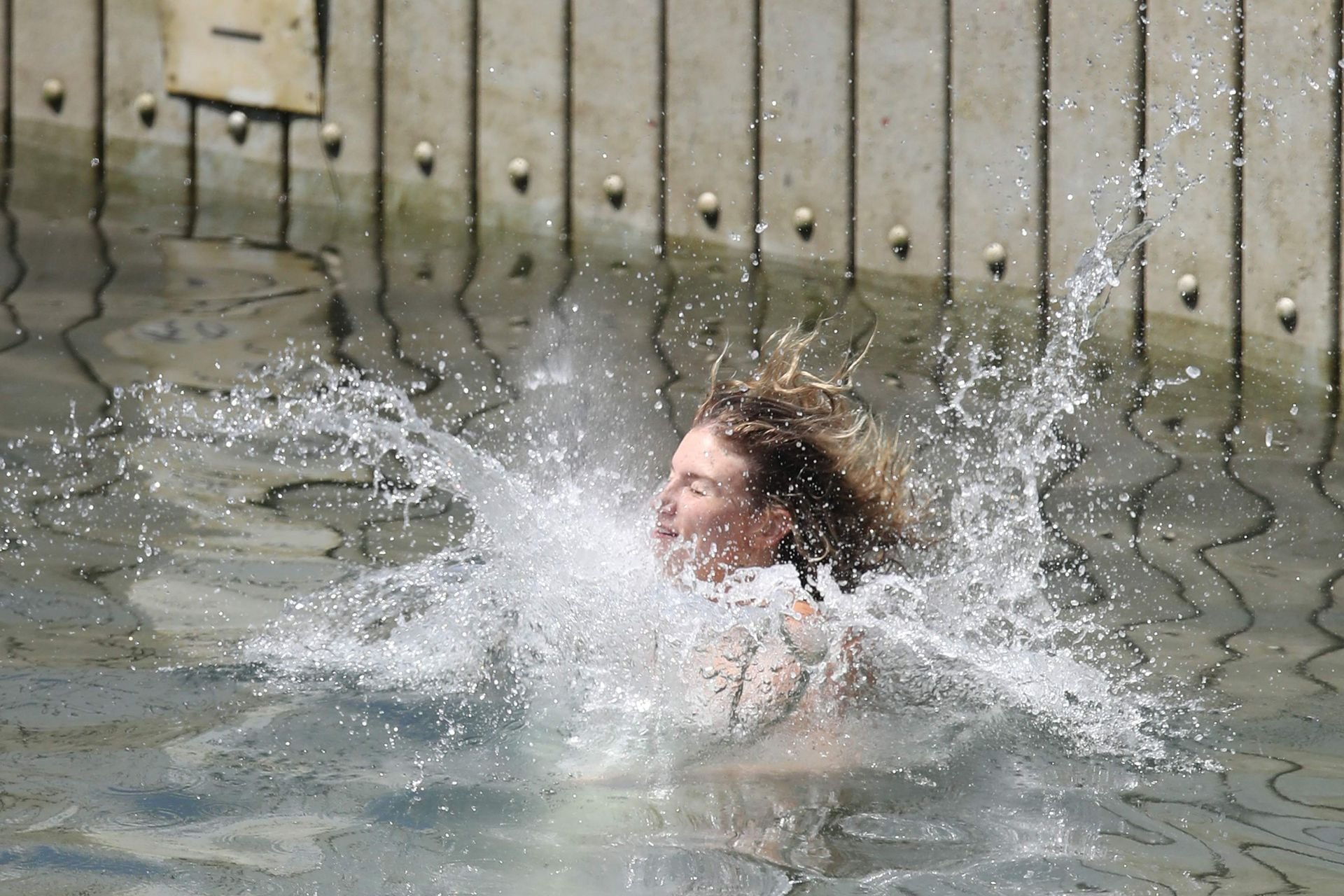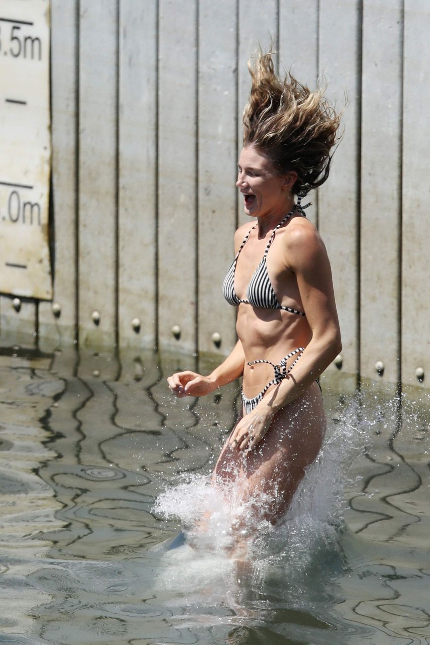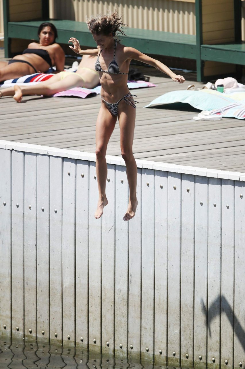 La modelo y saltadora de altura Amy Pejkovic (25) muestra su sexy cuerpo delgado con un bikini a rayas en el puerto de Sídney (diciembre de 2018).
