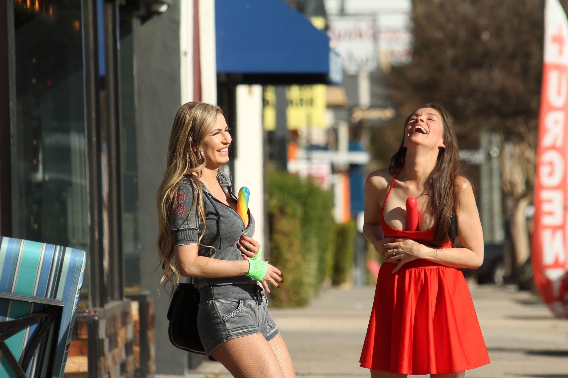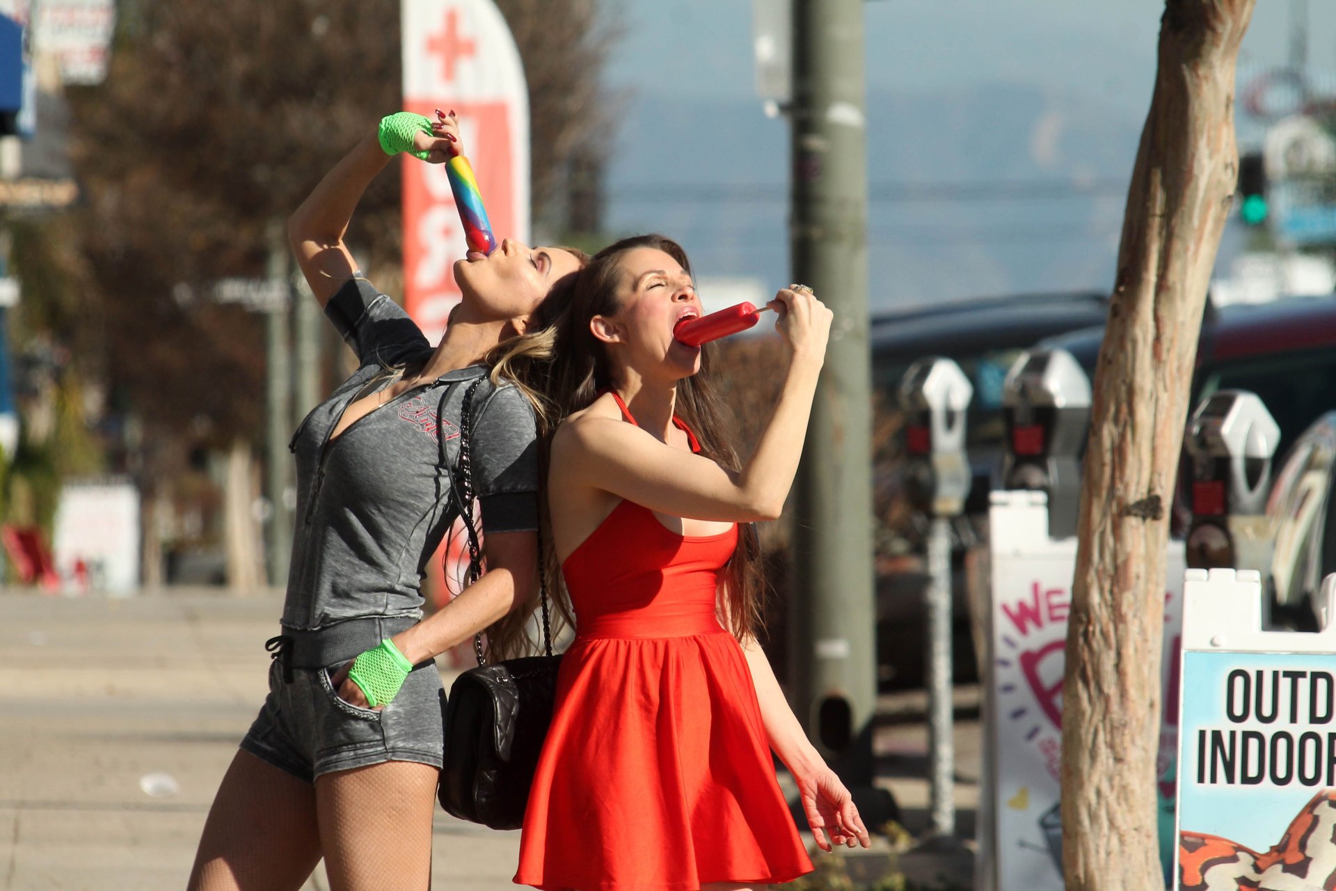 La Playmate brasileña Ana Braga y la actriz de “Baywatch” Alicia Arden posan para los paparazzi cuando son captadas saliendo de una boutique erótica disfrutando de las paletas que compraron en Studio City, 22/01/2018.
