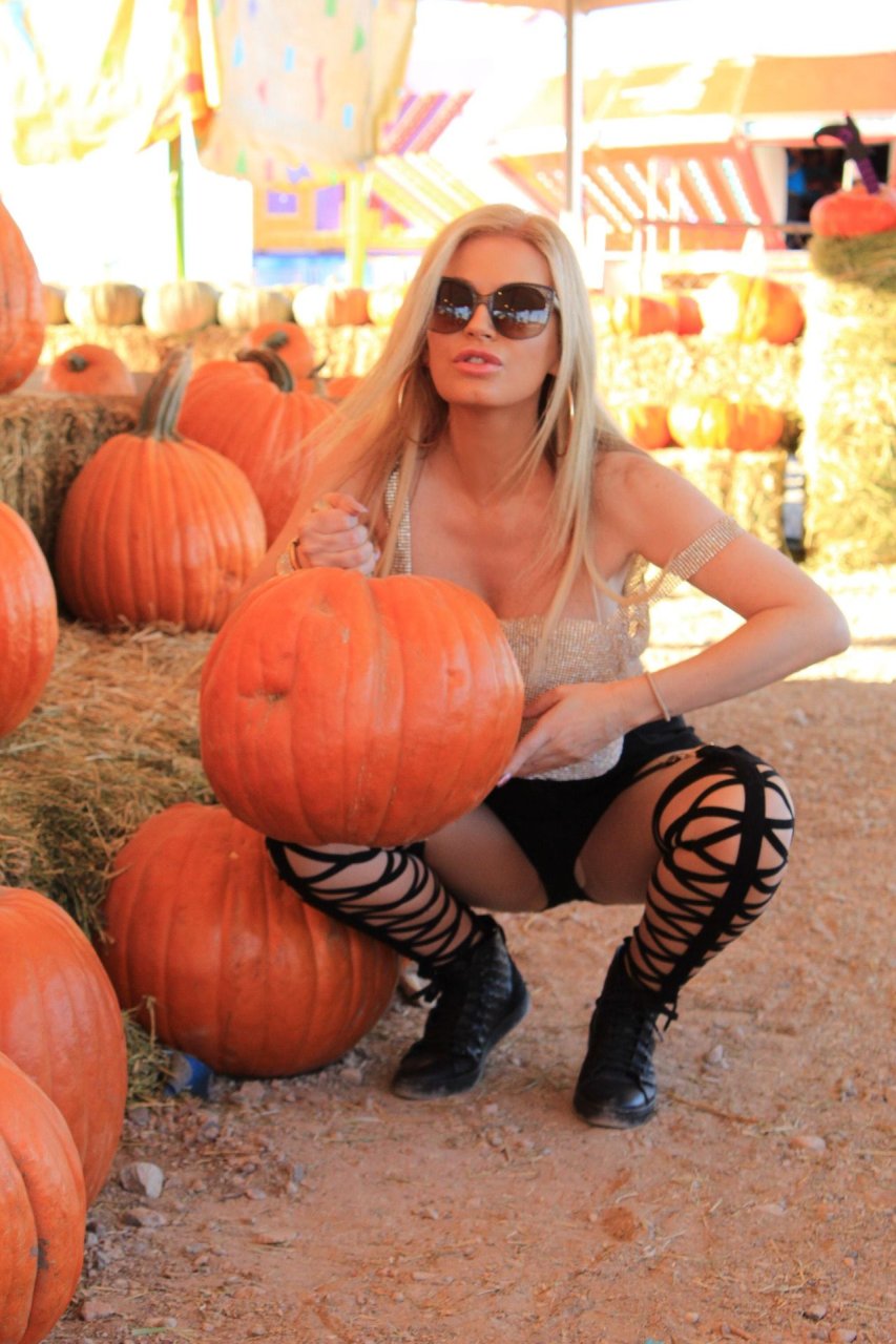 La playmate brasileña Ana Braga fue vista comprando calabazas y montando un carrusel en Los Ángeles, 29/10/2018. La rubia curvilínea mostró su sexy trasero posando con un atuendo sexy.