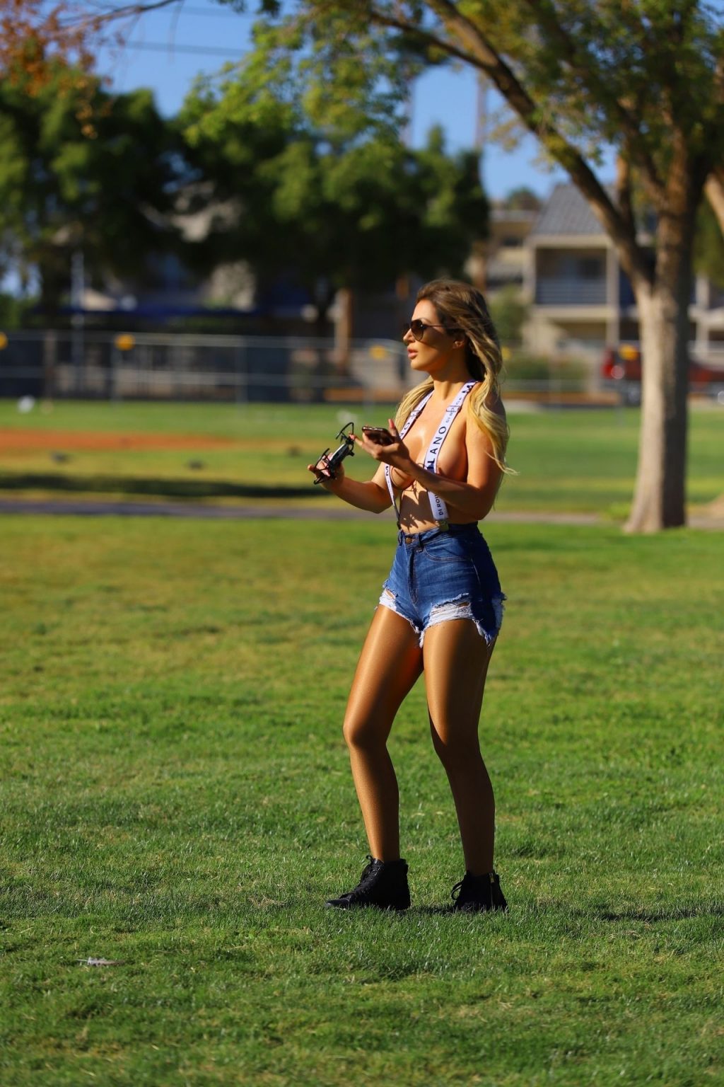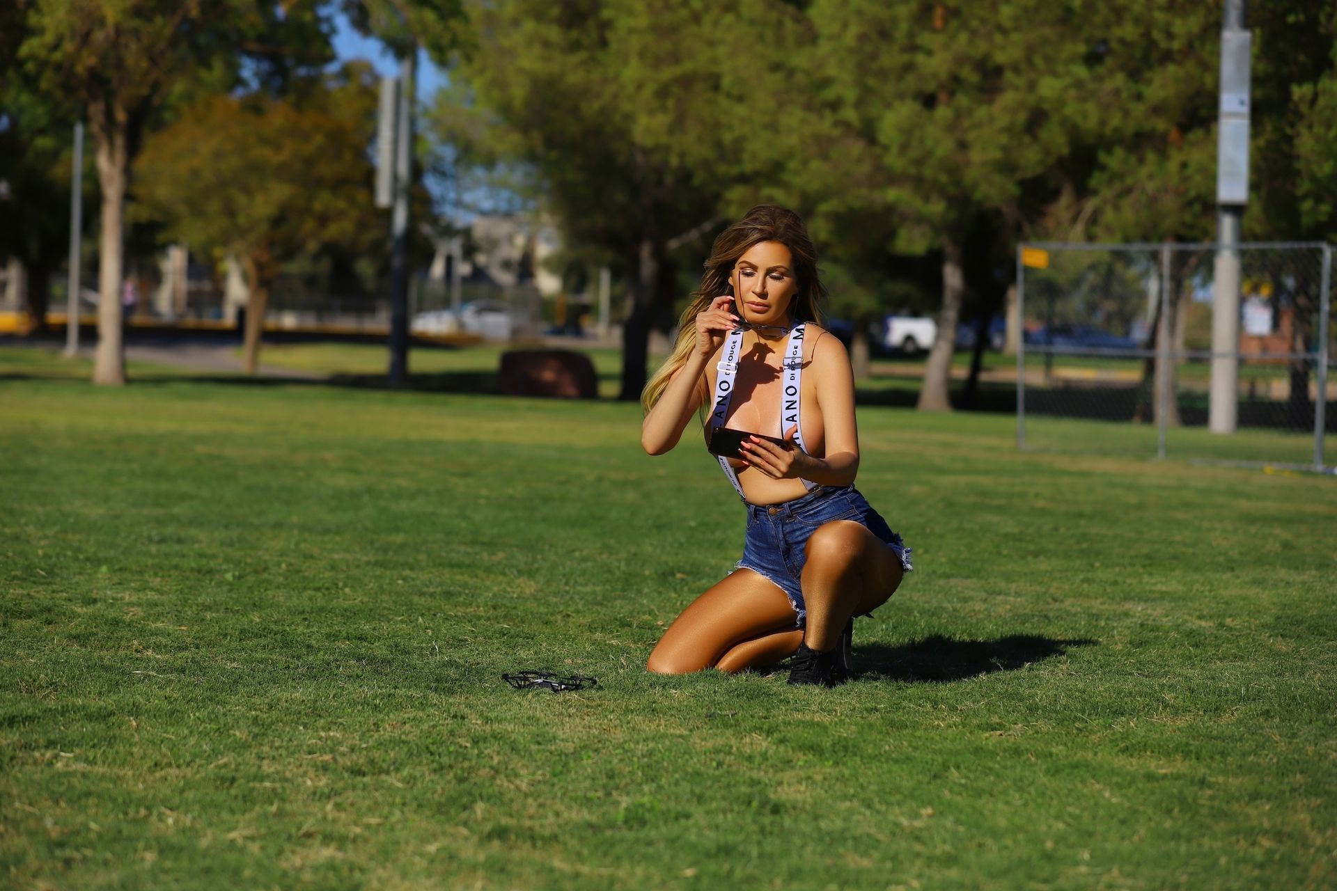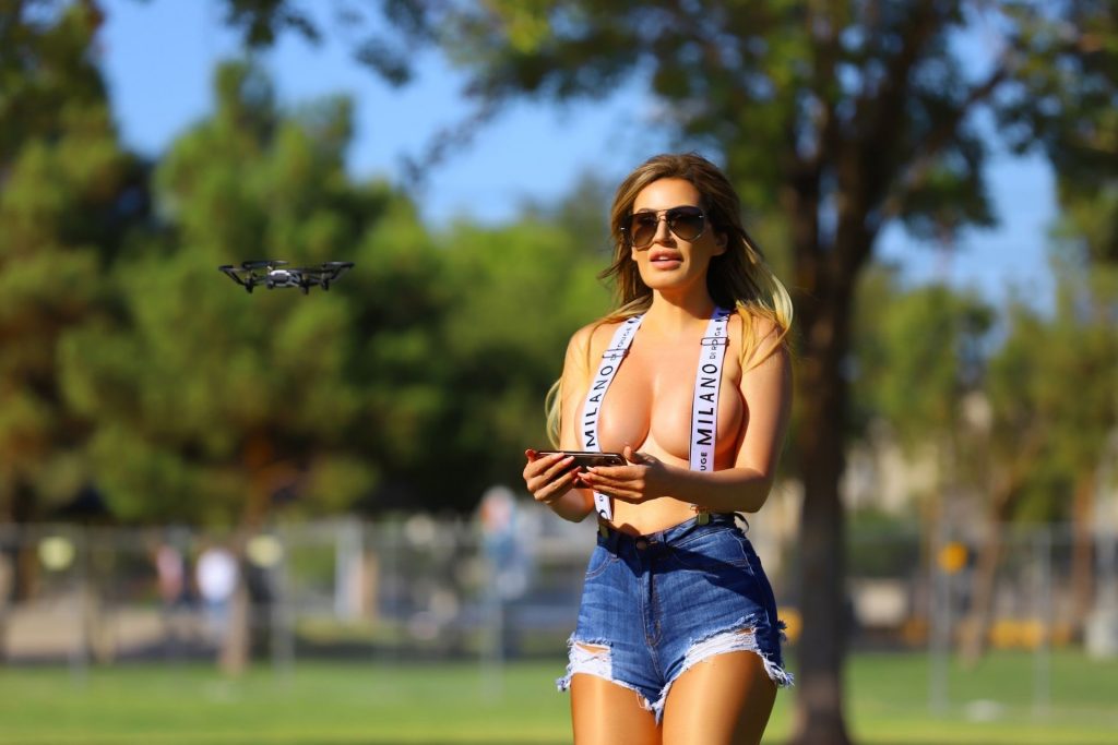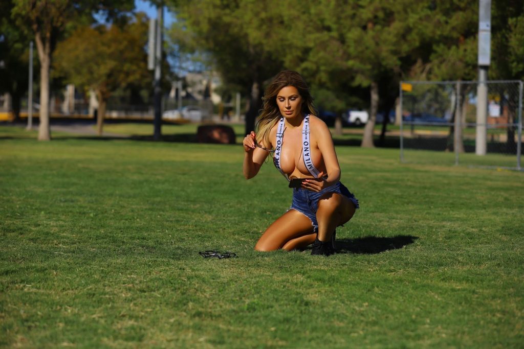 La modelo brasileña Ana Braga deja poco a la imaginación mientras se cubre solo con tirantes mientras juega con drones en el parque – Los Ángeles, 18/11/2019.