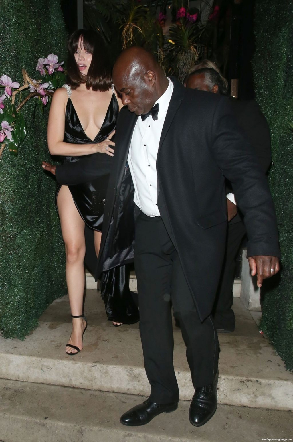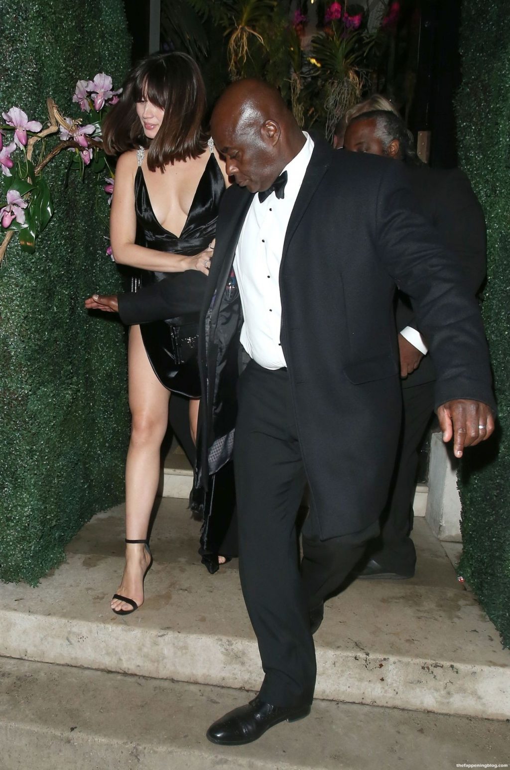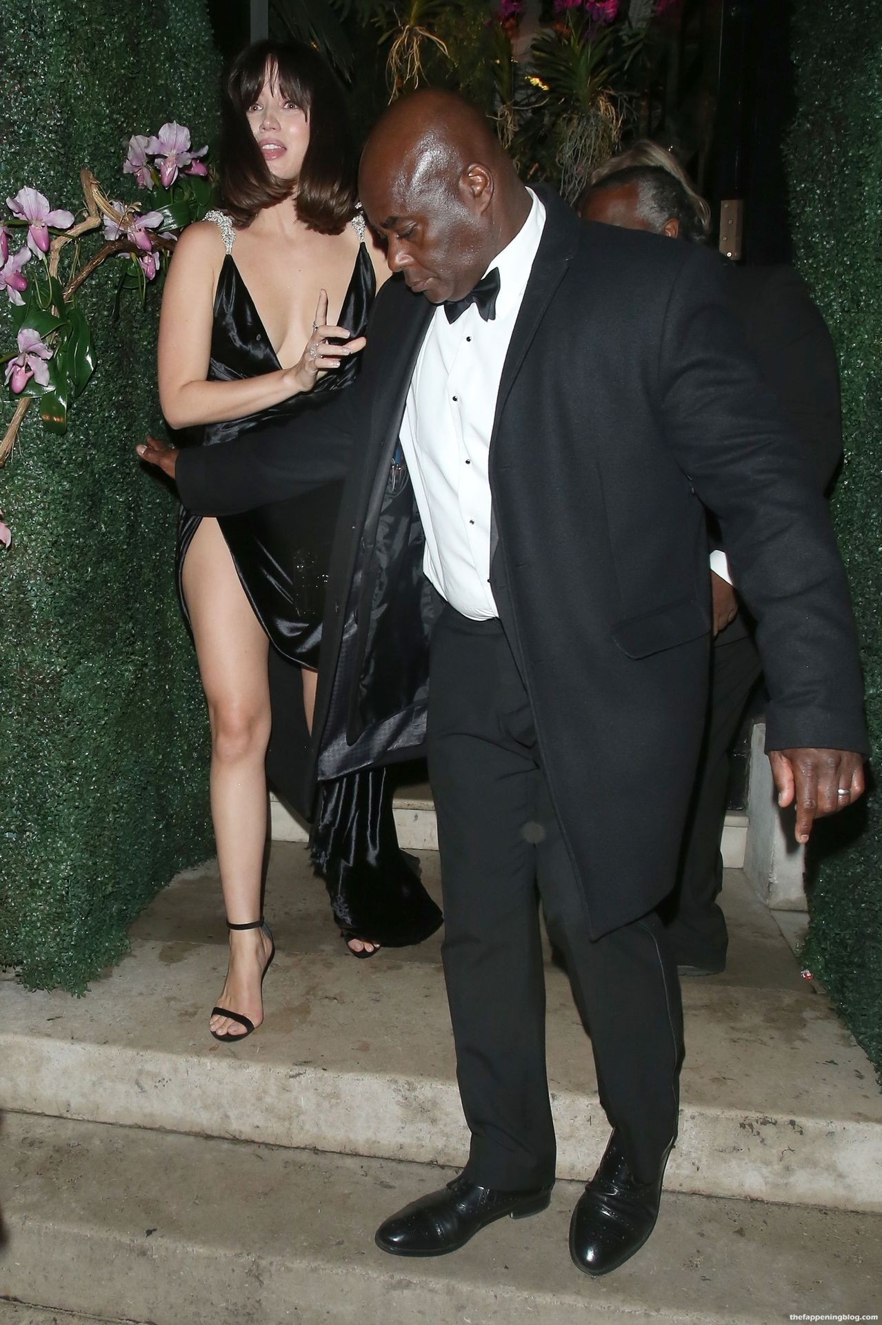Fue sostenida por su guardaespaldas cuando casi se cae por unas escaleras al salir del club privado Annabels con su revelador vestido negro LBD.