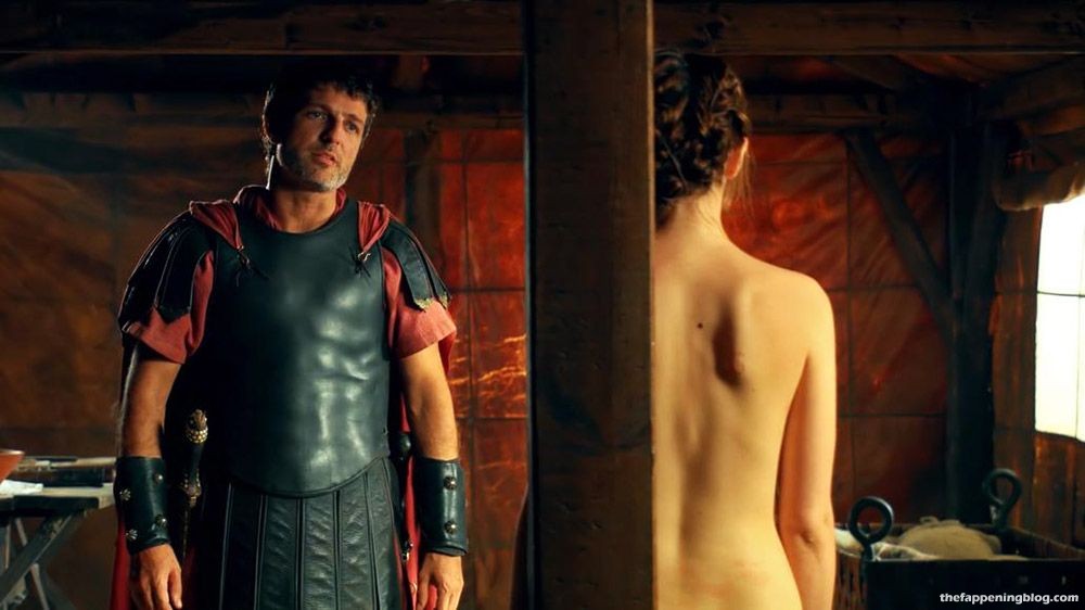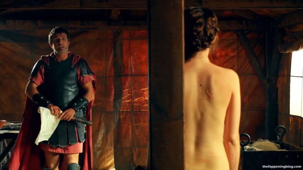 Then Ana de Armas is standing naked in front of a wooden post showing her bareback from behind. She talks with a guy for a while until he turns her around and starts smacking her ass with a club with cloth wrapped around it. Finally, she cries out and holds onto the pole.