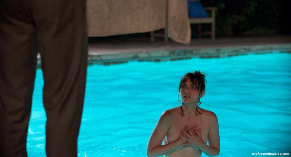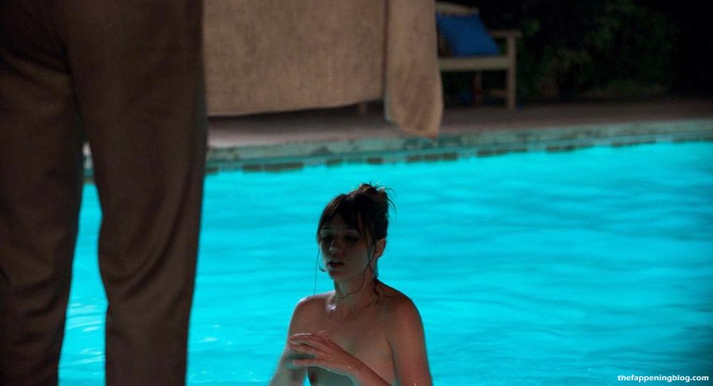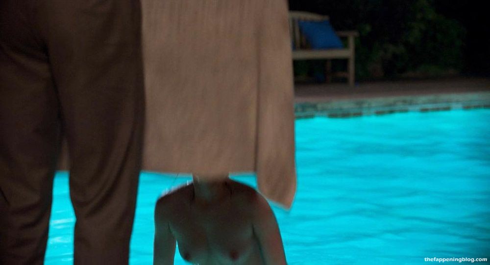 Then hottie Ana de Armas is swimming topless across a pool. Her nude boobs are here as she is getting out of the pool. The guy is standing at the edge, holding a towel. She then covers up with her hands on her chest for a bit before dropping them and standing up to wrap them up in the towel.
